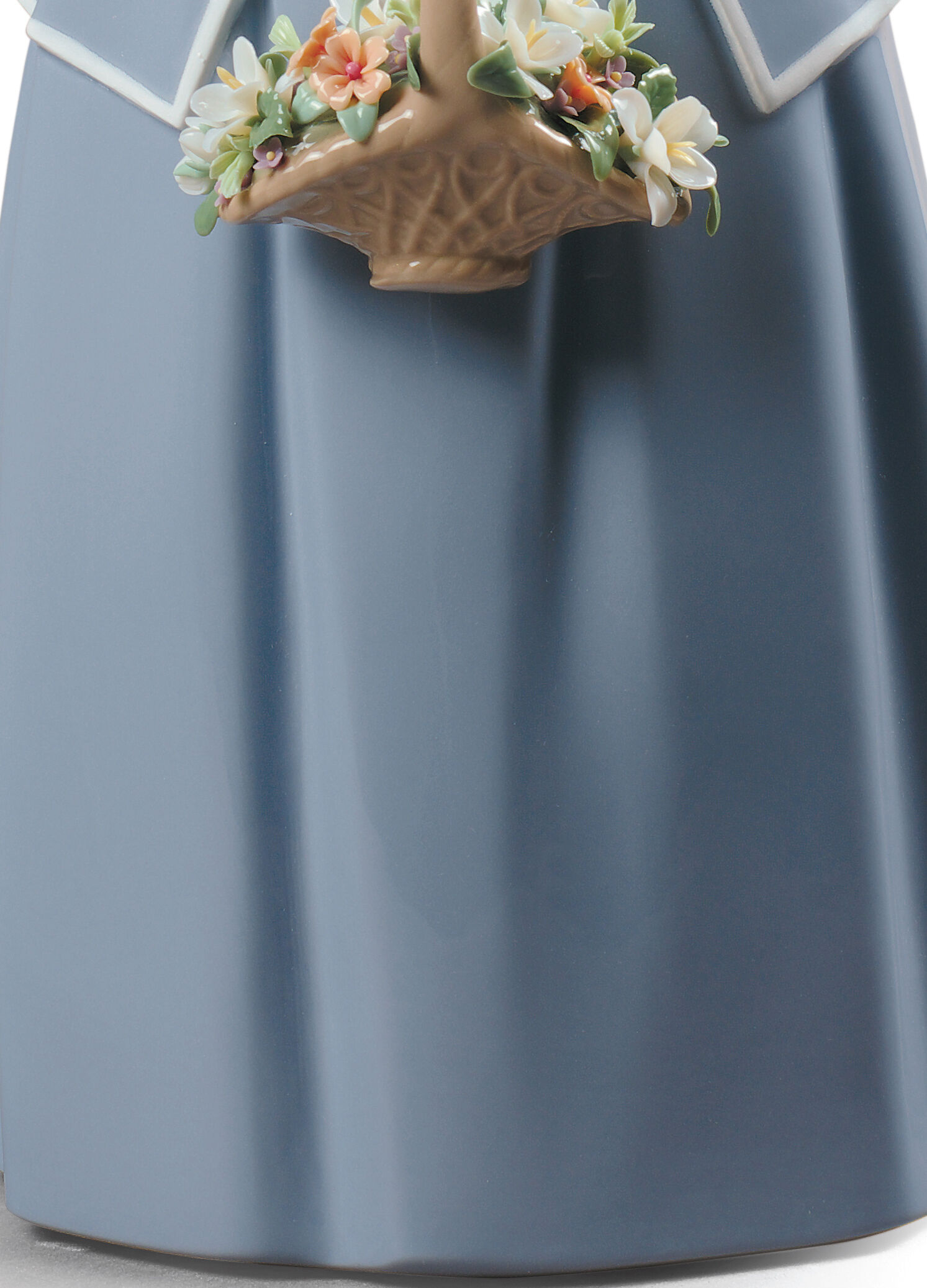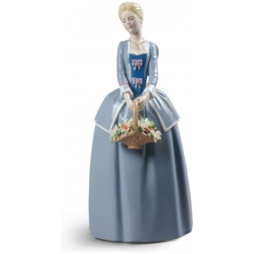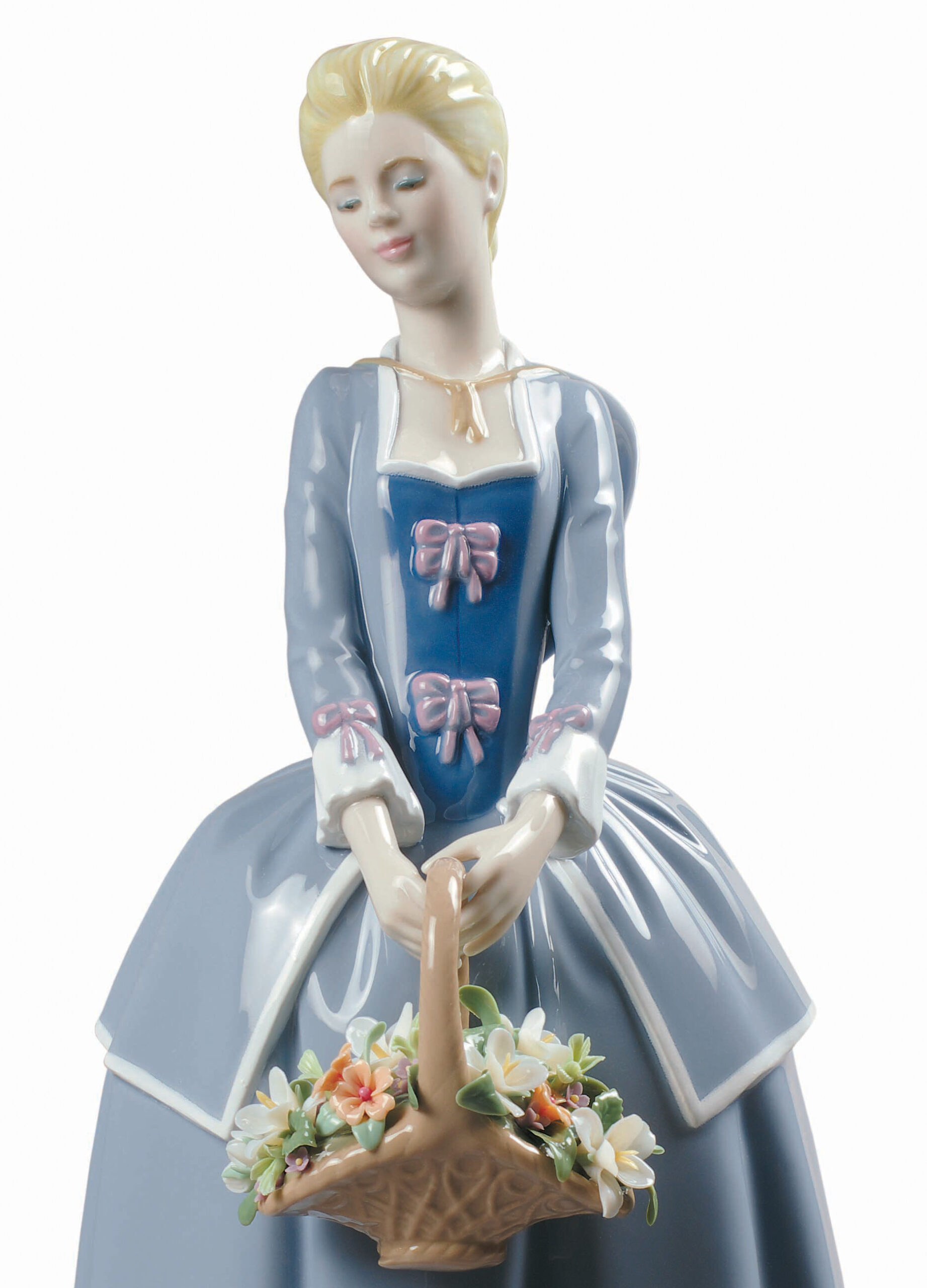 She is beautiful and elegant. She is one of LladrĂ³’s classic romantic ladies, who inhabit an idealised and enchanting world, as delicate and perfect as the flowers that adorn her basket. A glossy porcelain piece, decorated in pastel colours, ideal as a gift, collectible or decoration.