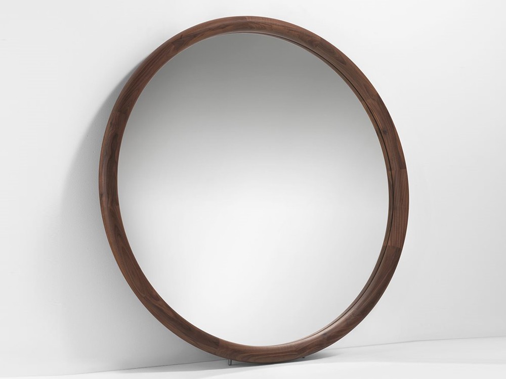 The Giove mirror features an circular frame crafted from solid canaletta walnut.