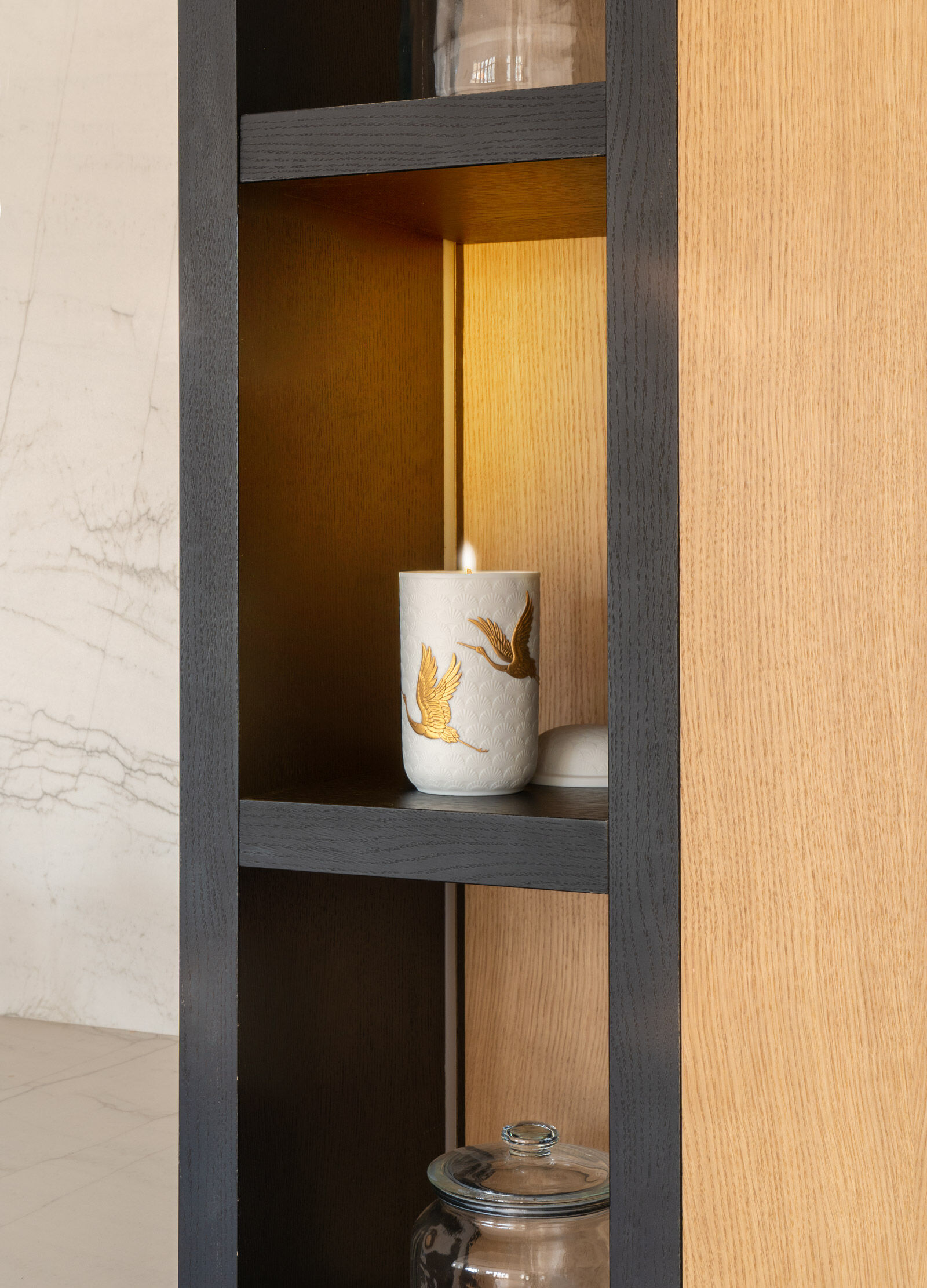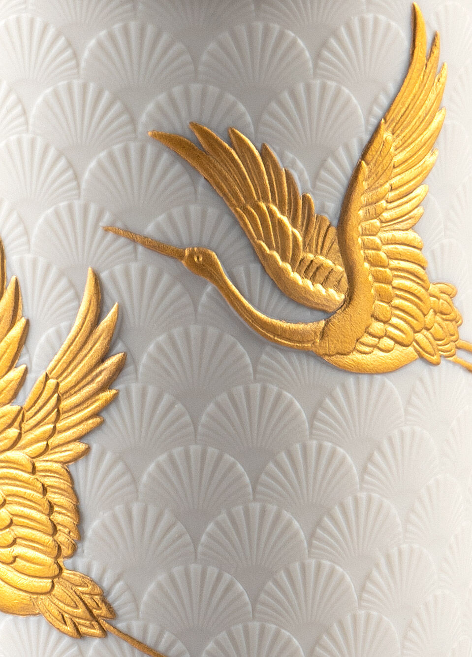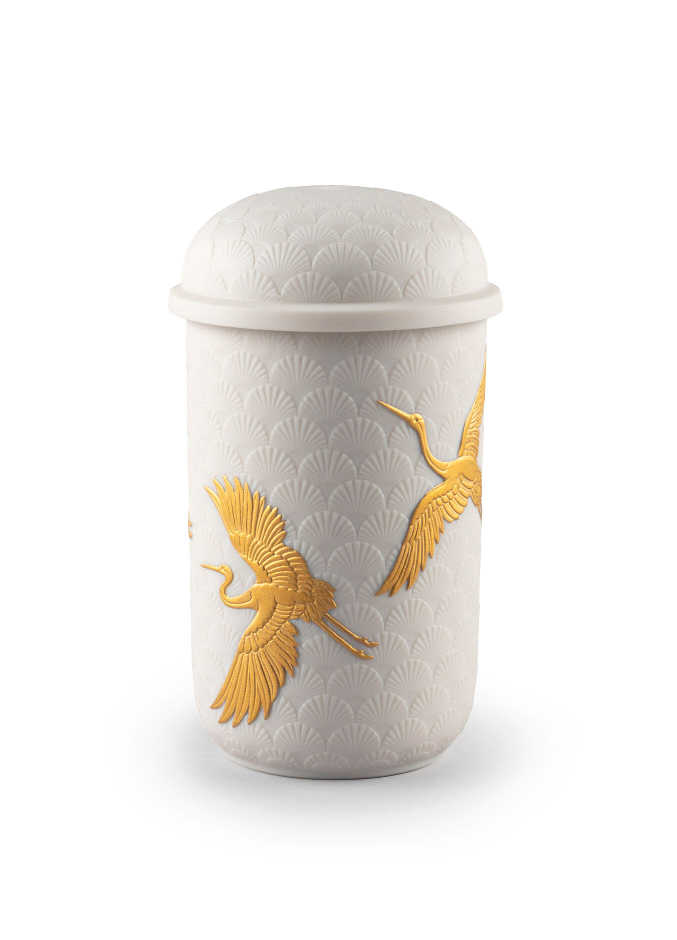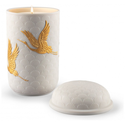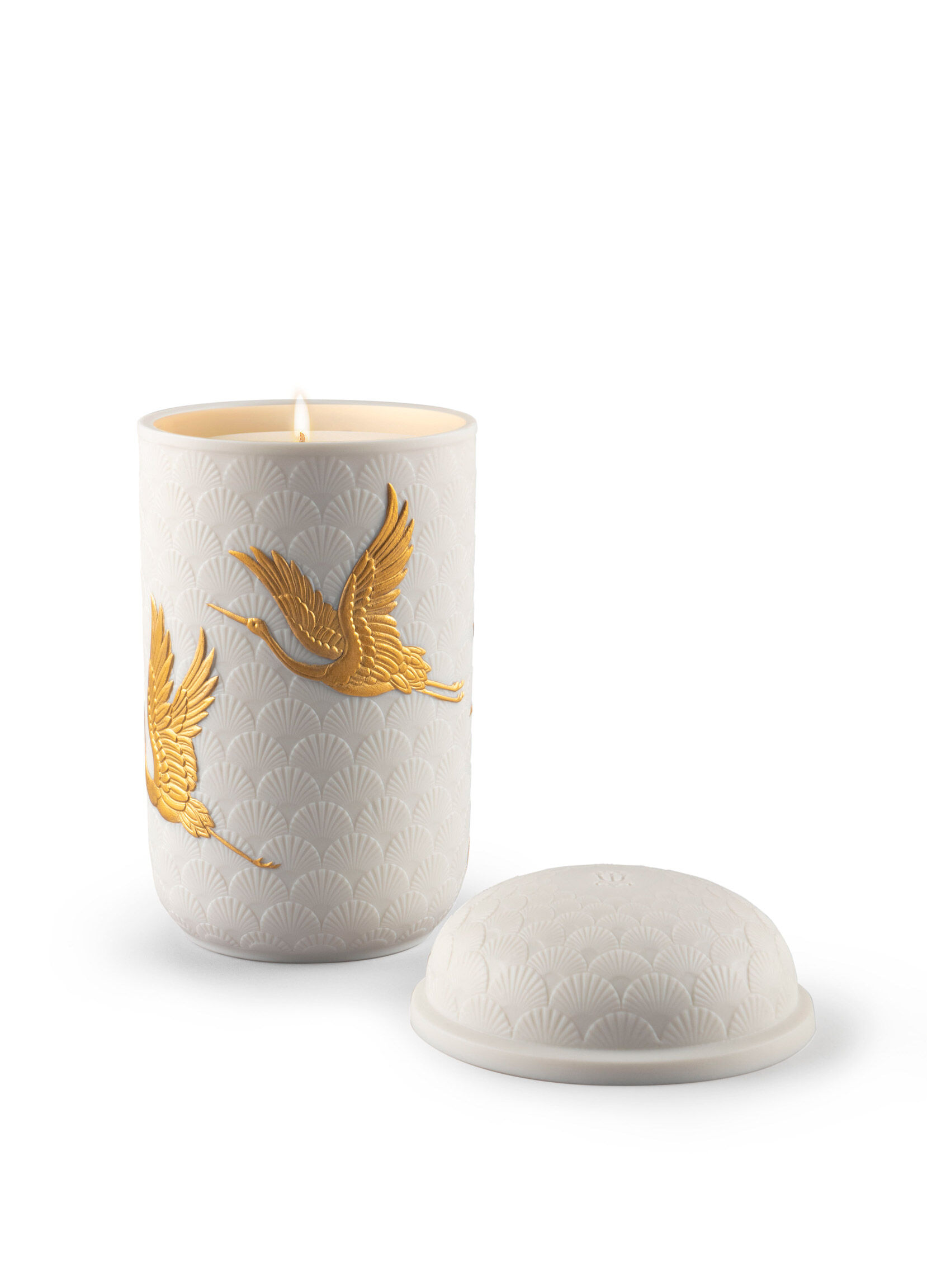 “This candle, made in matte white porcelain, is decorated with golden luster which brings out the cranes etched on the surface. Inside it contains 350 gr of natural wax with the Redwood Fire scent, a fragrance with notes of violet, mimosa, sandalwood and cedar.
