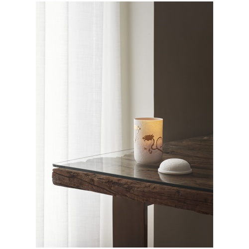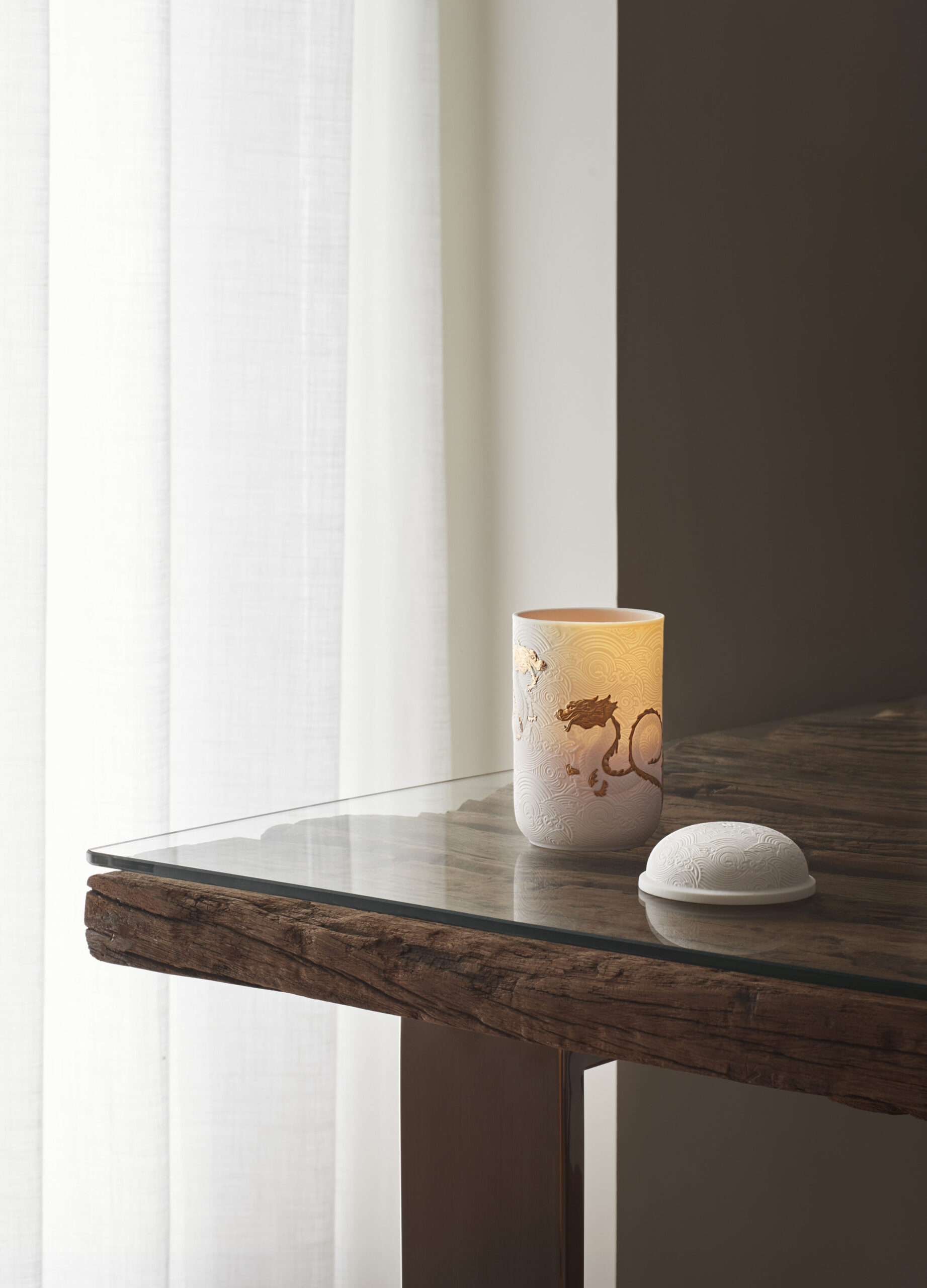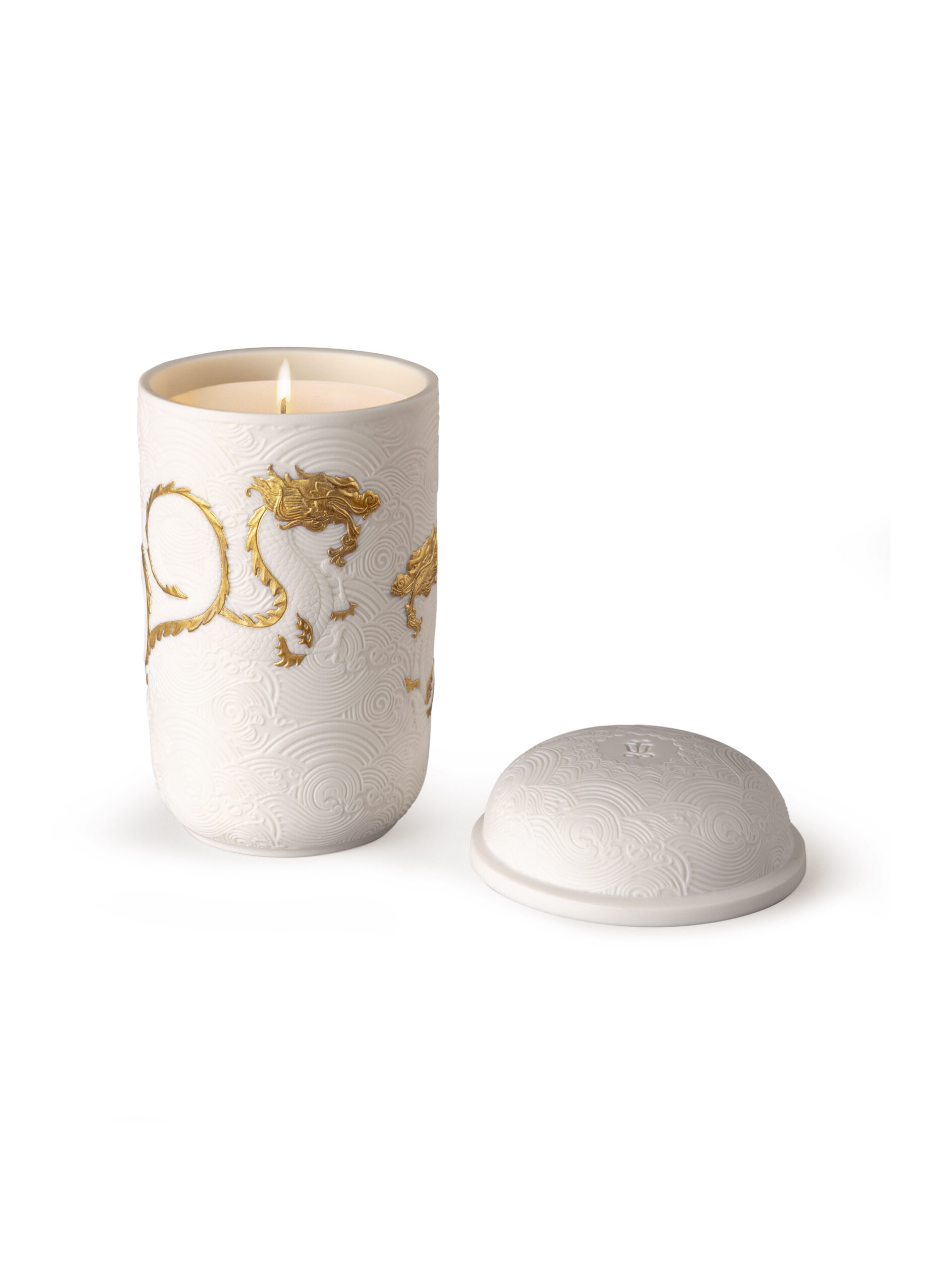 Made in white matte porcelain and decorated golden luster that enhances the figure of the dragons. It contains 350 gr of natural soy, mango and coco wax scented with “Vanilla Scent”, a fragrance with citric notes and a fruity aroma with bergamot, tuberose, sandalwood and musk. The piece combines functionality and great decorative beauty. Ideal as a gift or for collectors. Handcrafted in Spain.