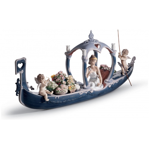 Venus, the goddess of love of classical mythology, takes a ride in a romantic gondola, attended by two lovely cupids. A piece of glossy porcelain, decorated in soft pastel colours and an exuberant variety of flowers, crafted petal by petal; perfect as a gift, to collect or as a decoration.