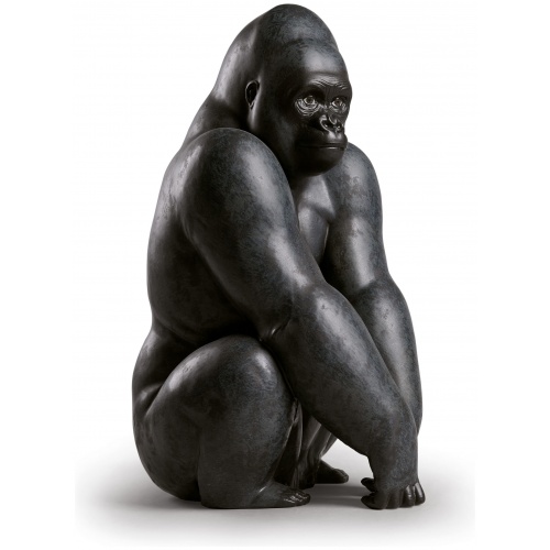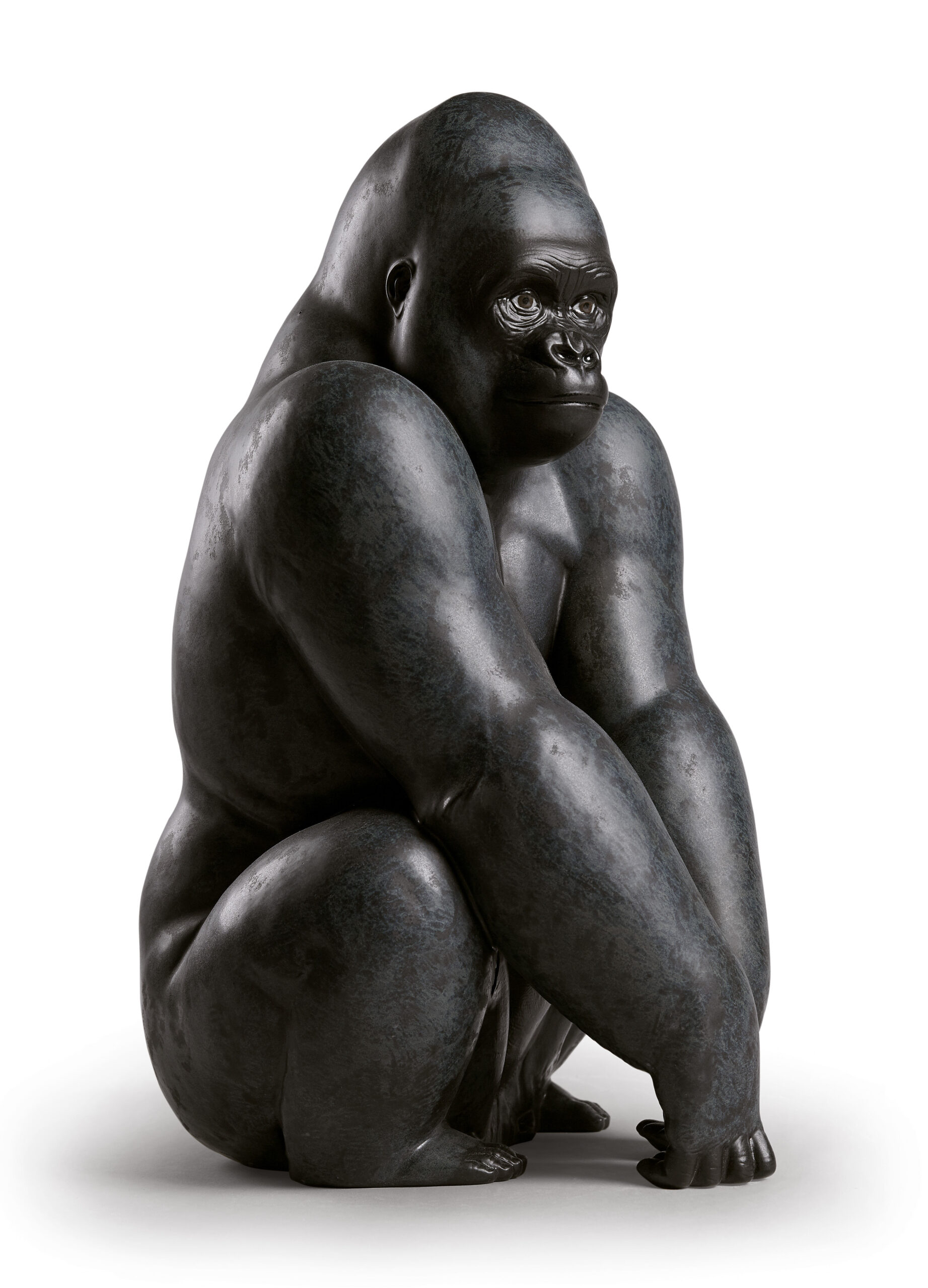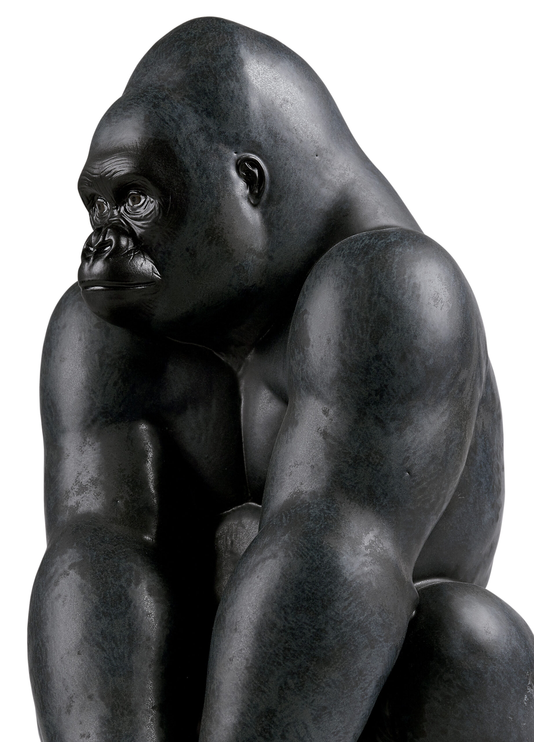 His impressive figure transports us to the mists of impenetrable rainforests, the last bastions of a pure nature that we want to preserve. So close to us and yet so different, the gorilla conveys feelings of dignity and strength, calm and power. Gorilla is a sculpture of rounded and stylised shapes that realistically reproduces the features and spirit of this splendid animal in stoneware, decorated with black enamels and satin finish with varied textures. A creation for lovers of animals and nature, handmade in Valencia, Spain.