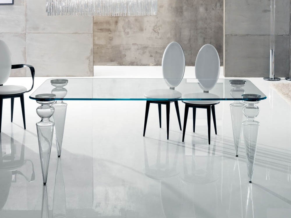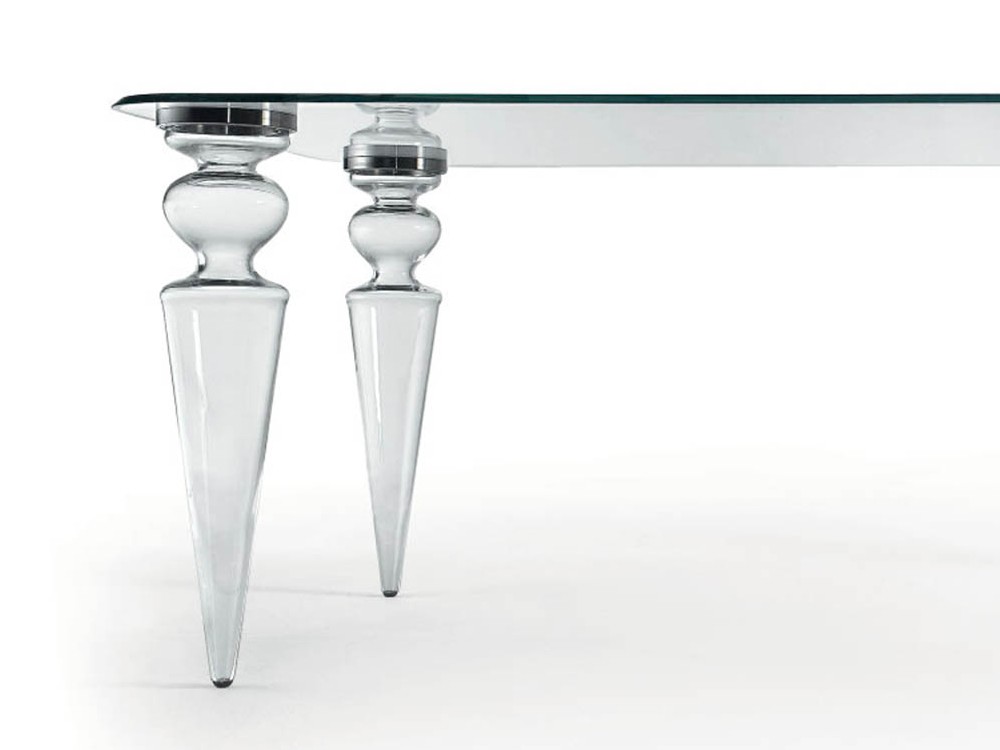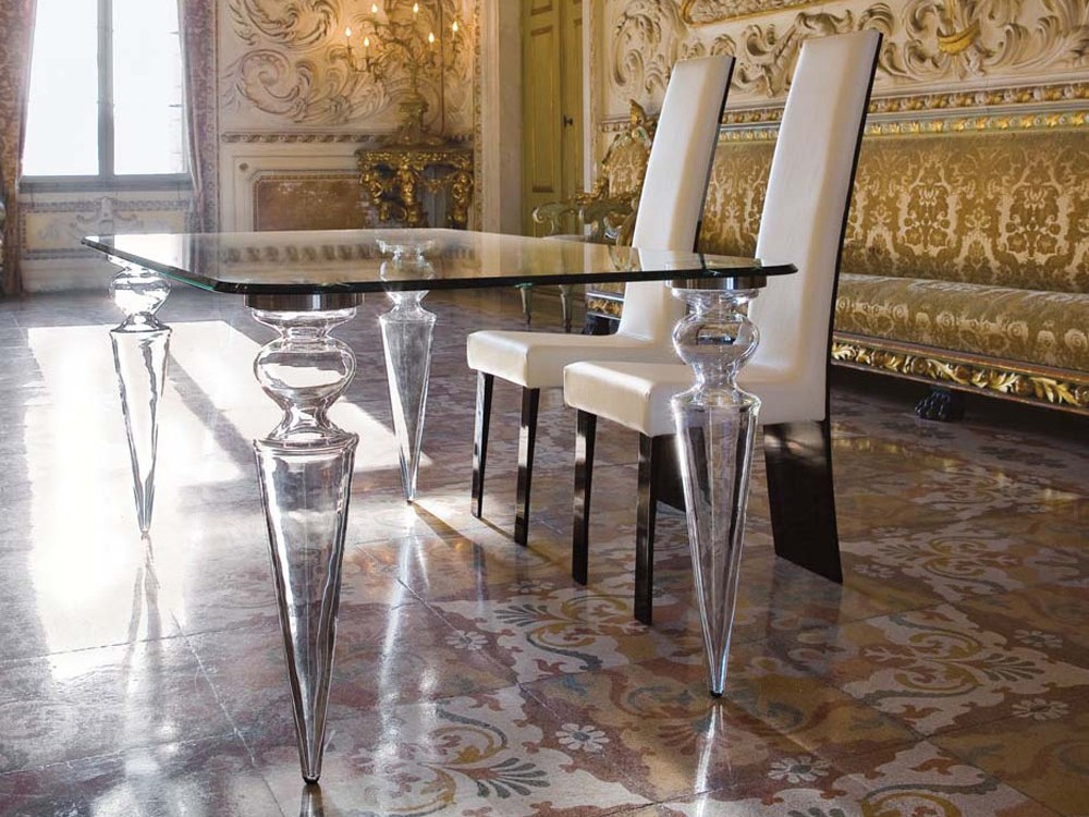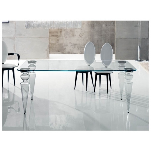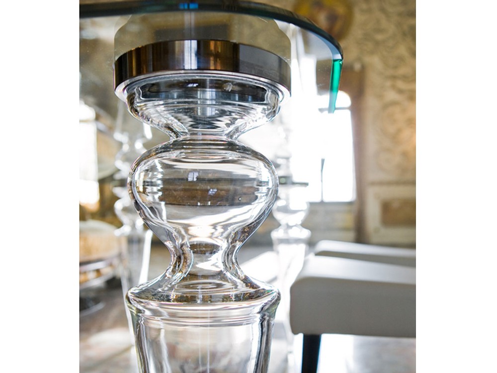 The elegant Gran Canal dining table features a glass top and smooth transparent Murano glass legs, which have been hand crafted making each leg unique.