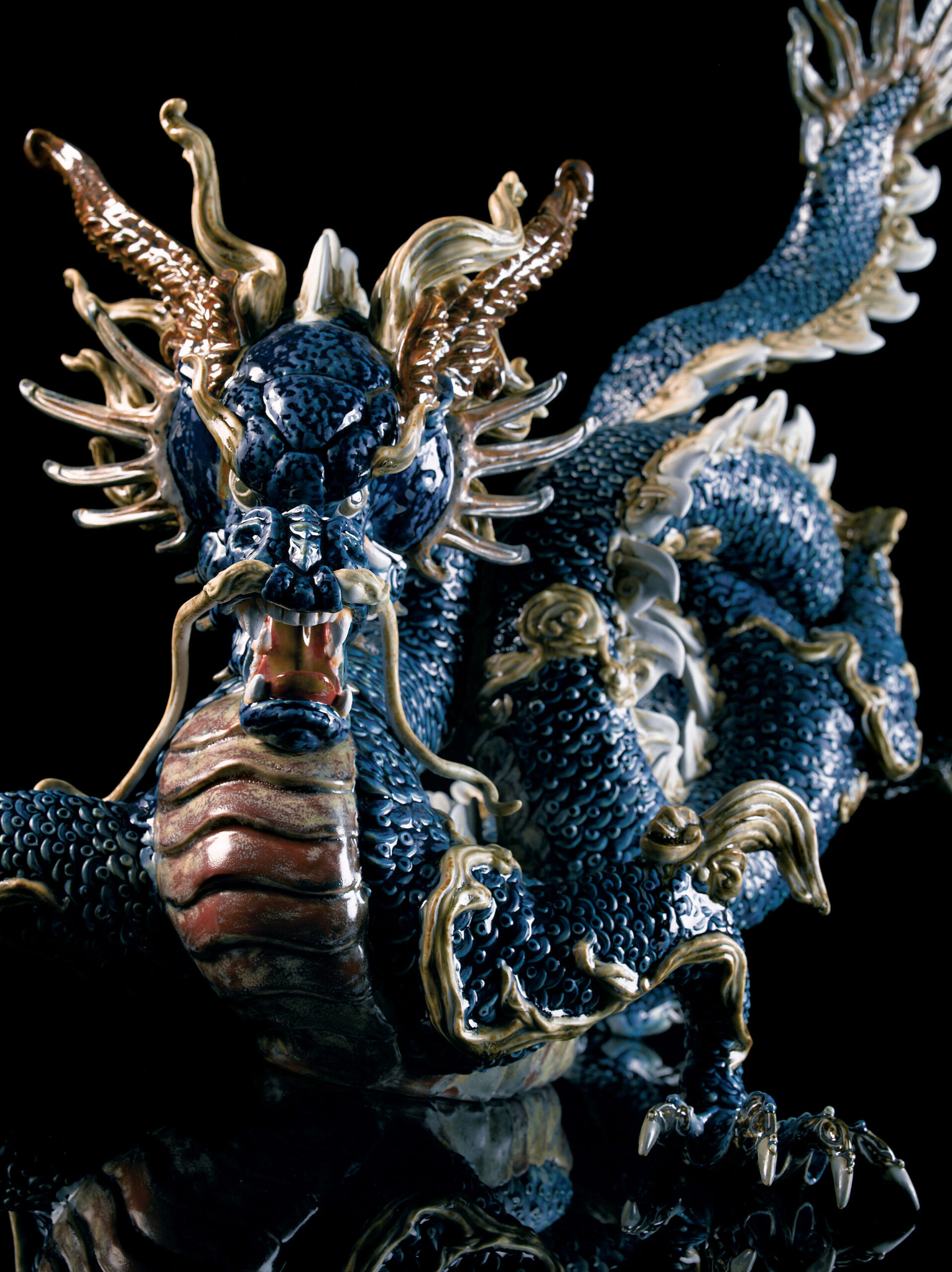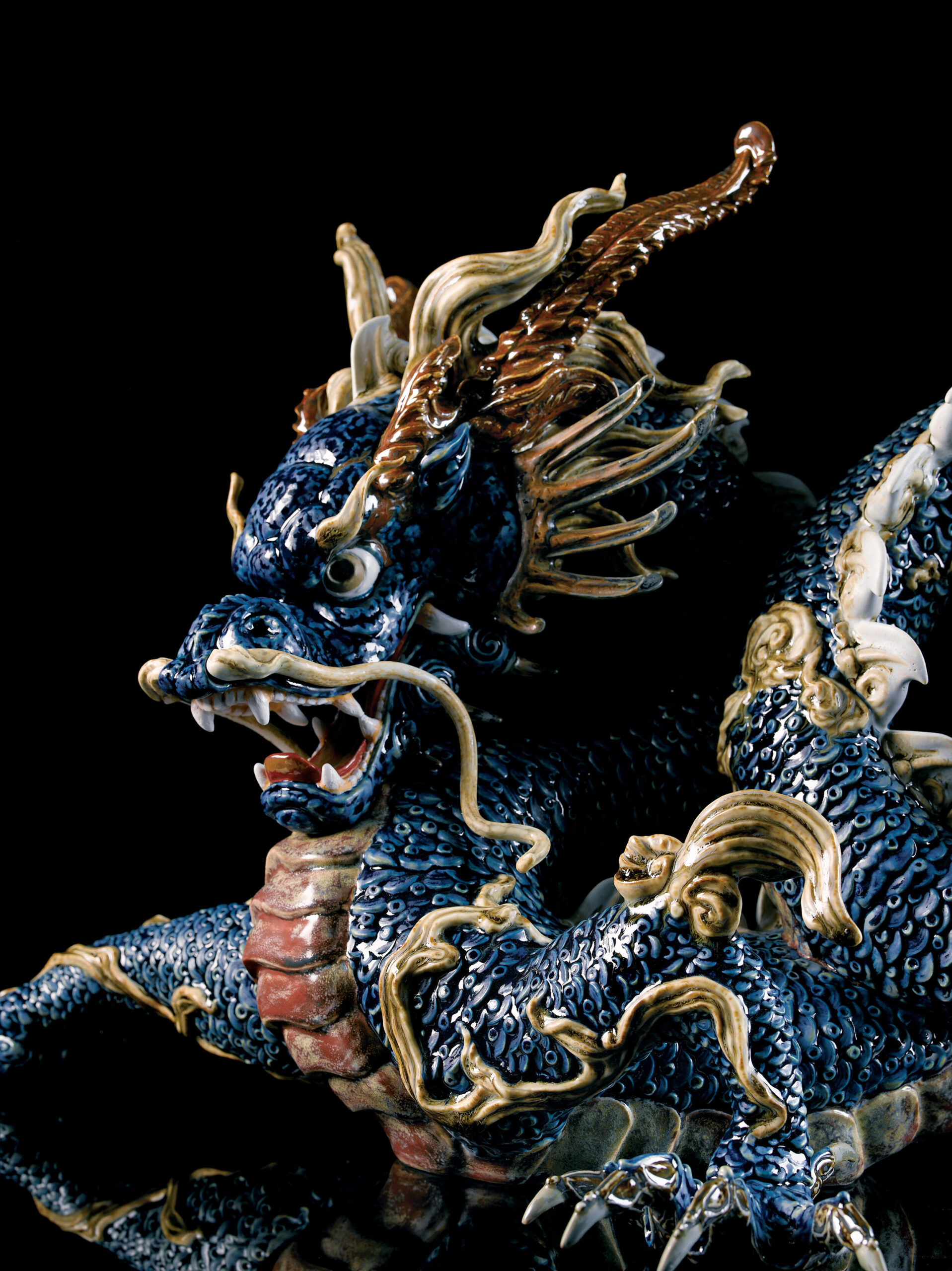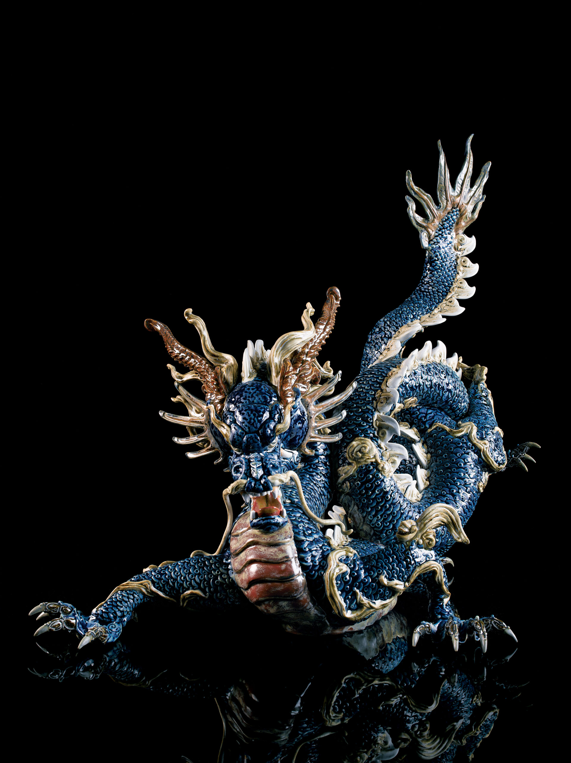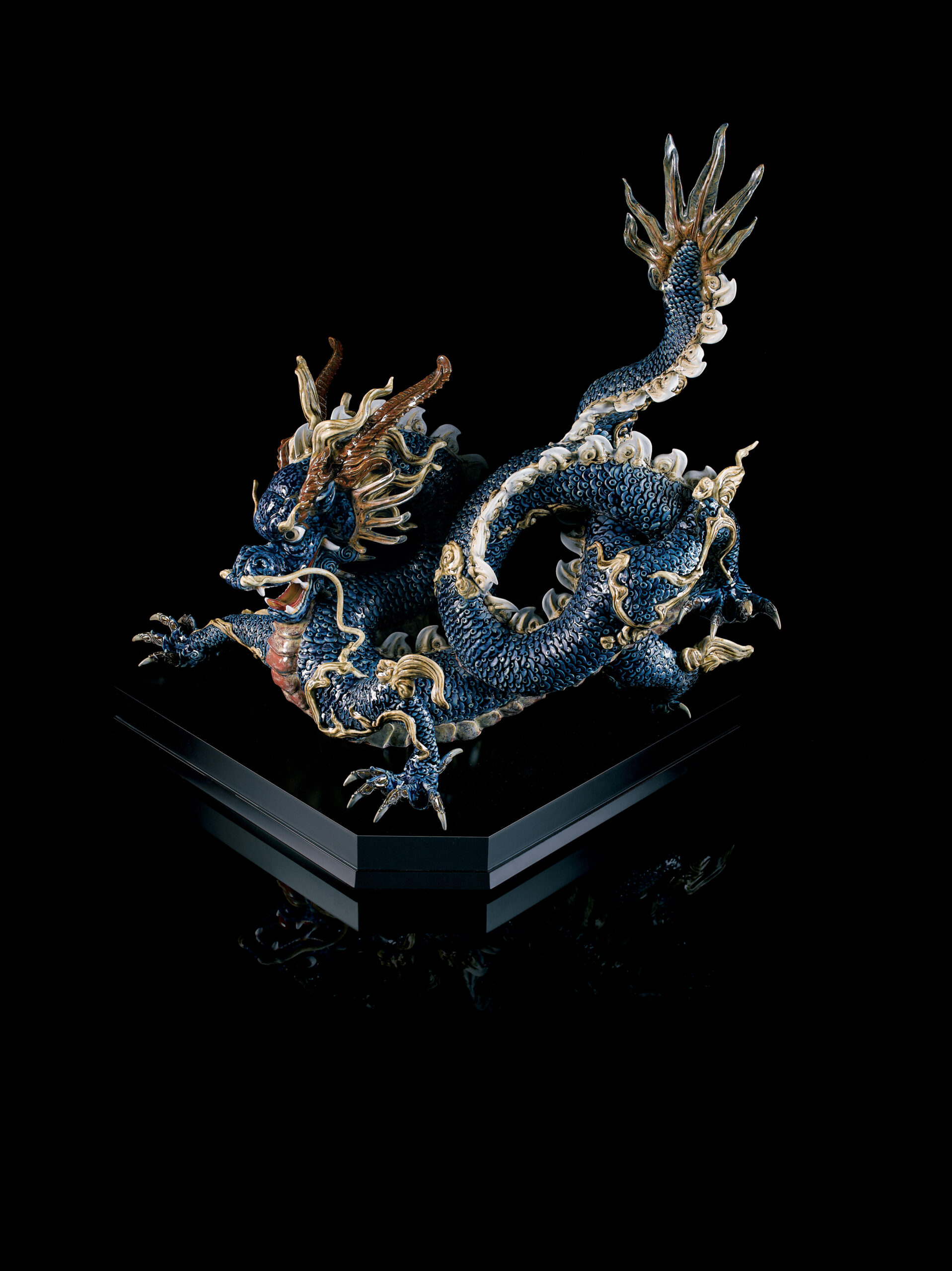 A symbol of power and prosperity in Eastern culture, this magical creature, the bearer of good luck, is the protagonist in this spectacular High Porcelain limited edition. The hundreds of scales covering its skin are individually hand painted in different shades of blue, which gives it a special shine and which is an extremely laborious technique requiring the expertise of the finest artists. The luminosity distinguishing its spectacular embellishment is attained by combining gloss and satin finishes. The complexity of the dragon´s shape and the great number of small details make the process of its creation extremely difficult, from the modelling of the original sculpture through to its final firing in the kiln.
