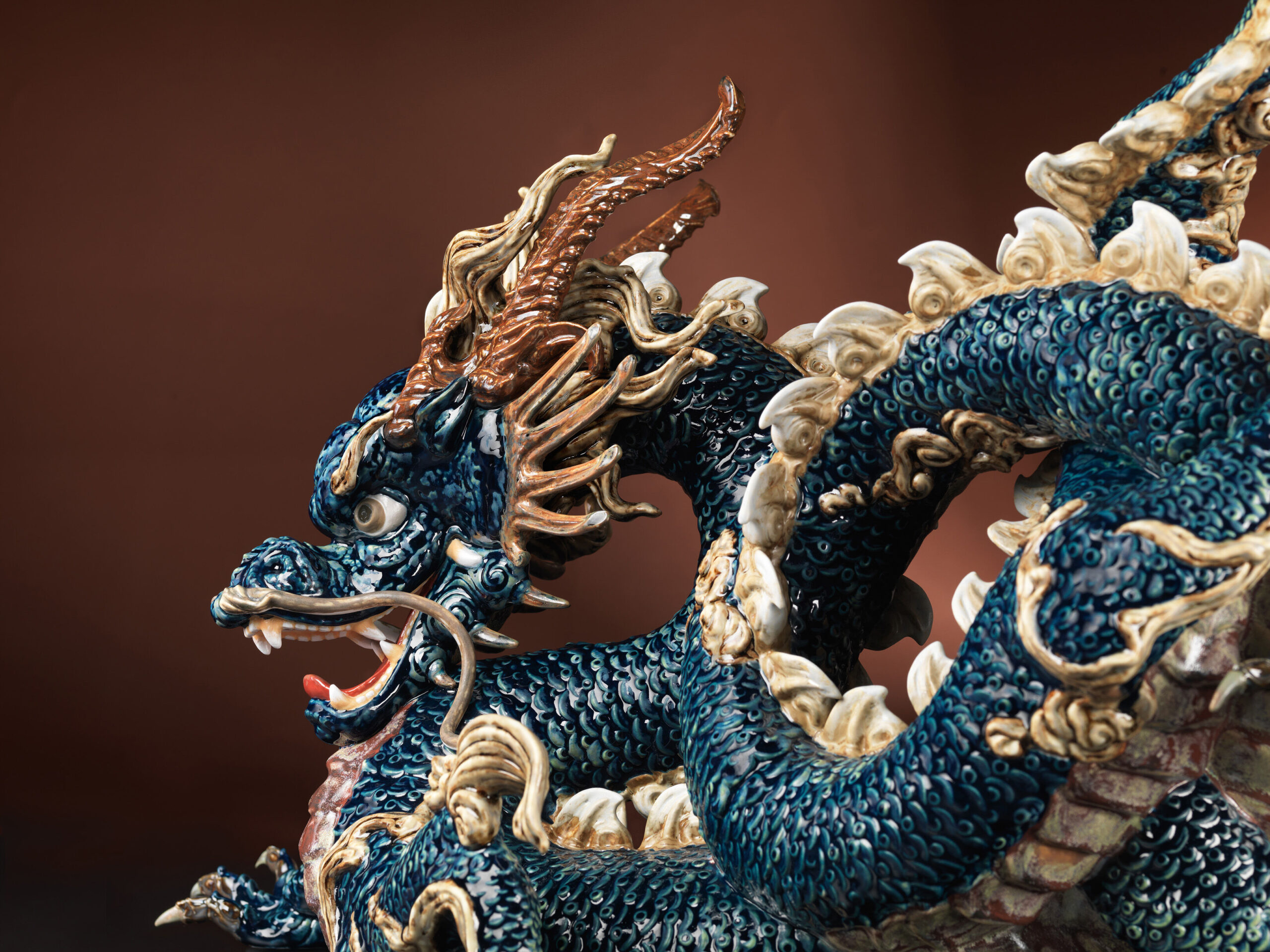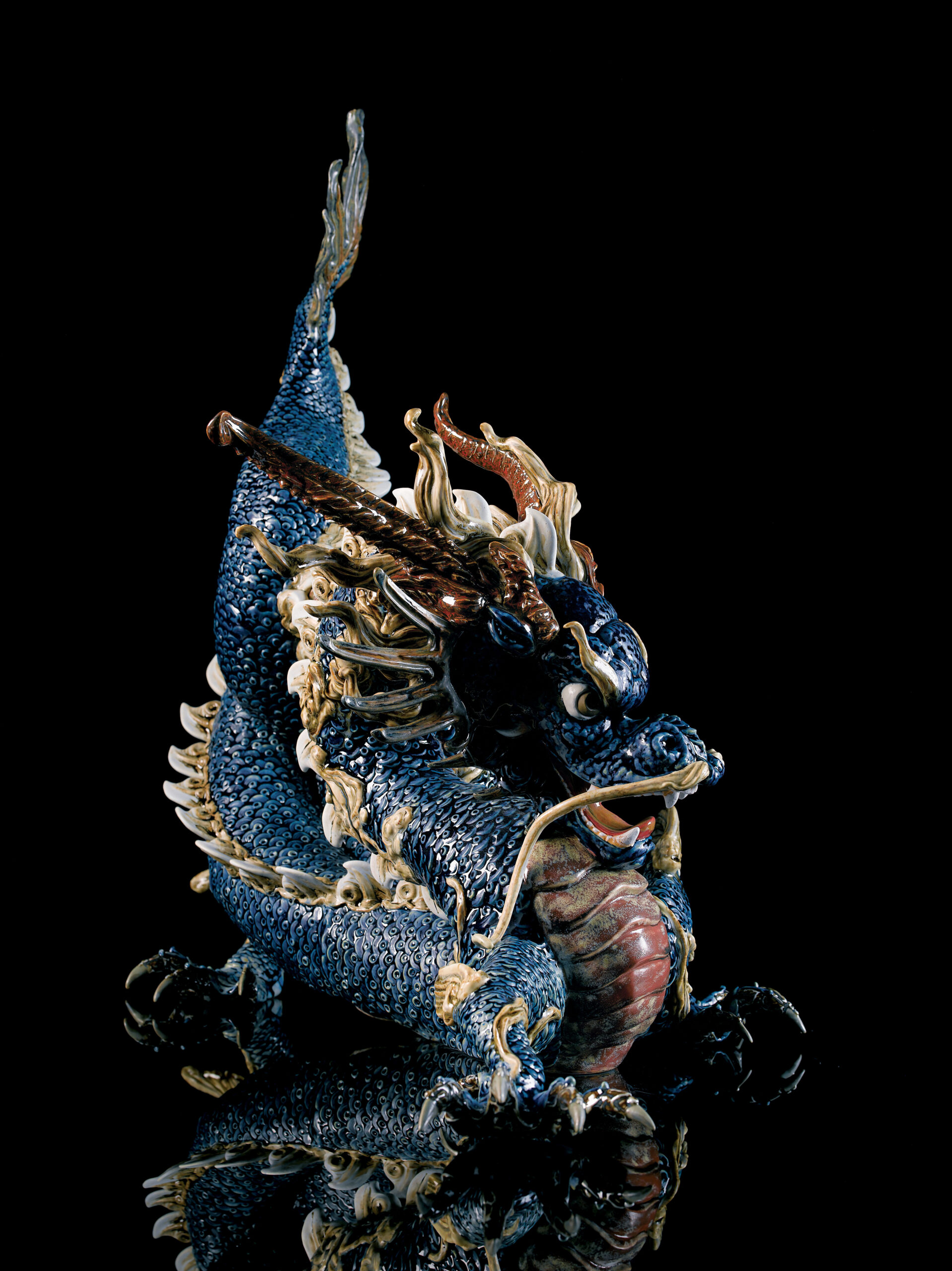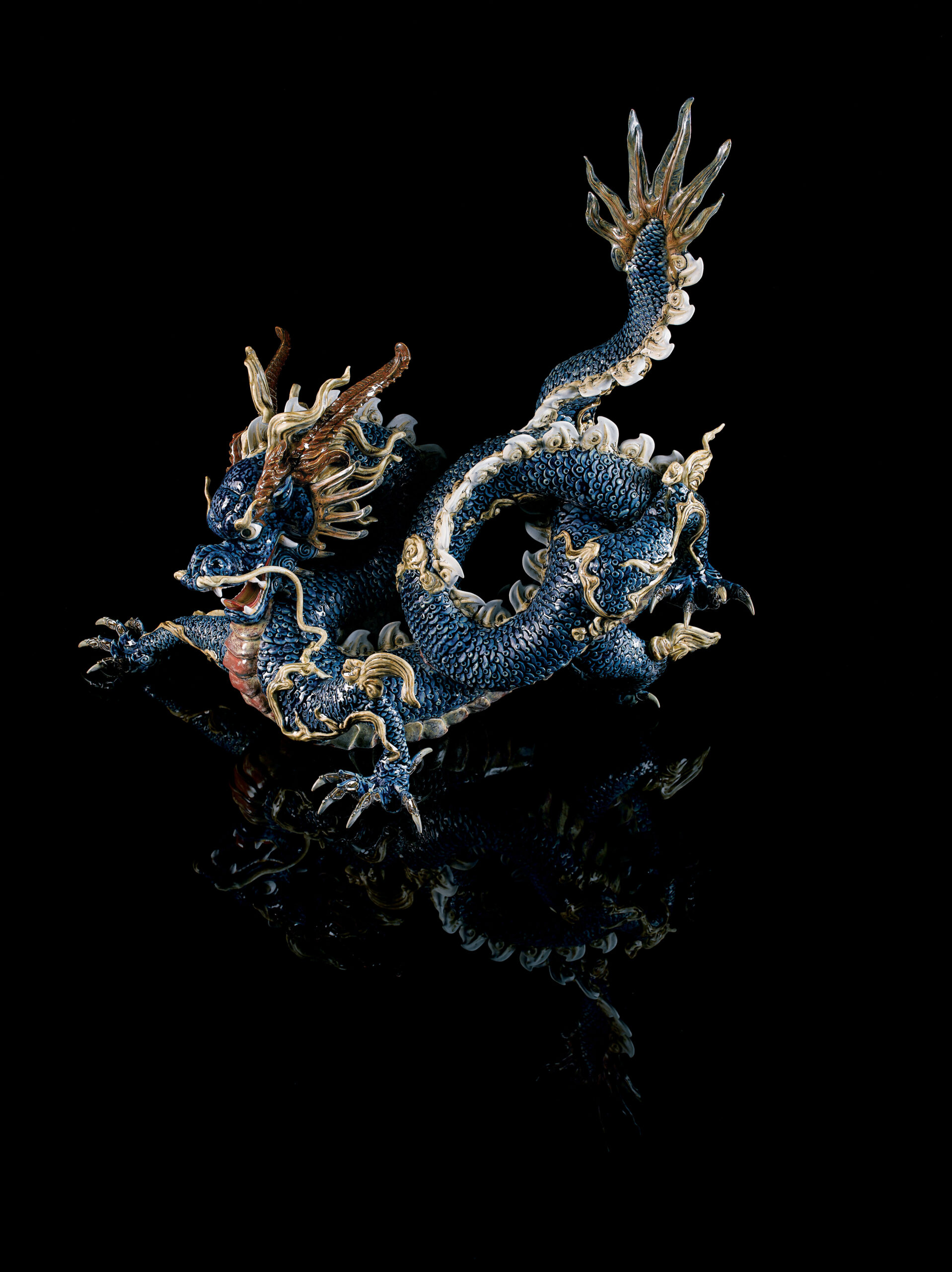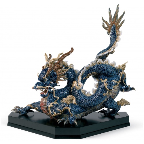 A symbol of power and prosperity in Eastern culture, this magical creature, the bearer of good luck, is the protagonist in this spectacular High Porcelain limited edition. The hundreds of scales covering its skin are individually hand painted in different shades of blue, which gives it a special shine and which is an extremely laborious technique requiring the expertise of the finest artists. The luminosity distinguishing its spectacular embellishment is attained by combining gloss and satin finishes. The complexity of the dragon´s shape and the great number of small details make the process of its creation extremely difficult, from the modelling of the original sculpture through to its final firing in the kiln.