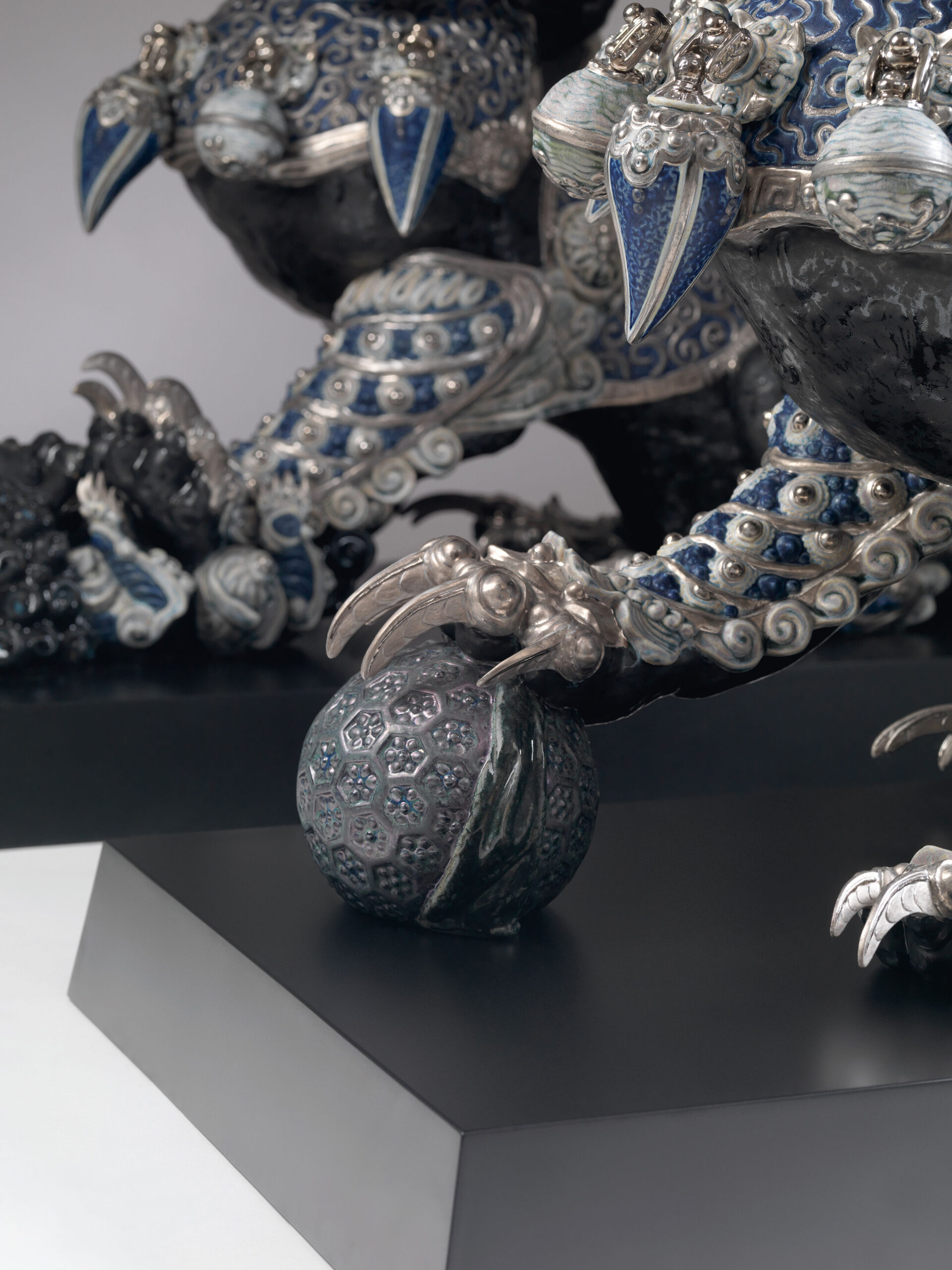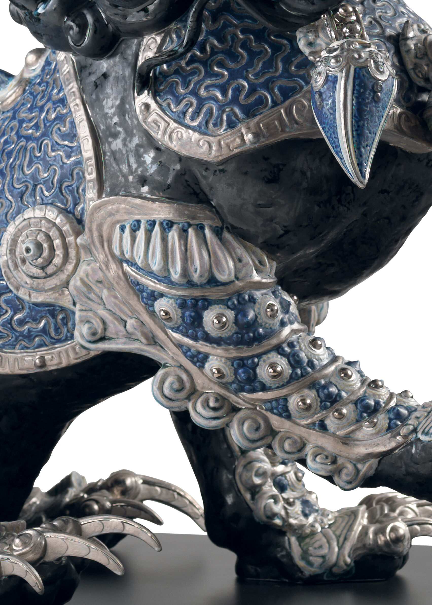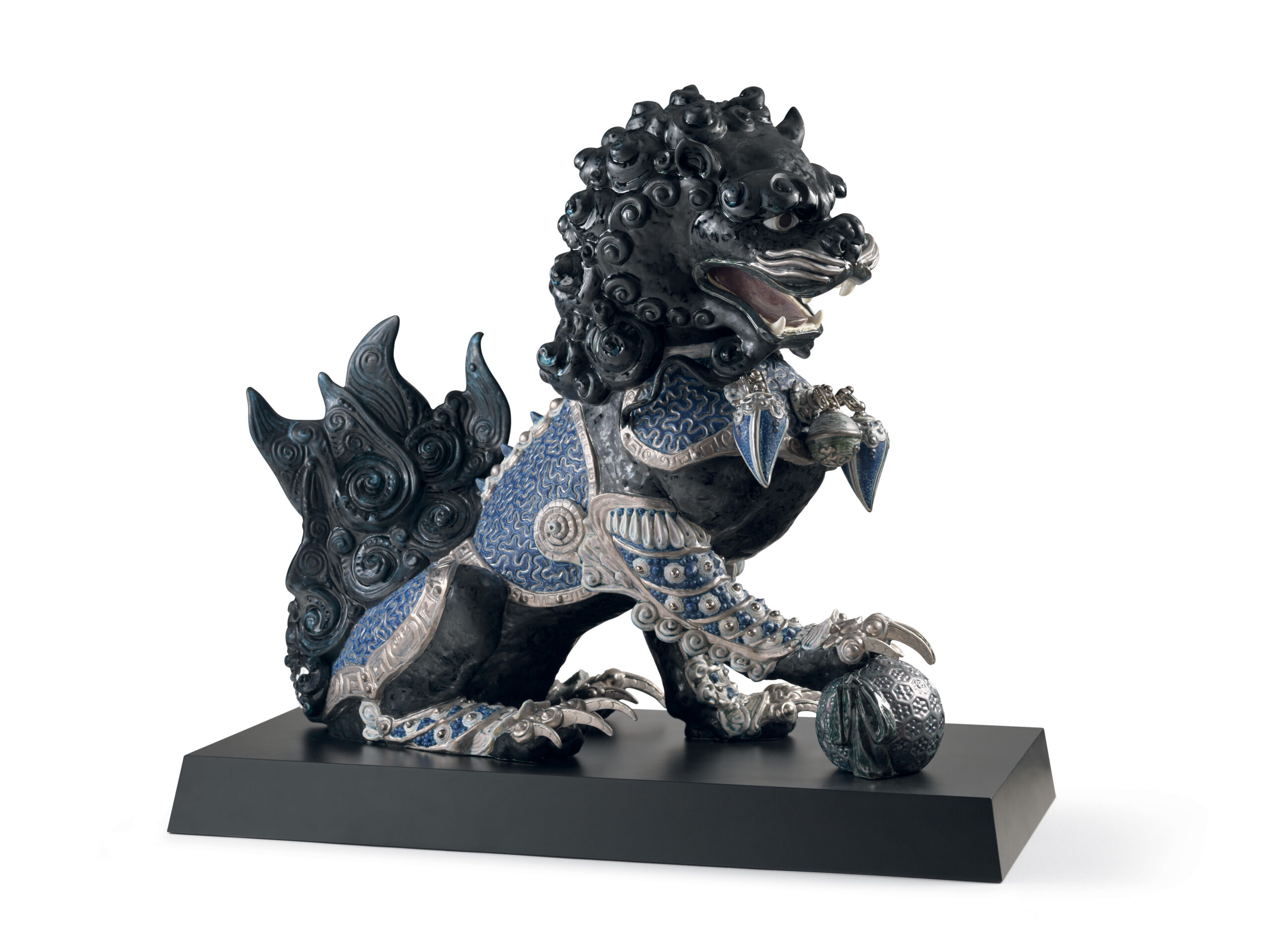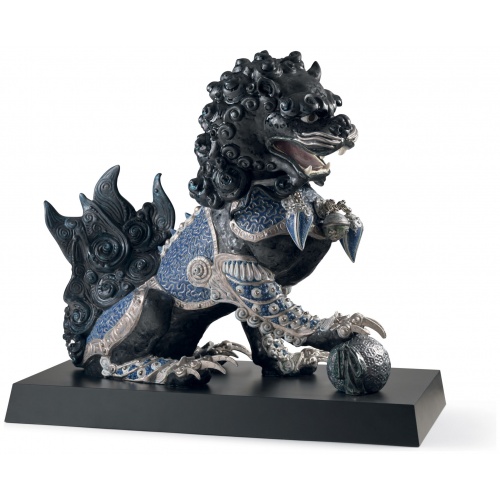 For thousands of years, these majestic creatures have represented the best omens in Eastern culture. Artists at the LladrĂ³ High Porcelain workshop have recreated this ancient tradition in these limited edition pieces, richly decorated with lustres and various textures and finishes. These lions, inspired by traditional statues of bronze, iron or granite which flank the doors of palaces, temples and noble houses in various Eastern countries, are presented in pairs and protect the buildings from evil spirits. Seen from the front, the male is located on the right and takes care of the structure, represented by the ball he holds with his leg, while the female is located on the left and cares for the inhabitants. This lion is paired with the guardian lioness (black) and there are two other decorative versions. Black, blue and silver tones are predominant in its ornamentation, giving the piece a very modern air. Artists of the High Porcelain workshop recreate and embellish every detail of the piece, such as the elaborate ornamentation of the skirts and chest plates, the introduction of the necklace as a decorative element and the lavish modelling of the manes and tails. Authentic filigree work makes these impressive sculptures a work halfway between the thousand-year-old tradition and the maker´s creation.