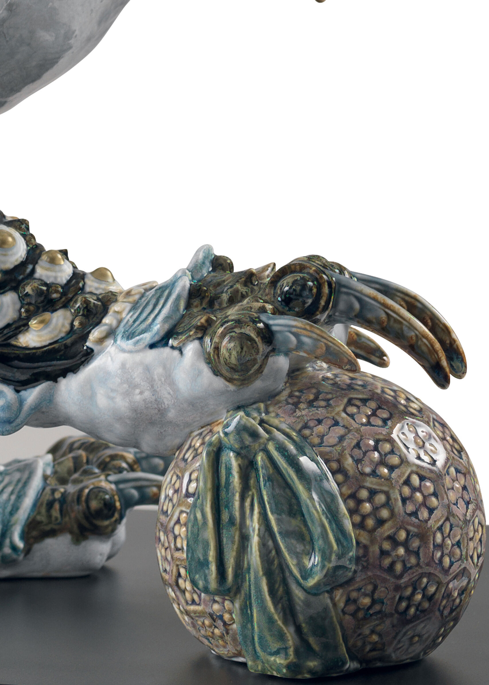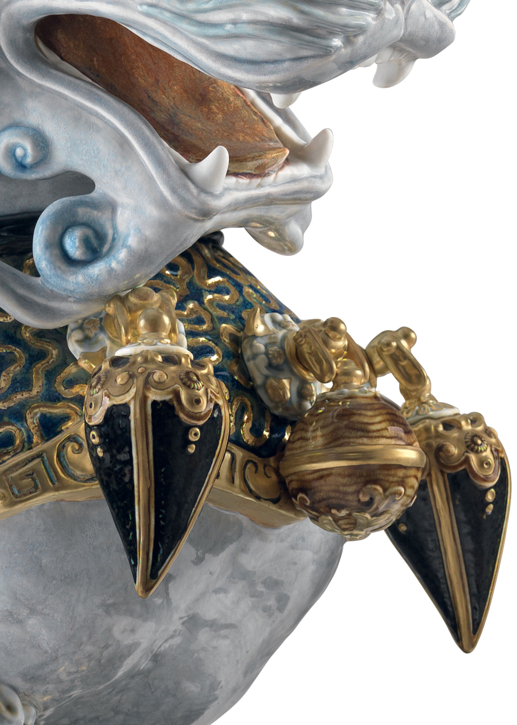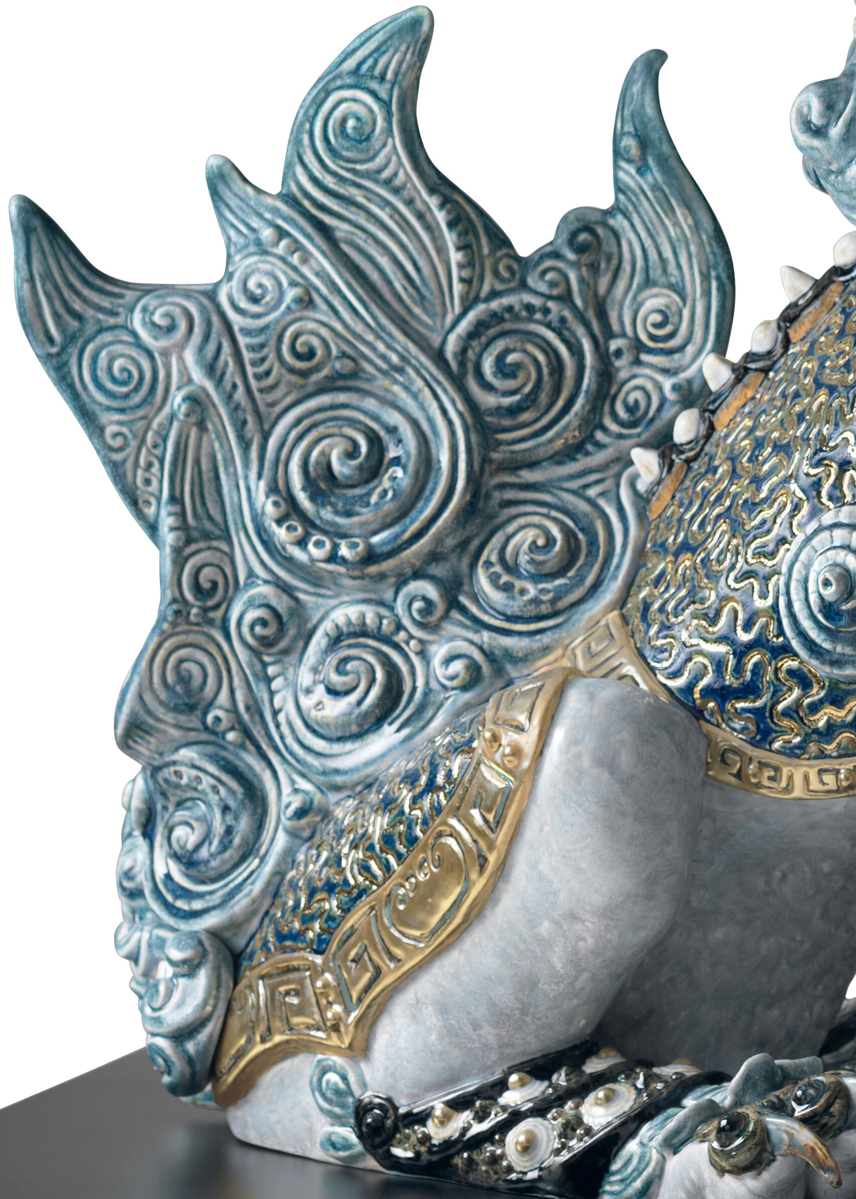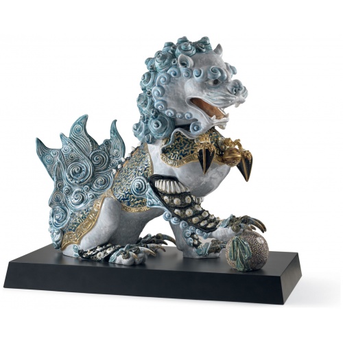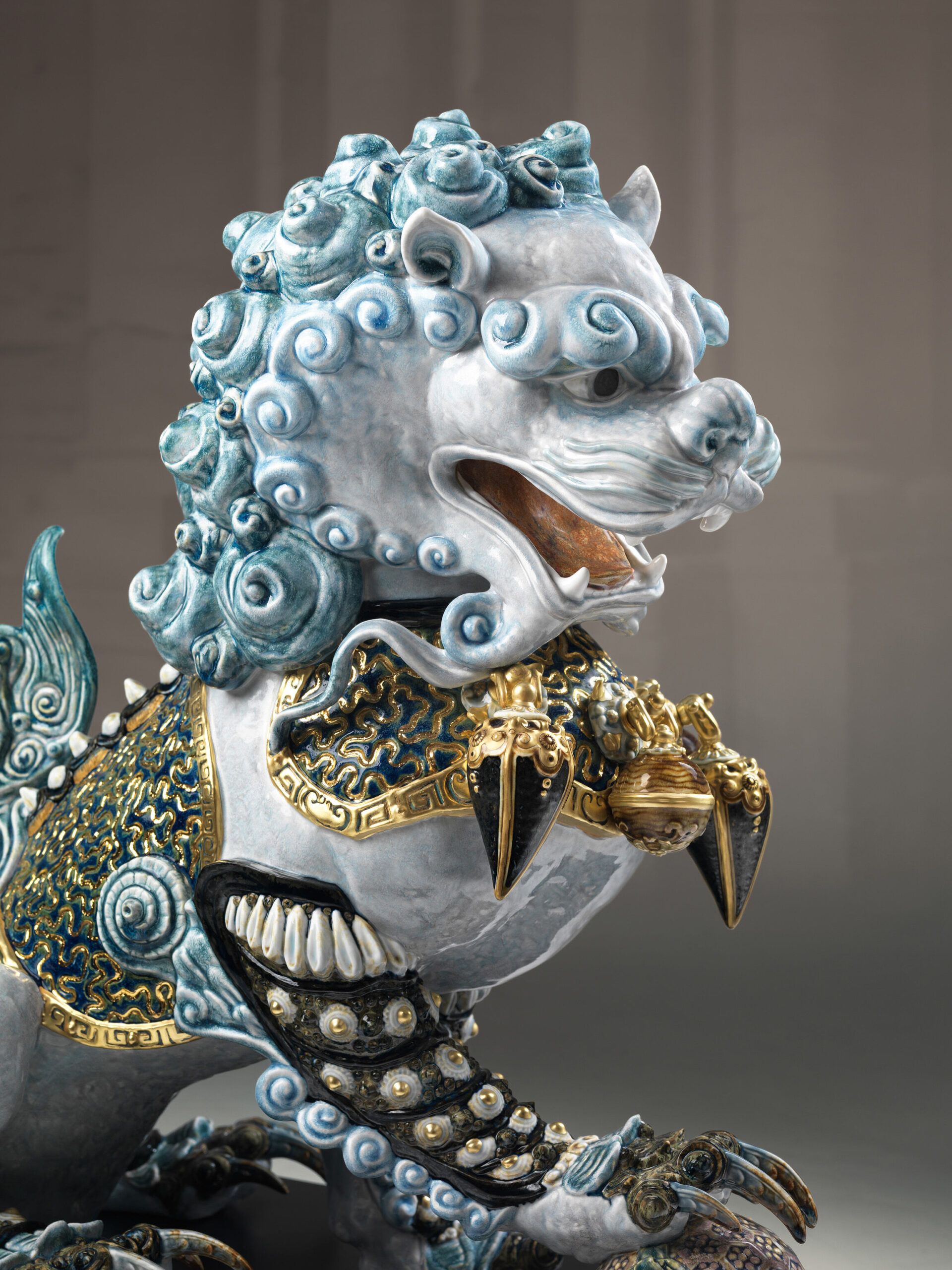 For thousands of years, these majestic creatures have represented the best omens in Eastern culture. Artists at the LladrĂ³ High Porcelain workshop have recreated this ancient tradition in these limited edition pieces, richly decorated with lustres and various textures and finishes. These lions, inspired by traditional statues of bronze, iron or granite which flank the doors of palaces, temples and noble houses in various Eastern countries, are presented in pairs and protect the buildings from evil spirits. Seen from the front, the male is located on the right and takes care of the structure, represented by the ball he holds with his leg, while the female is located on the left and cares for the inhabitants. This lion is paired with the guardian lioness (blue) and there are two other decorative versions. Blue tones are predominant, in addition to border in gold lustre with alternating gloss and matte finishes. Artists of the High Porcelain workshop recreate and embellish every detail of the piece, such as the elaborate ornamentation of the skirts and chest plates, the introduction of the necklace as a decorative element and the lavish modelling of the manes and tails. Authentic filigree work makes these impressive sculptures a work halfway between the thousand-year-old tradition and the maker´s creation.
