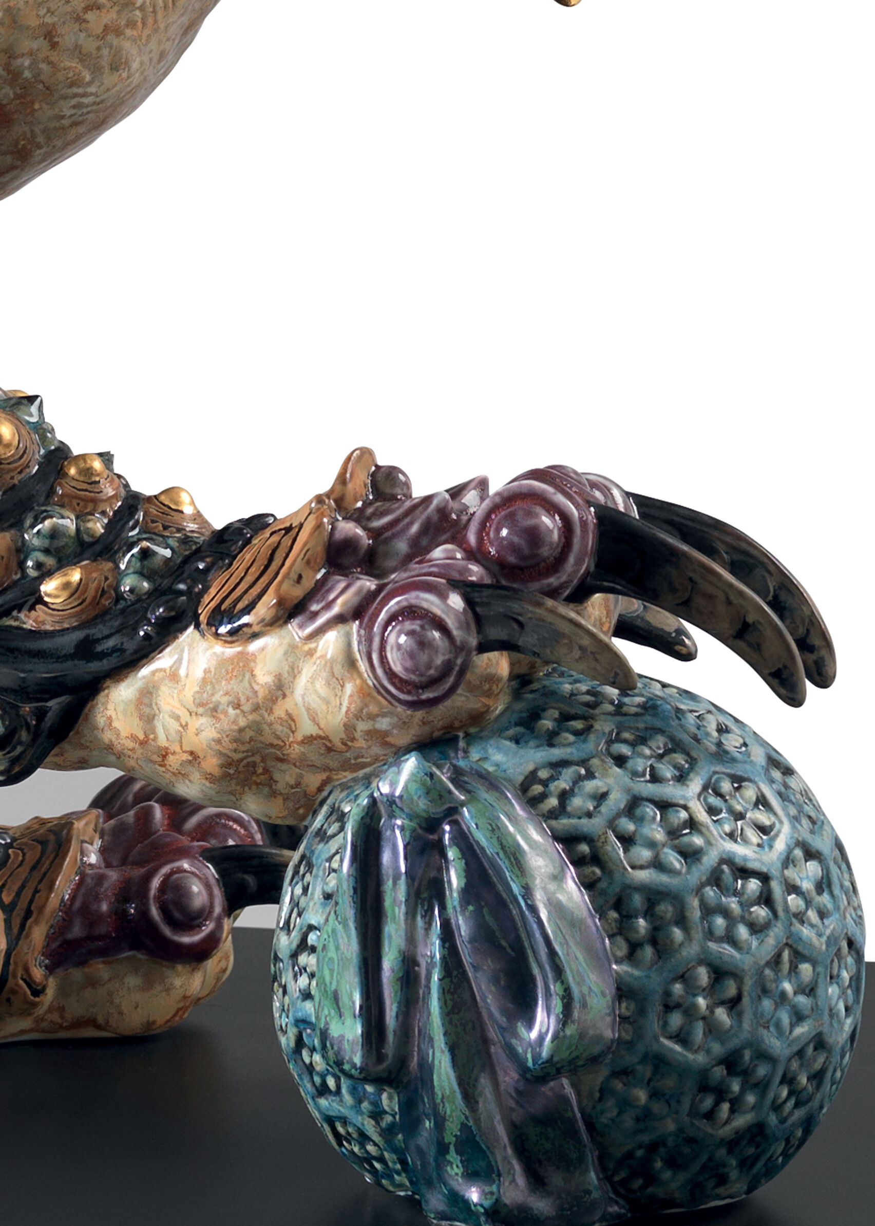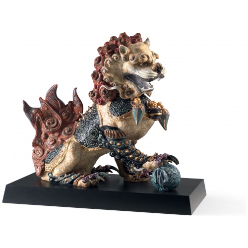 For thousands of years, these majestic creatures have represented the best omens in Eastern culture. Artists at the LladrĂ³ High Porcelain workshop have recreated this ancient tradition in these limited edition pieces, richly decorated with lustres and various textures and finishes. These lions, inspired by traditional statues of bronze, iron or granite which flank the doors of palaces, temples and noble houses in various Eastern countries, are presented in pairs and protect the buildings from evil spirits. Seen from the front, the male is located on the right and takes care of the structure, represented by the ball he holds with his leg, while the female is located on the left and cares for the inhabitants. This lion is paired with the guardian lioness (red) and there are two other decorative versions. Warm colours are predominant in its ornamentation, with alternating yellow-orange, reds and earth tones. Artists of the High Porcelain workshop recreate and embellish every detail of the piece, such as the elaborate ornamentation of the skirts and chest plates, the introduction of the necklace as a decorative element and the lavish modelling of the manes and tails. Authentic filigree work makes these impressive sculptures a work halfway between the thousand-year-old tradition and the maker´s creation.