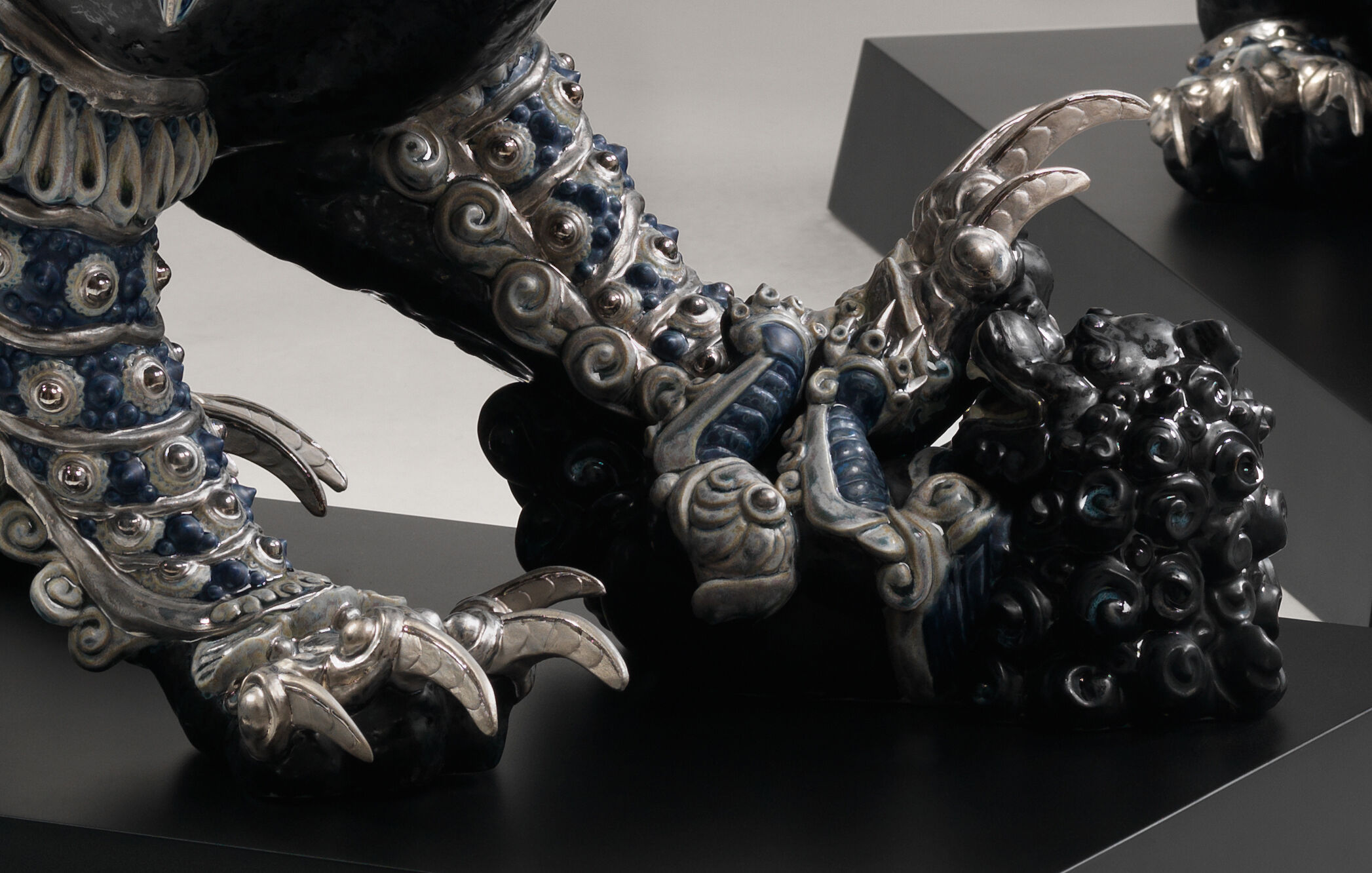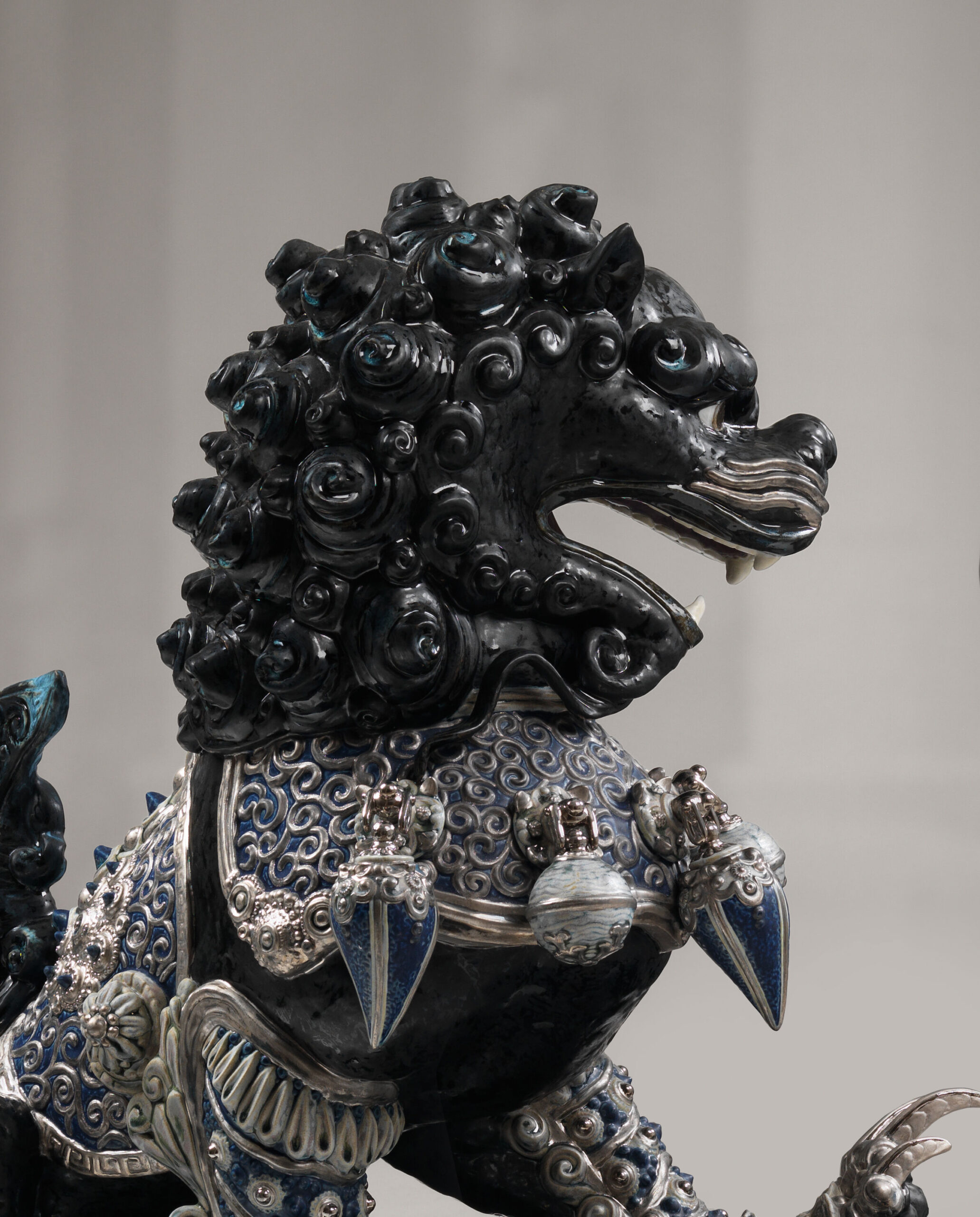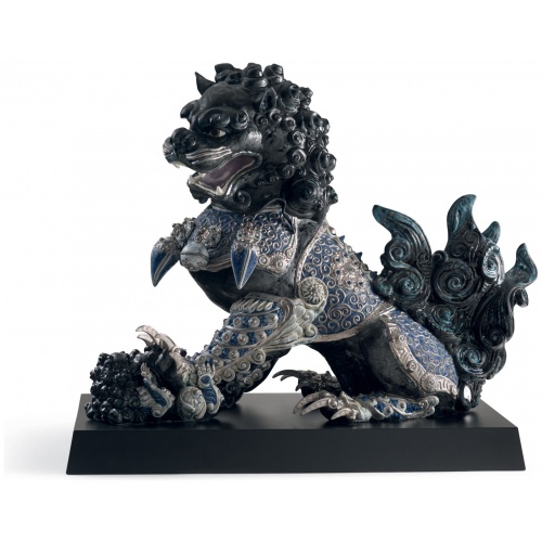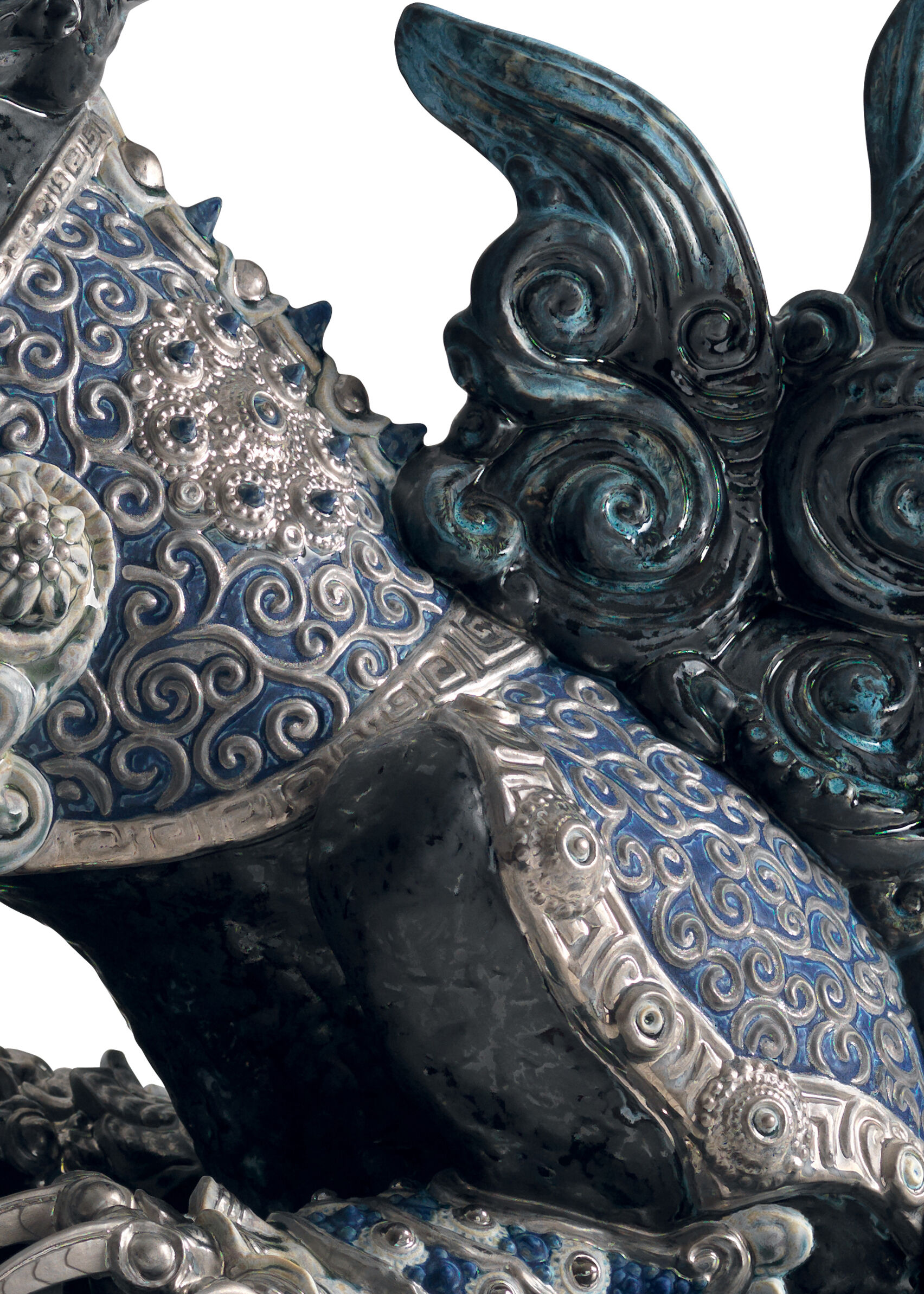 For thousands of years, these majestic creatures have represented the best omens in Eastern culture. Artists at the LladrĂ³ High Porcelain workshop have recreated this ancient tradition in these limited edition pieces, richly decorated with lustres and various textures and finishes. These lions, inspired by traditional statues of bronze, iron or granite which flank the doors of palaces, temples and noble houses in various Eastern countries, are presented in pairs and protect the buildings from evil spirits. Seen from the front, the male is located on the right and takes care of the structure, represented by the ball he holds with his leg, while the female is located on the left and cares for the inhabitants. This lioness is paired with the guardian lion (black) and there are two other decorative versions. Black, blue and silver tones are predominant in its ornamentation, giving the piece a very modern air. Artists of the High Porcelain workshop recreate and embellish every detail of the piece, such as the elaborate ornamentation of the skirts and chest plates, the introduction of the necklace as a decorative element and the lavish modelling of the manes and tails. Authentic filigree work makes these impressive sculptures a work halfway between the thousand-year-old tradition and the maker´s creation.