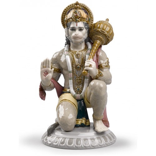 Hanuman is the monkey God, the most prominent representative of the vanaras, a race of ape-men who lived in the forests of South India. They were great warriors; courageous, loyal, honest and gentle. Hanuman is the son of Vayu, the wind god in Hinduism, and he has great physical strength and extraordinary powers. This piece is finished in gloss porcelain and decorated with enamel in a colour palette which pays homage to the richness of Hindu iconography.