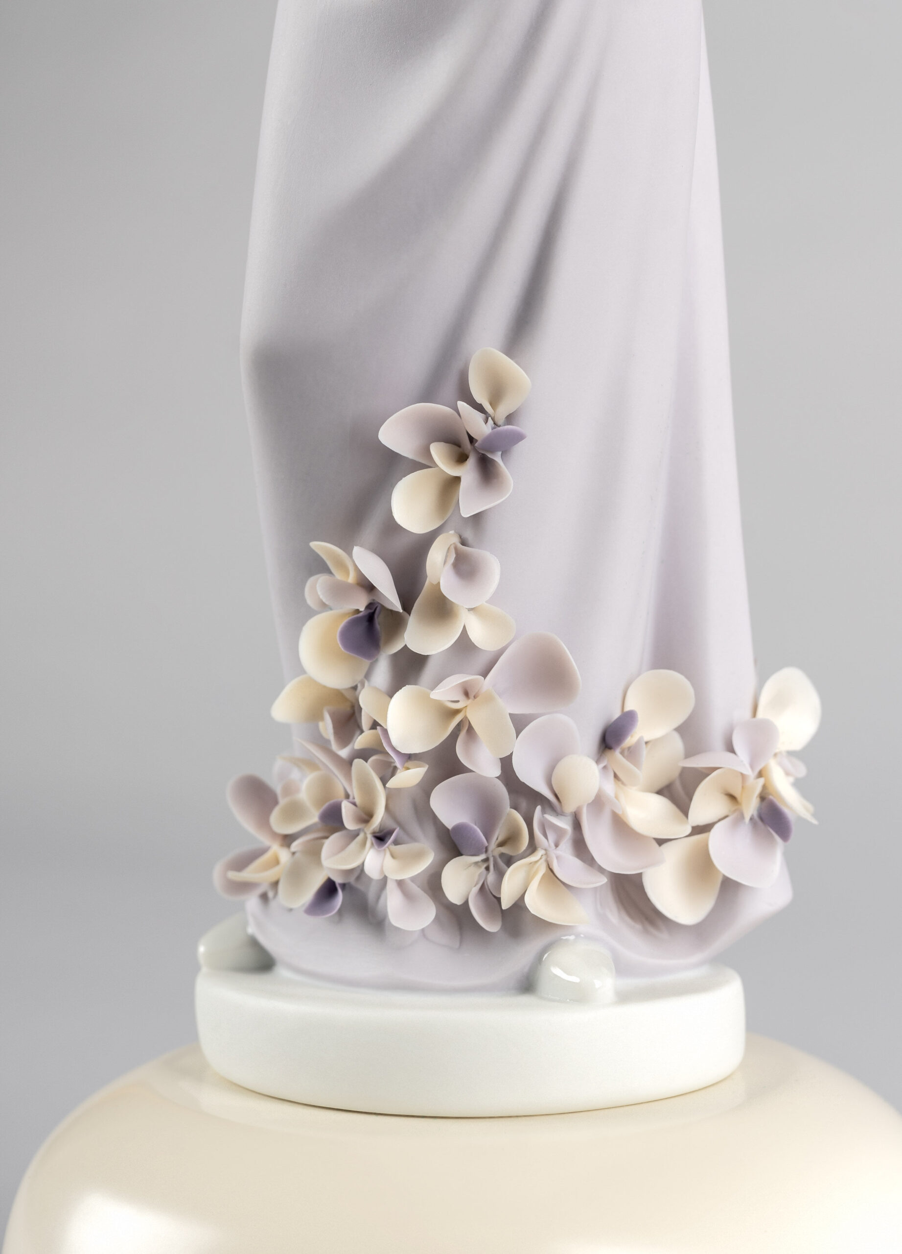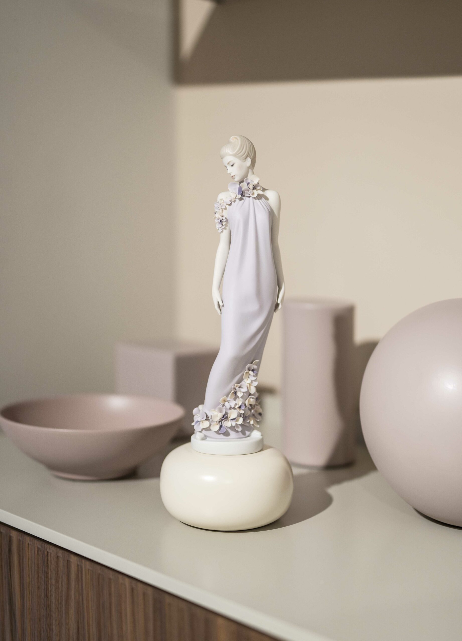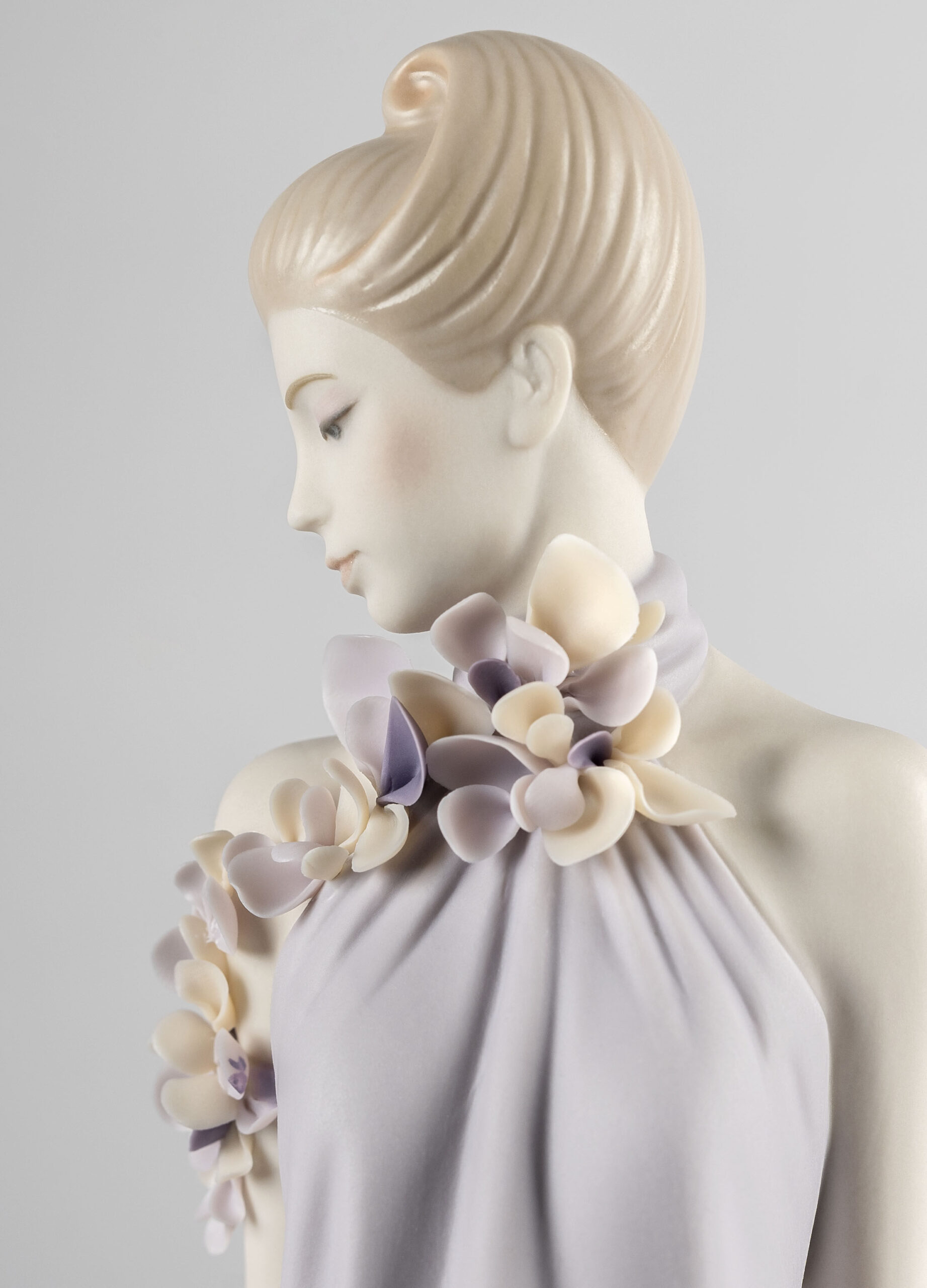 The fashion world in the 1950s inspired this piece in a limited edition of 300 units, finished in white matte porcelain and decorated with soft pastel tones and a spectacular floral composition comprising 135 petals. Optionally it can come with a crystal dome to protect and enhance the piece. A creation with great decorative potential, ideal for gifting to a true fashion lover. Handcrafted in the Lladró workshops in Spain.