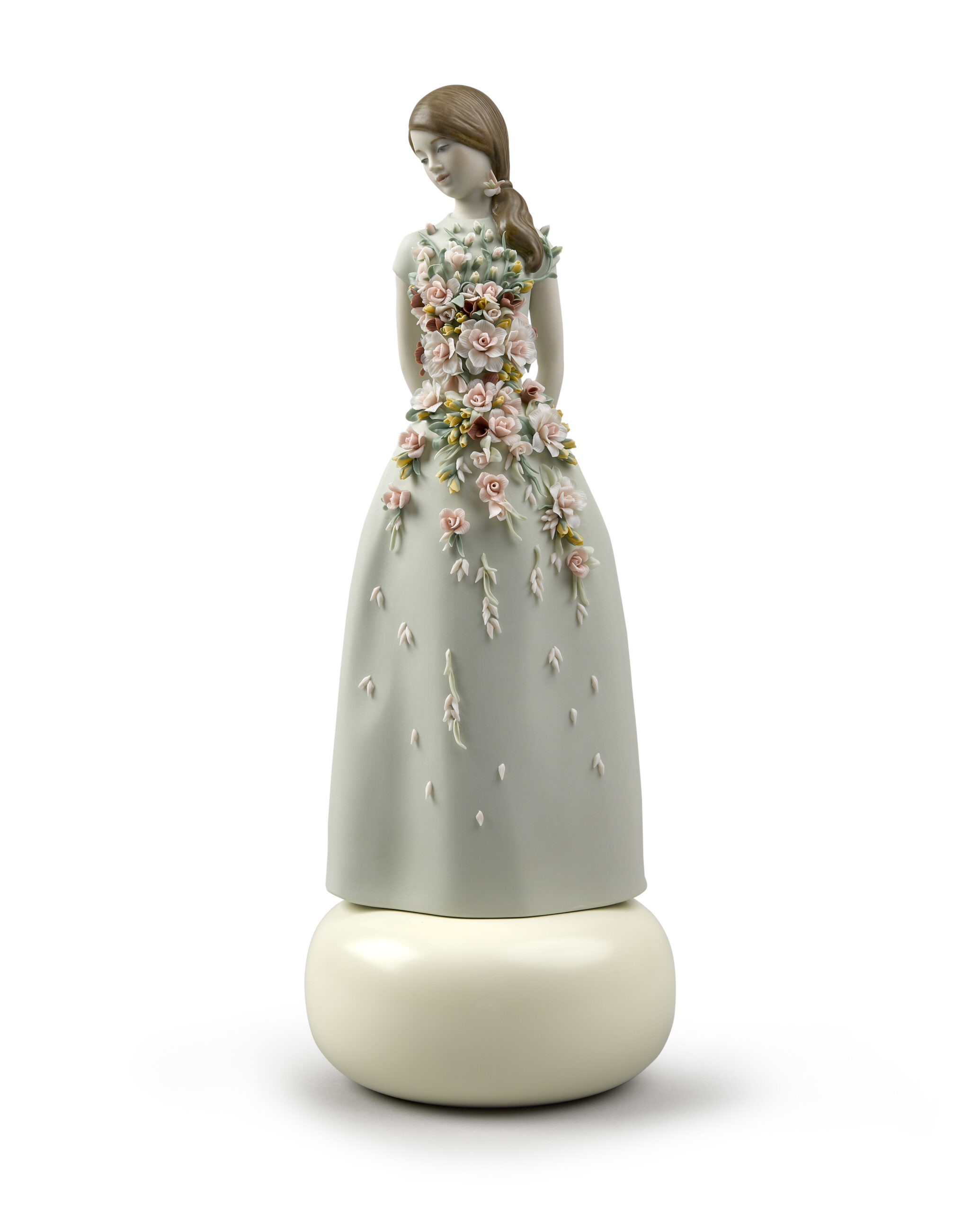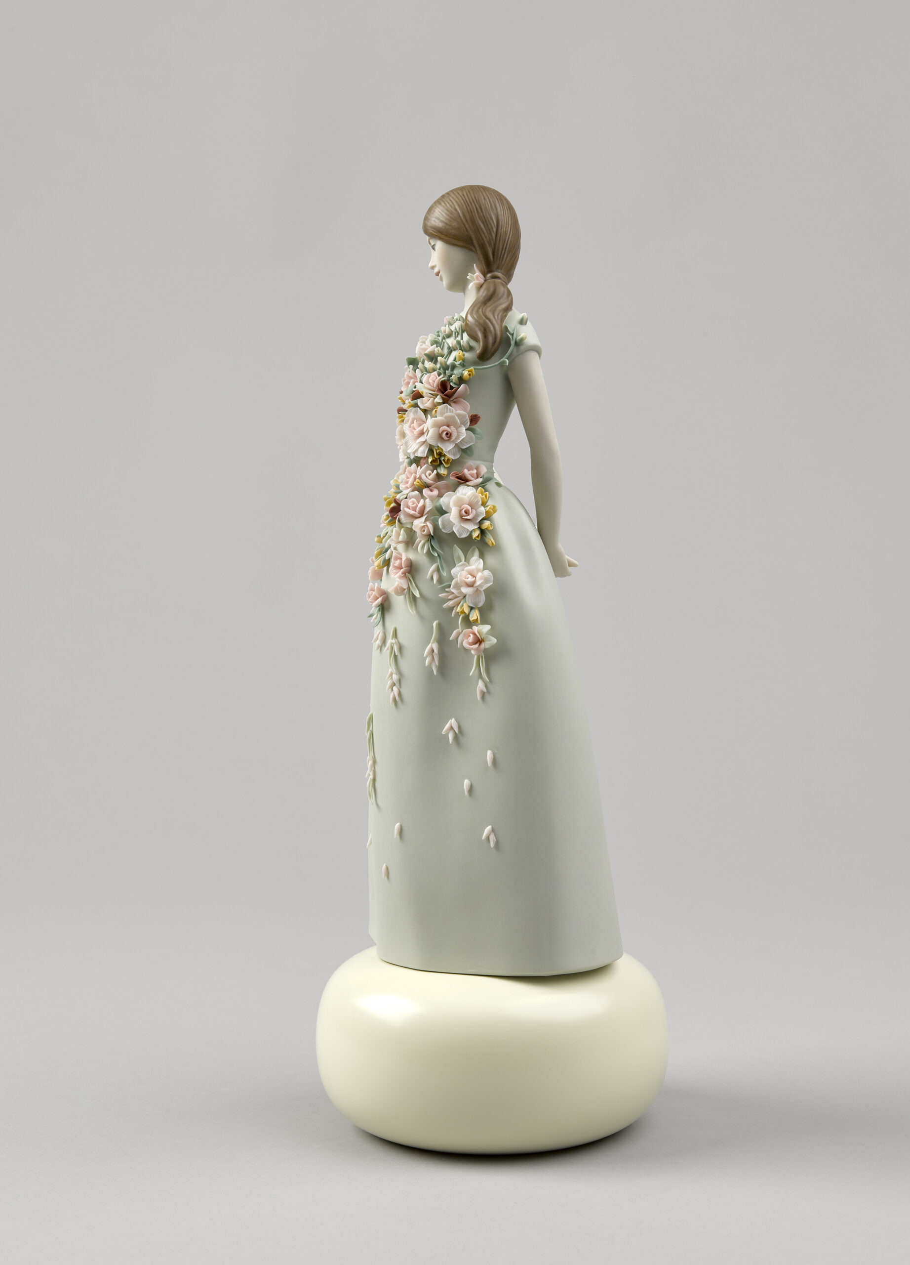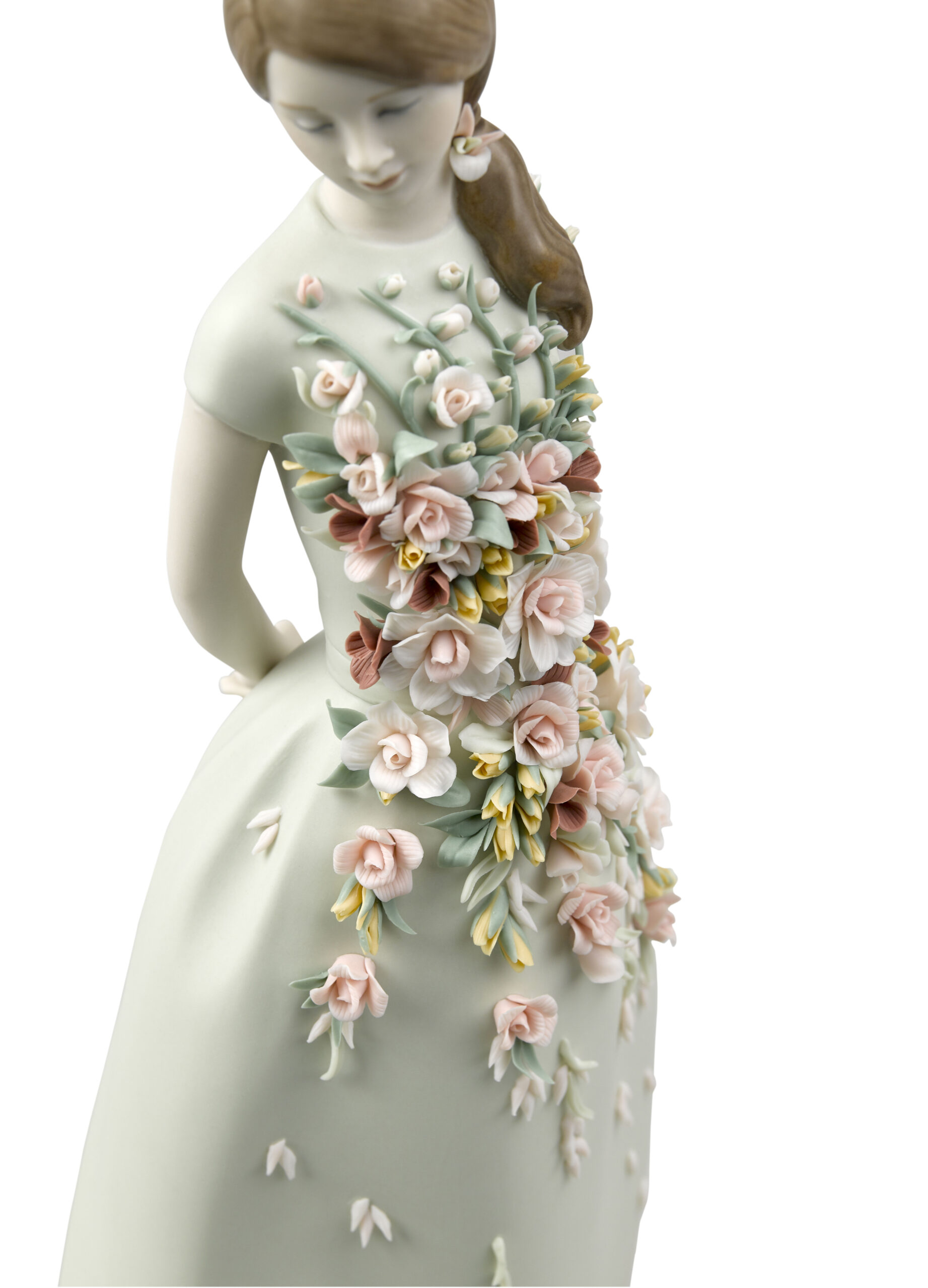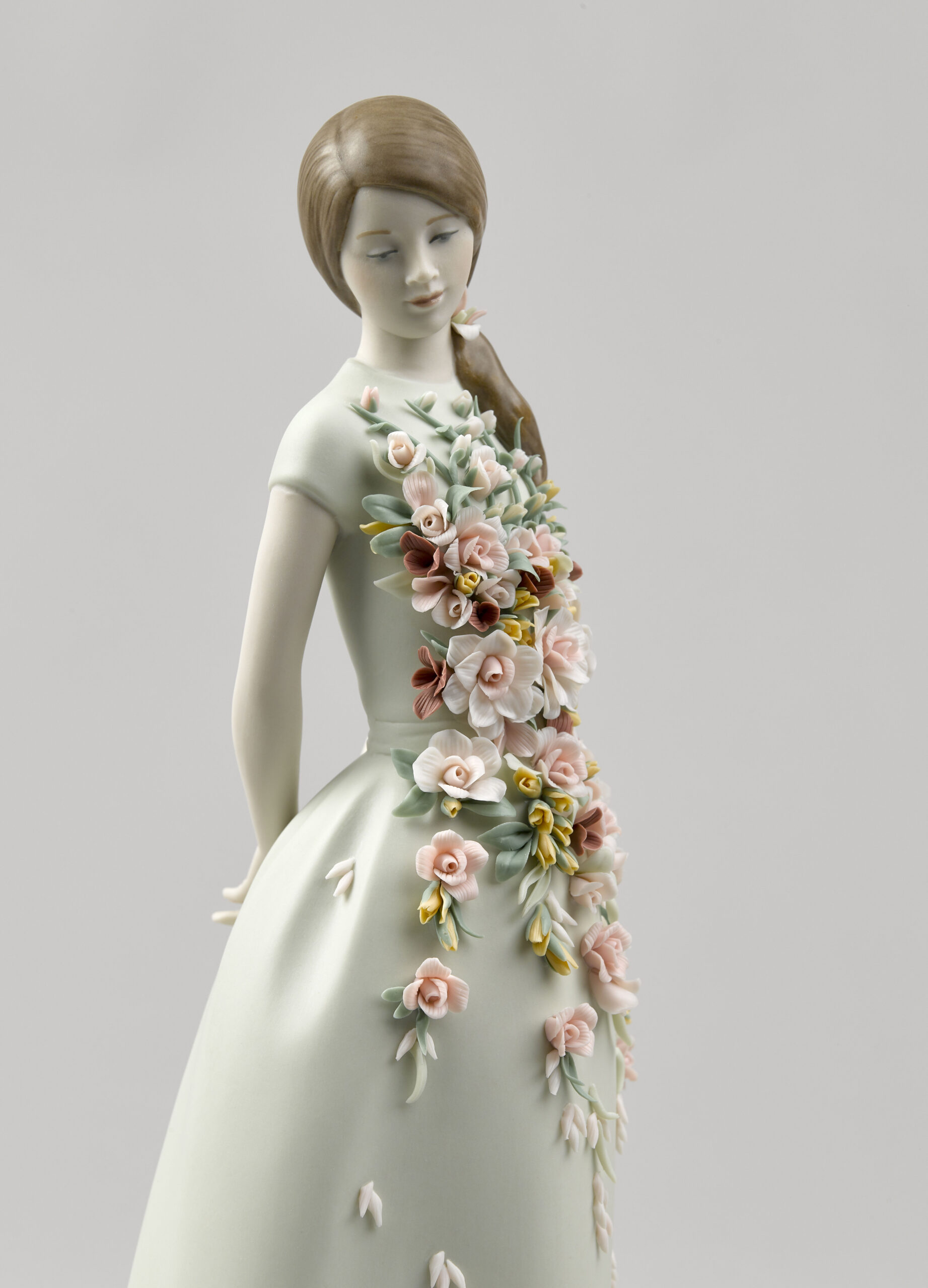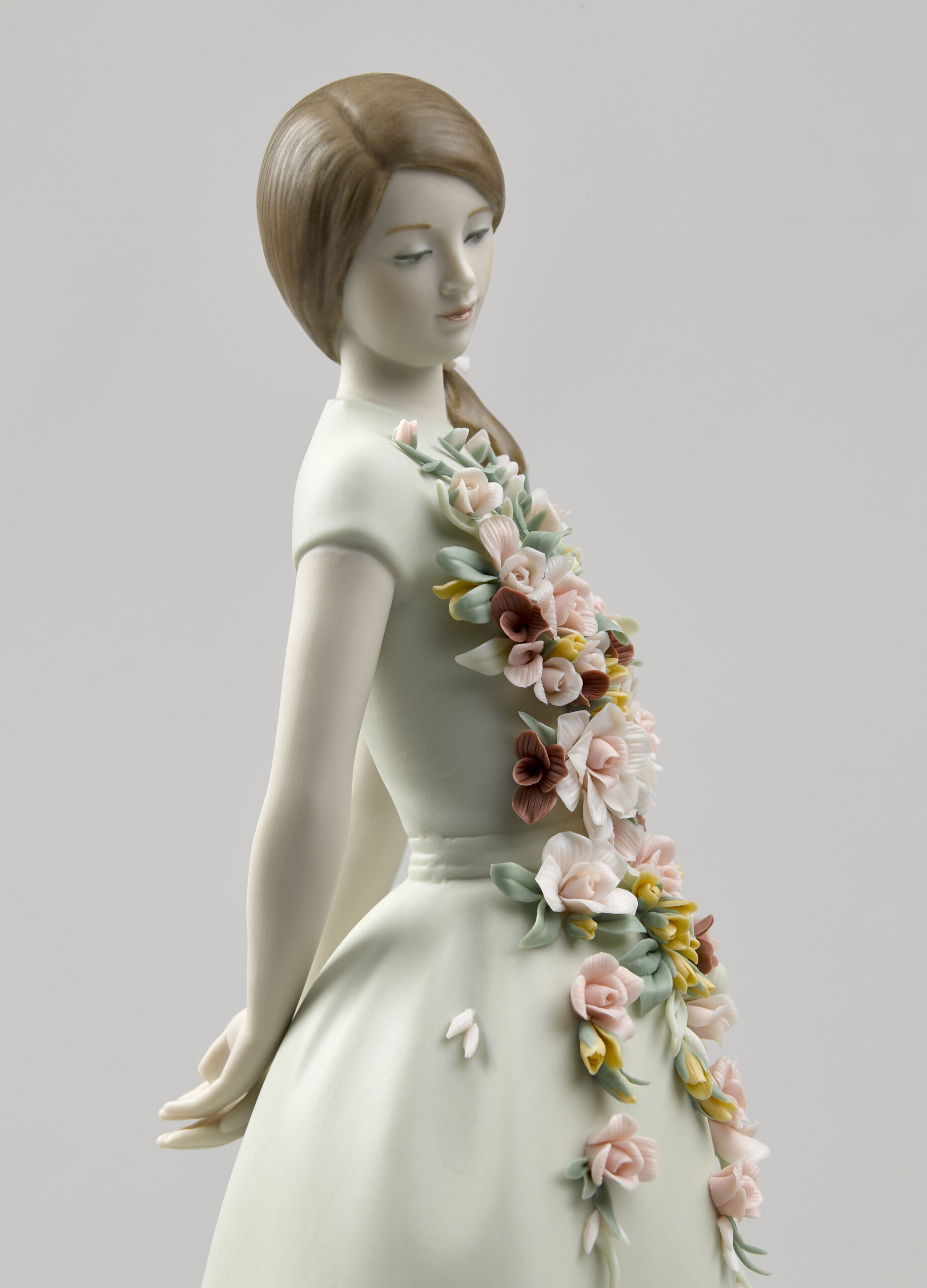 Sweet Elegance is a porcelain figurine inspired by Italian fashion of the 1950s and their cheerful summer frocks. In that decade, after the austerity of the war years, women wanted to express their sensuality again, but always tastefully and modestly. In matte finish porcelain. The aquamarine green dress is gathered at the waist with a floral application in candy colours, inspired by the gardens of the Alhambra. The floral decoration consists of 54 leaves, 56 buds, 28 roses with 5, 7, 10, and 14 petals, 5 sprays, and 70 decorative seeds.