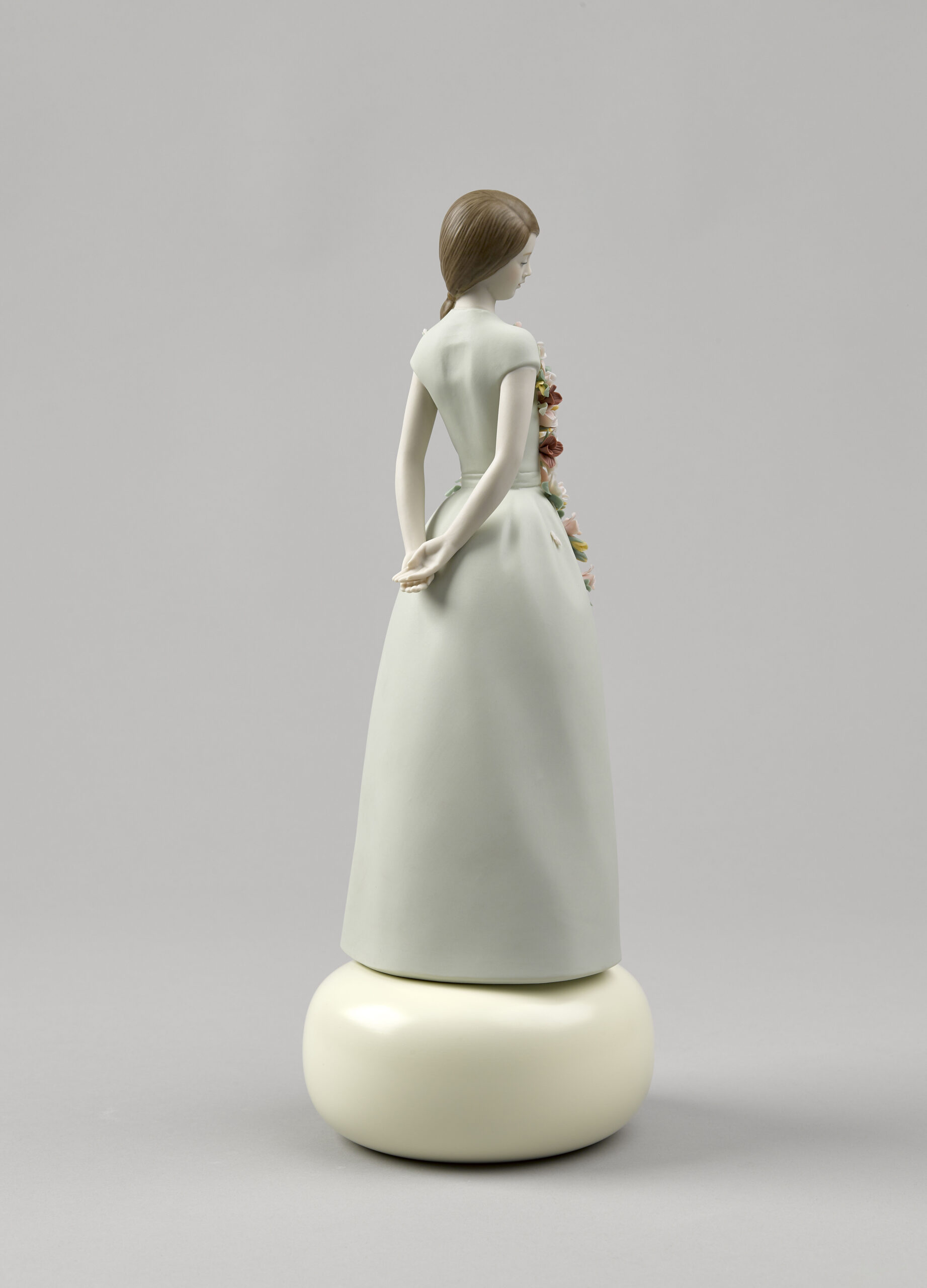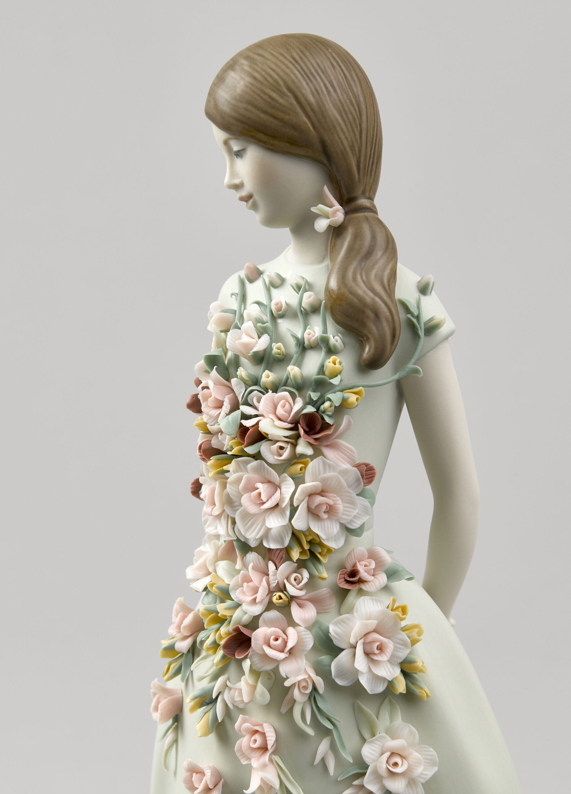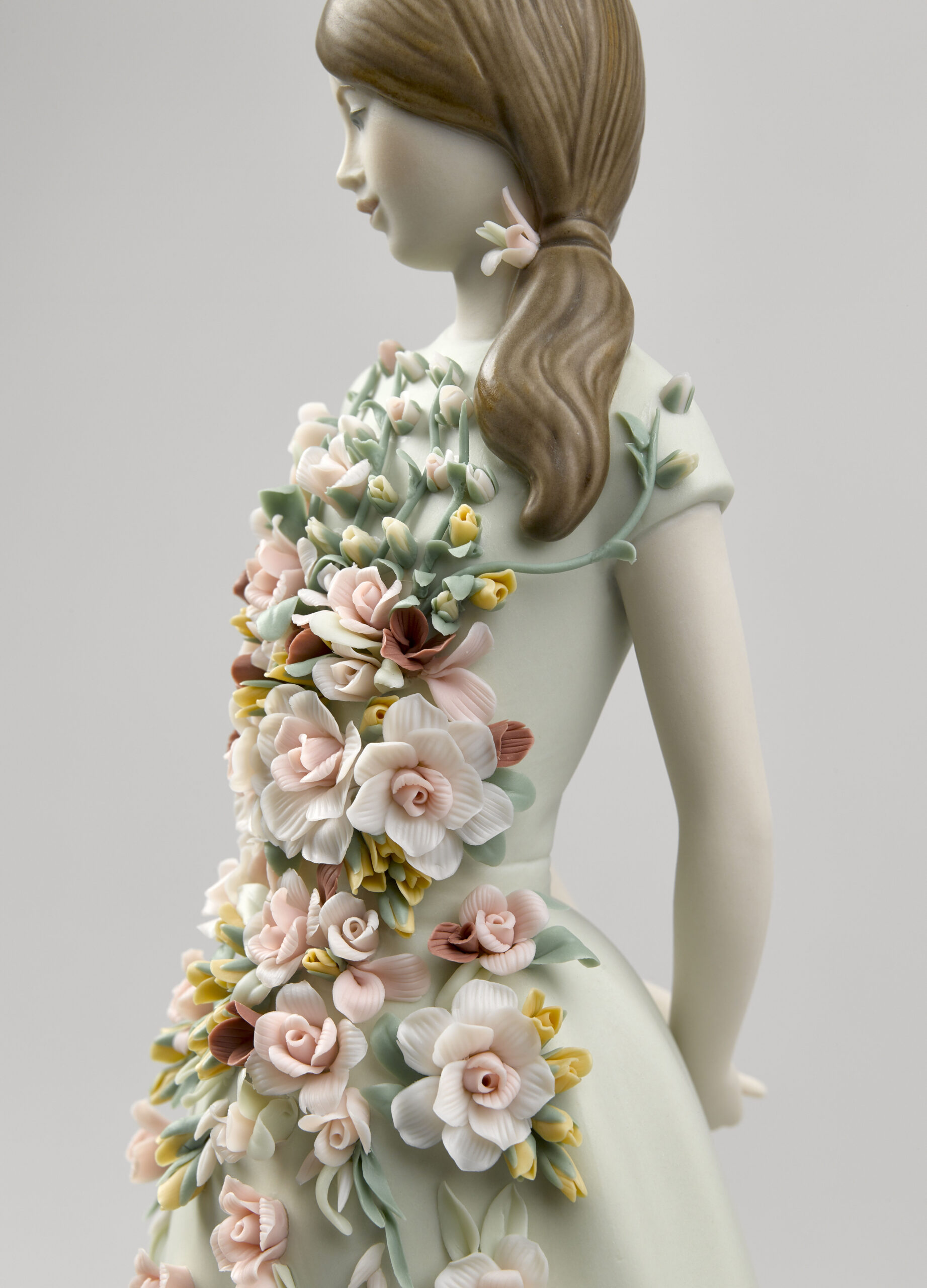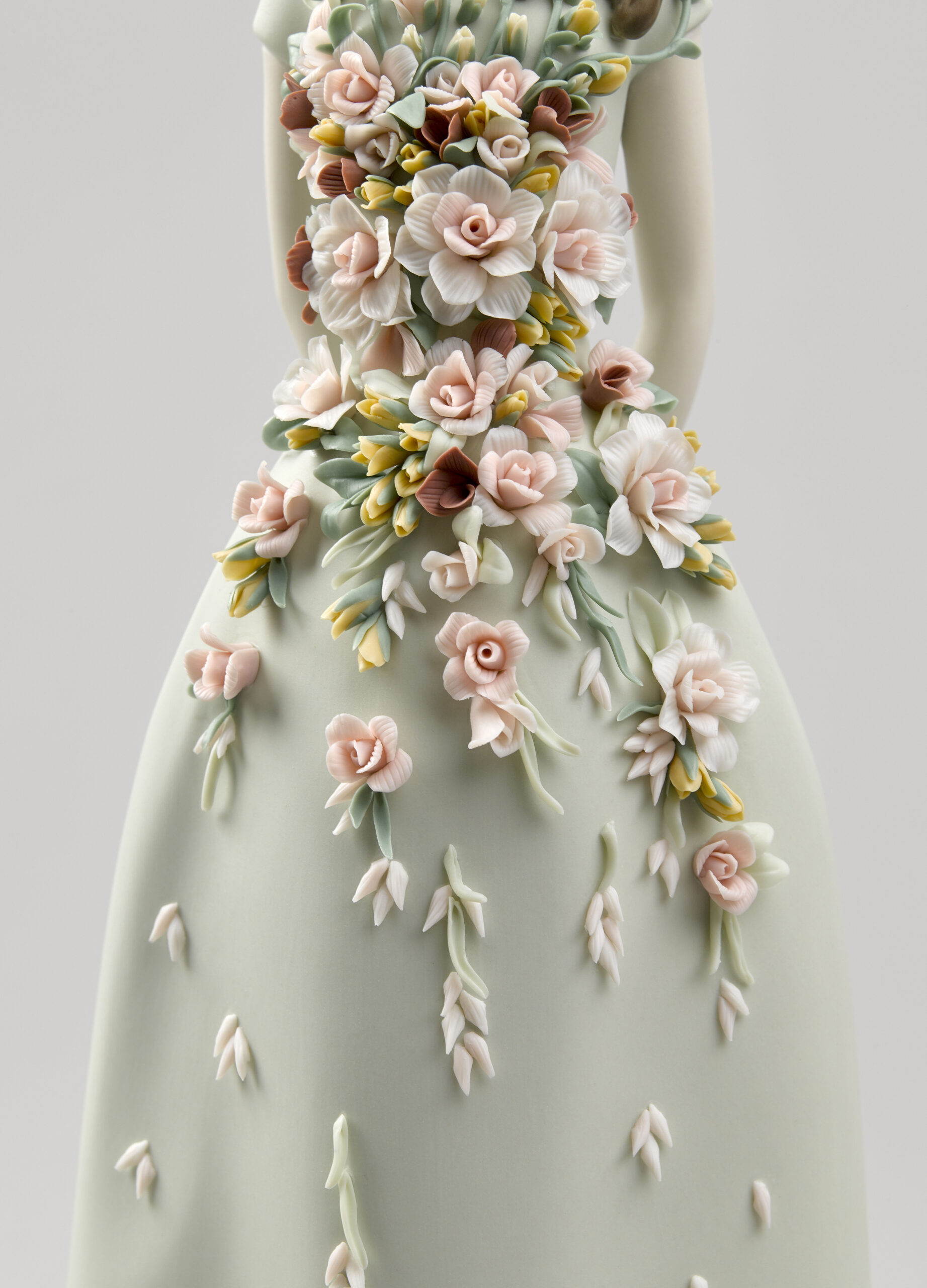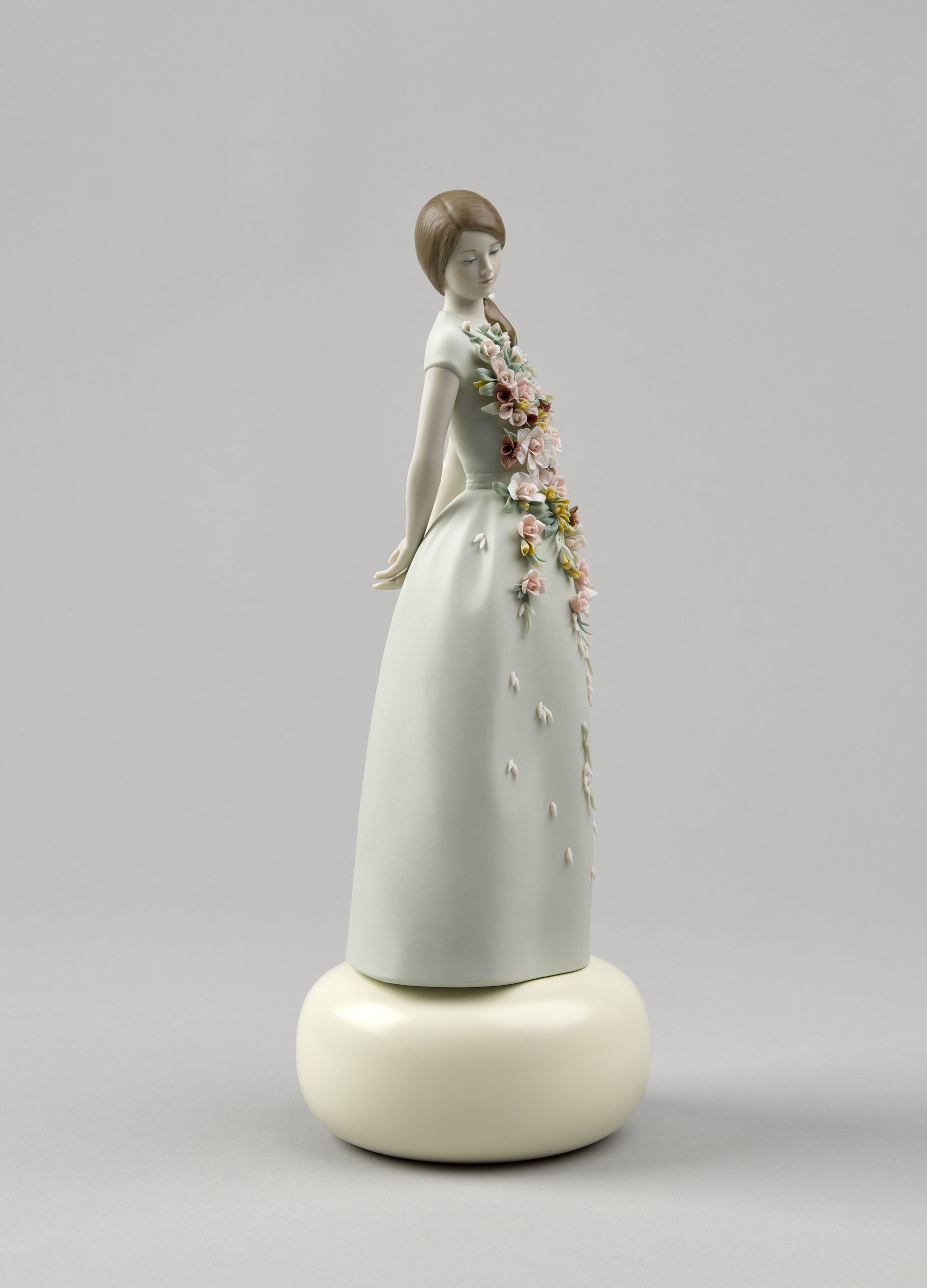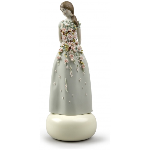 Sweet Elegance is a porcelain figurine inspired by Italian fashion of the 1950s and their cheerful summer frocks. In that decade, after the austerity of the war years, women wanted to express their sensuality again, but always tastefully and modestly. In matte finish porcelain. The aquamarine green dress is gathered at the waist with a floral application in candy colours, inspired by the gardens of the Alhambra. The floral decoration consists of 54 leaves, 56 buds, 28 roses with 5, 7, 10, and 14 petals, 5 sprays, and 70 decorative seeds.