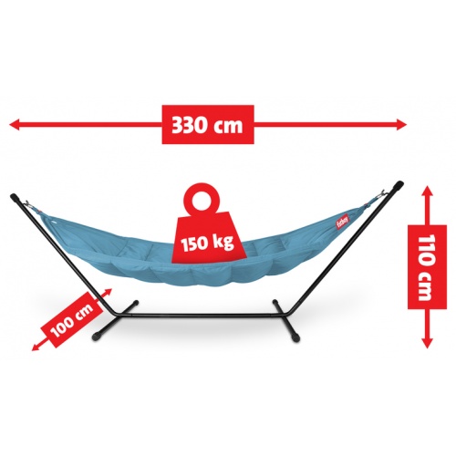 Hammock: 270 x 138 cm.Frame: 330 x 100 x 110 cm.Hammock: 10,9 kg.Frame: 12,9 kg.Hammock + frame: 23,8 kg.
