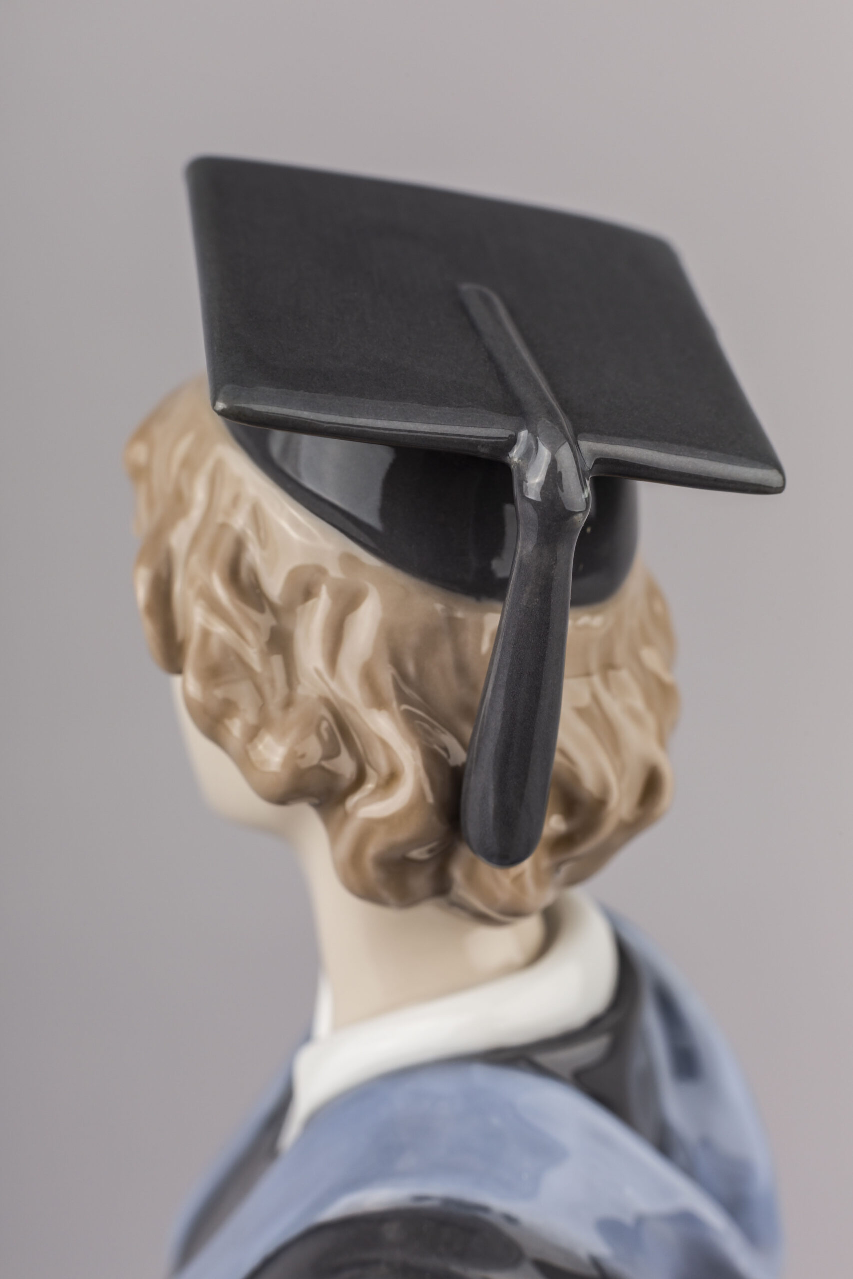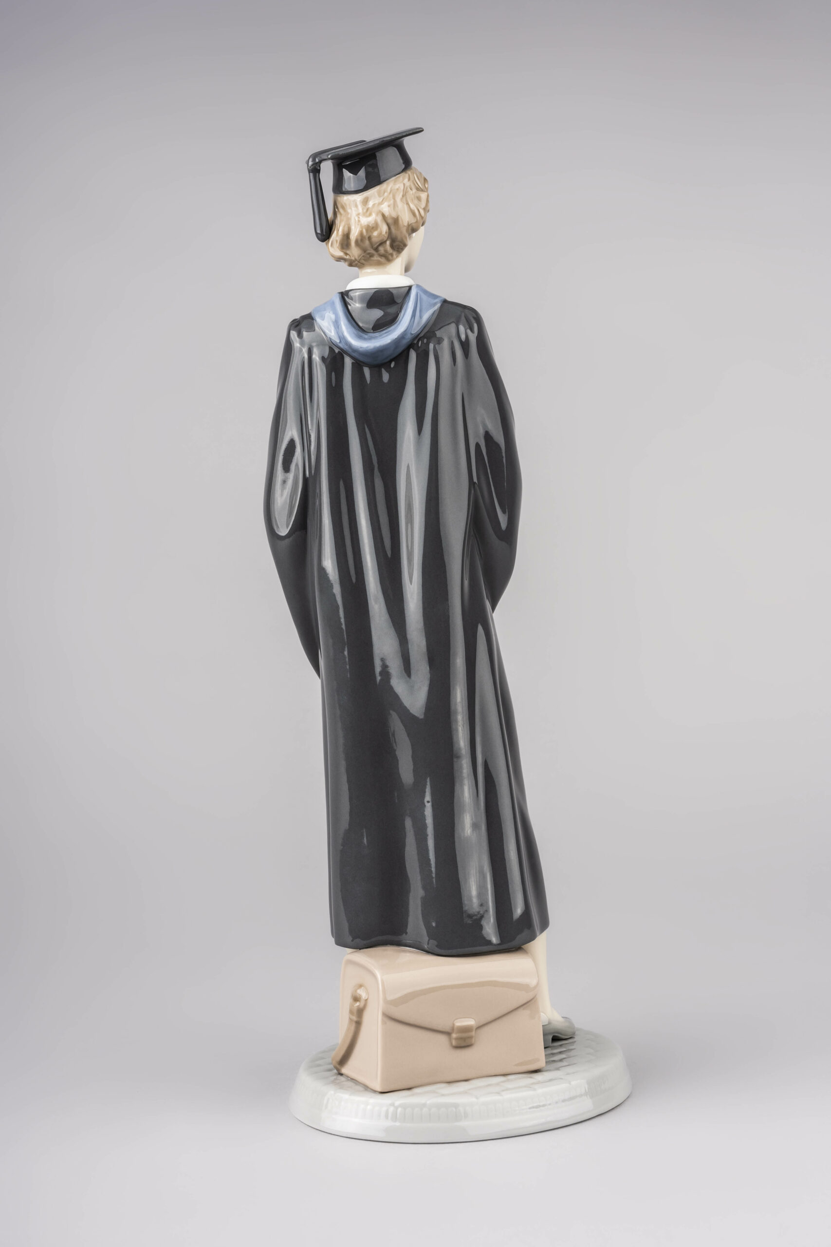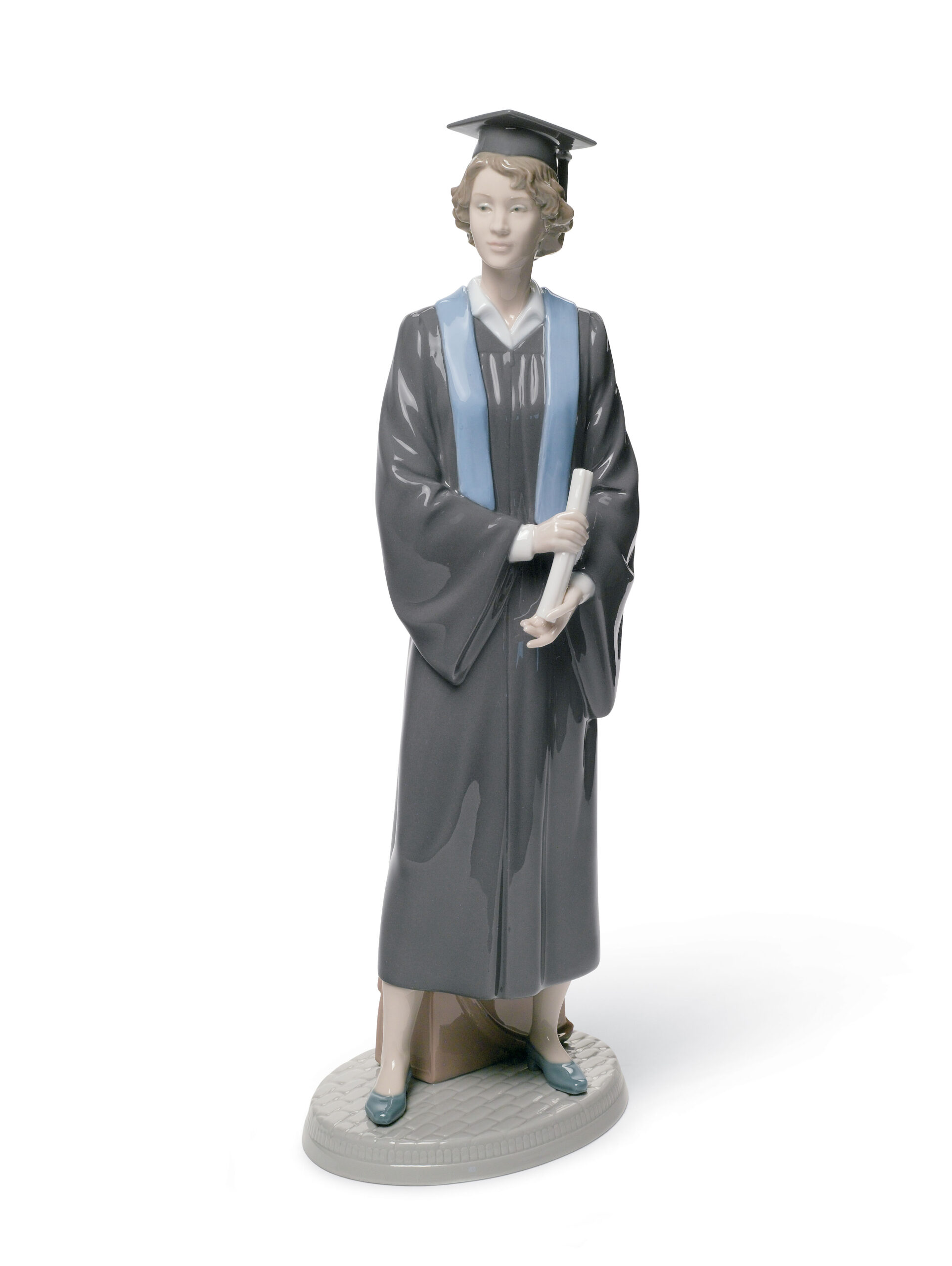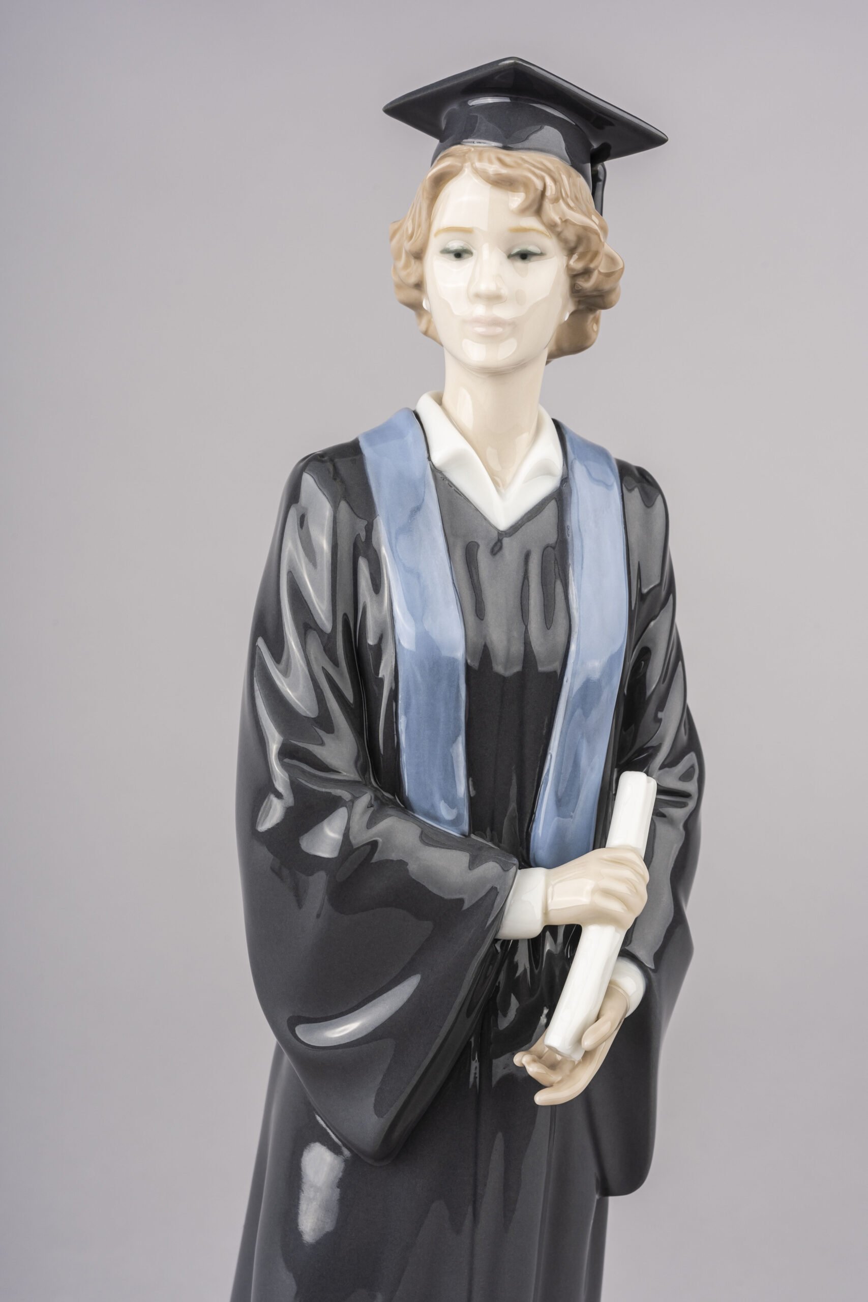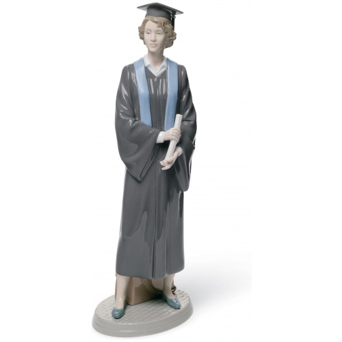 This young man displays all the typical features of a graduation: the black gown and mortarboard, the blue stole in the gown and the diploma in his hands. His face, which highlights the maturity of someone who has achieved something important, is excellently modelled and highly appealing. Available in male version (ref. 01008397). These pieces replace two already sold-out and discontinued pieces: 01005198-01005199 (sold between 1984 and 2007)