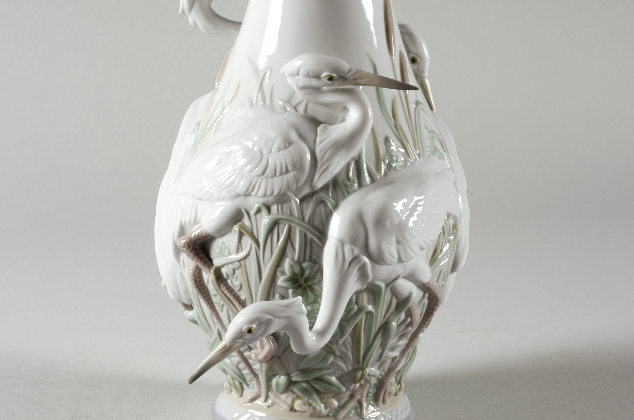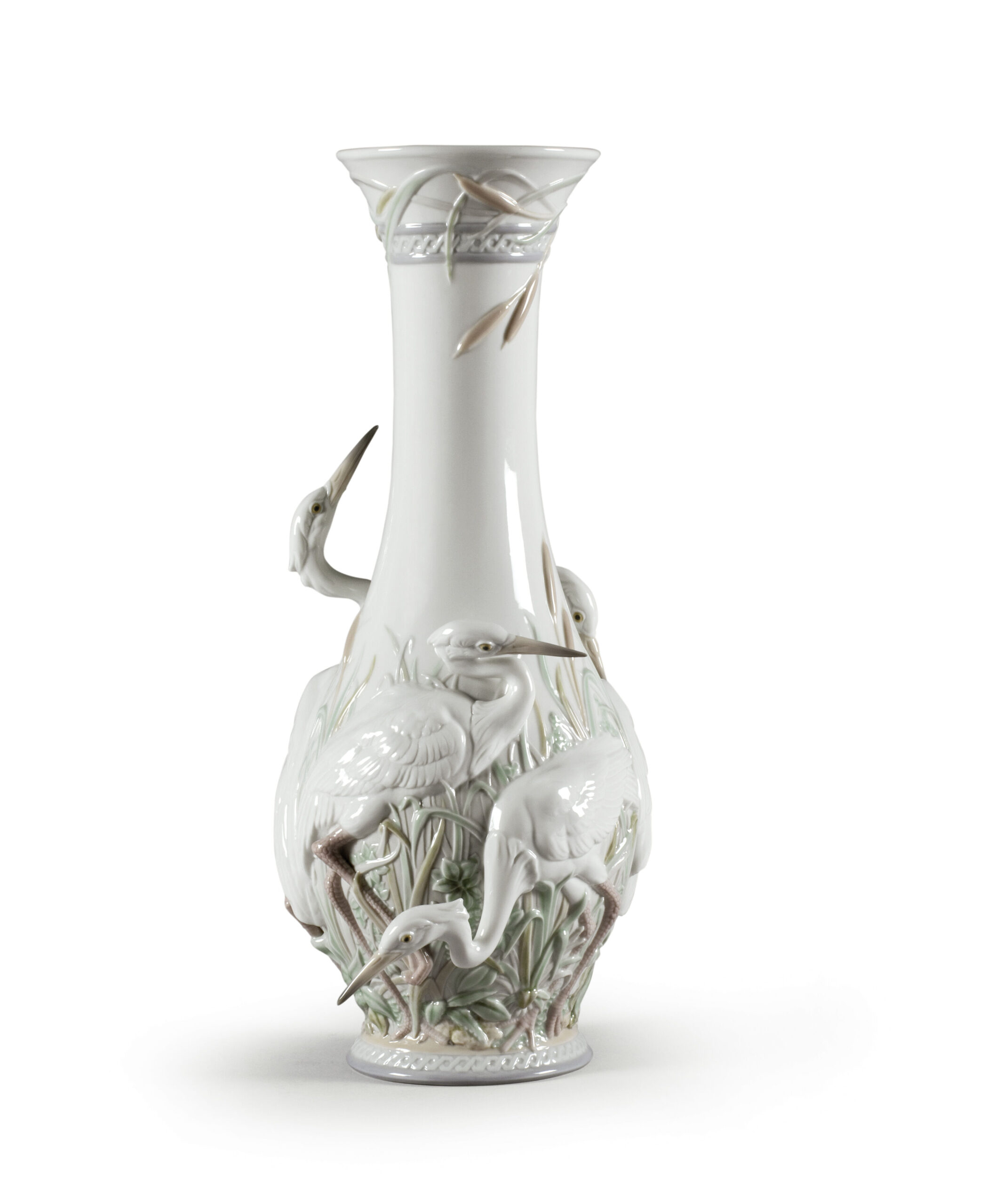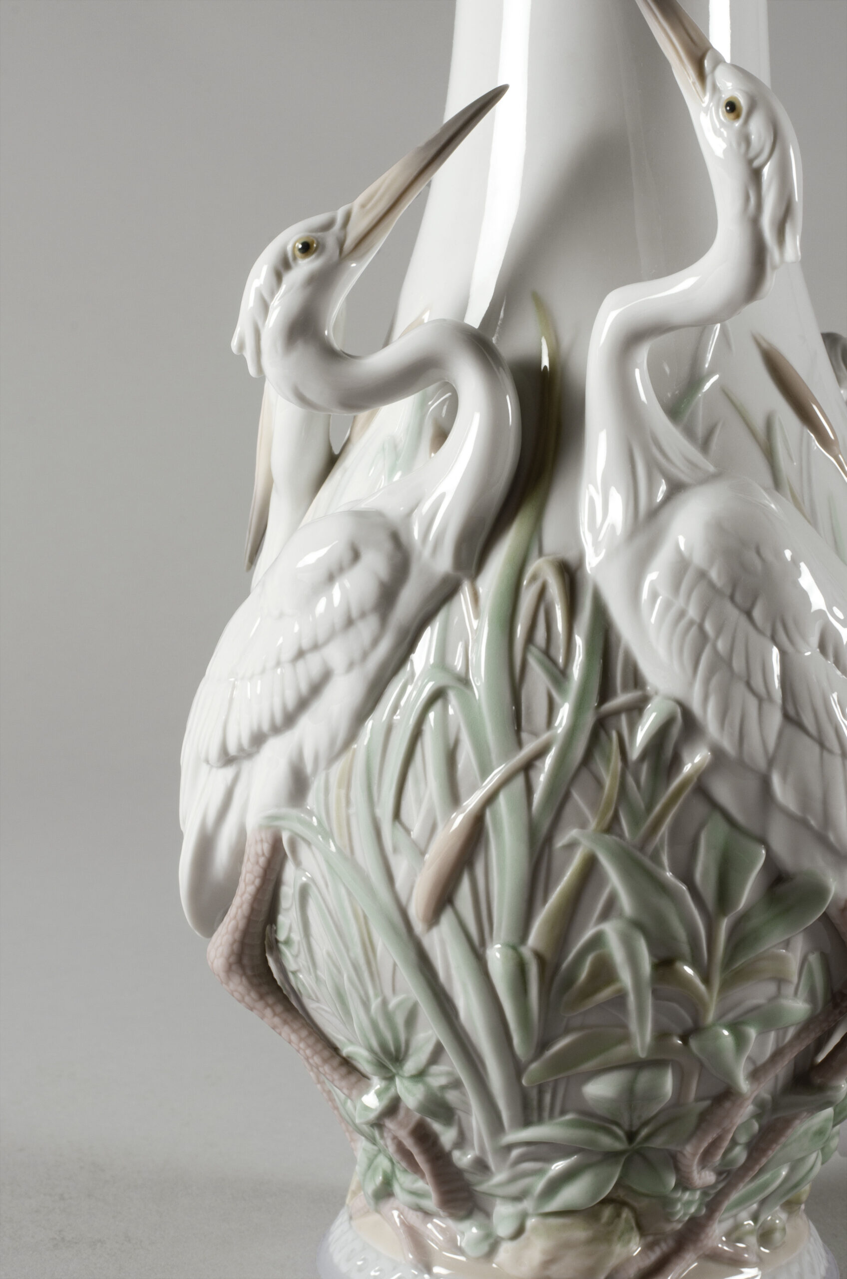 The elegant and stylised forms of these herons and the plant motifs of the modernist-style reeds are the stars of this precious vase, masterfully decorated in high relief by the artists of LladrĂ³. A glossy porcelain piece, finished in soft pastel colours.