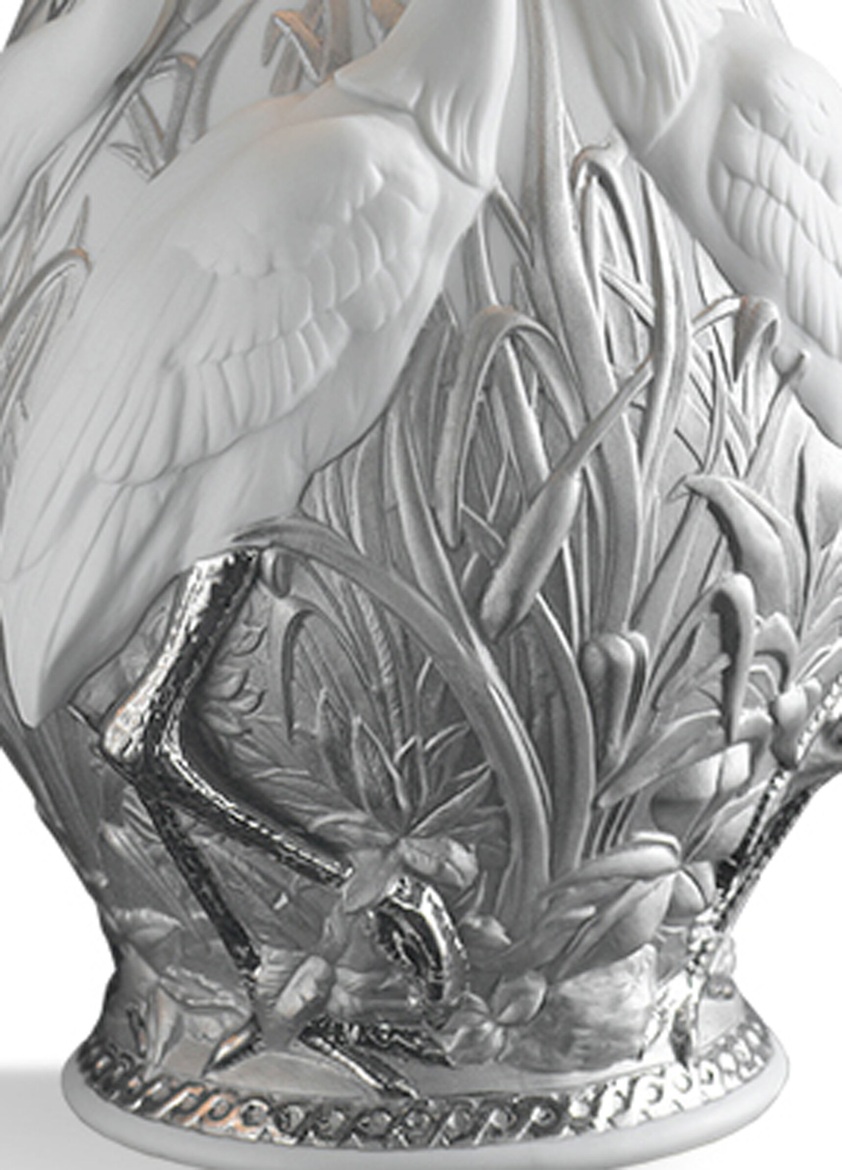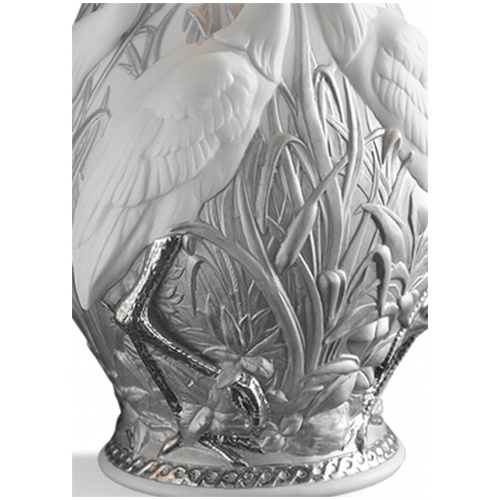 LladrĂ³ table lamps combine functionality with beauty and sculptural perfection. In this design of classic shapes, the base is a vase decorated with a relief that shows elegant herons on a richly decorated background of plants. The white of the porcelain contrasts with the silvery luster in a harmonious combination. A perfect decorative complement for all types of environments.