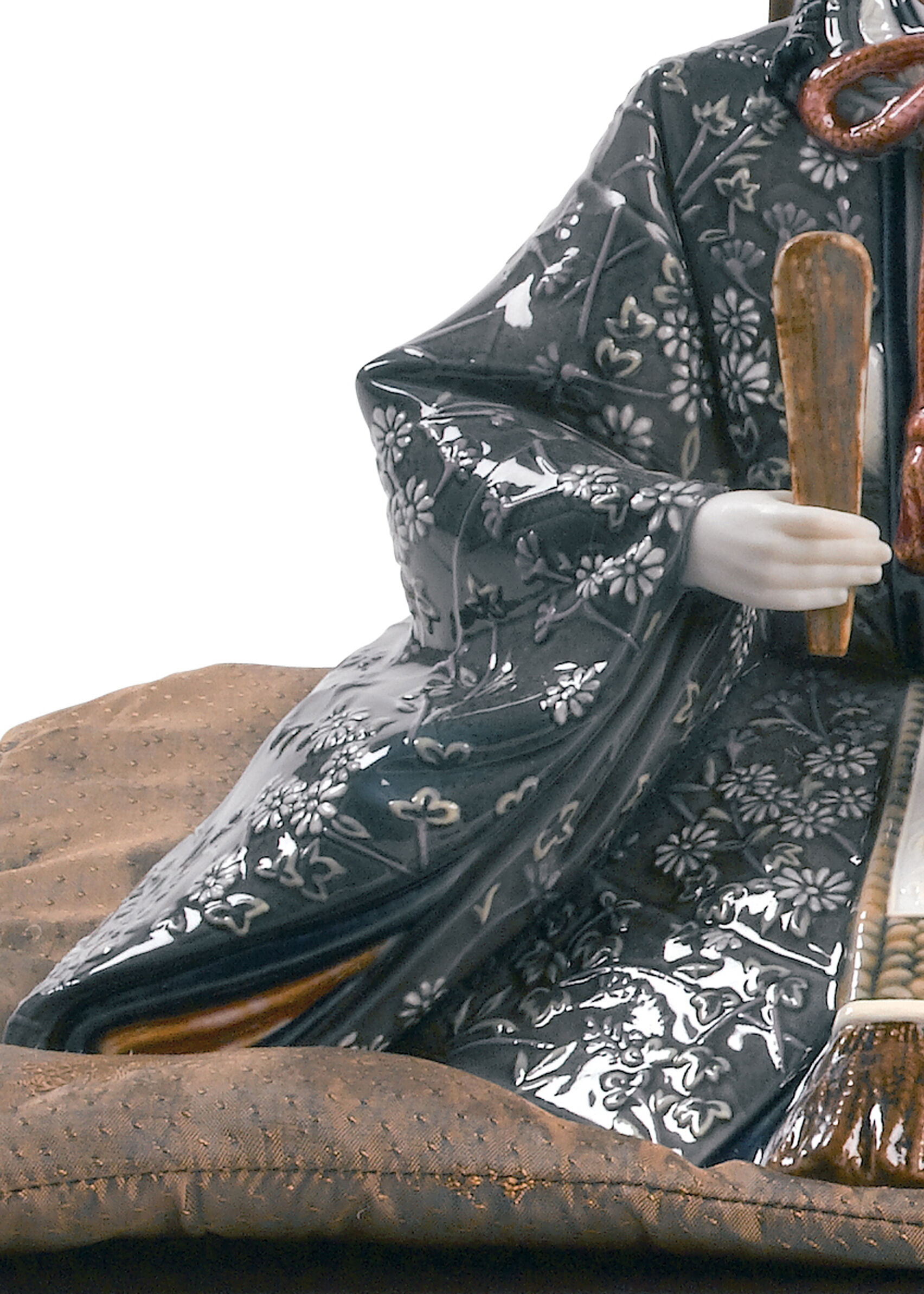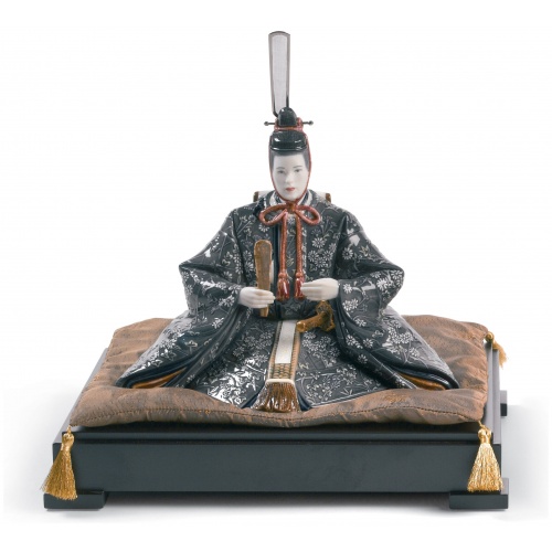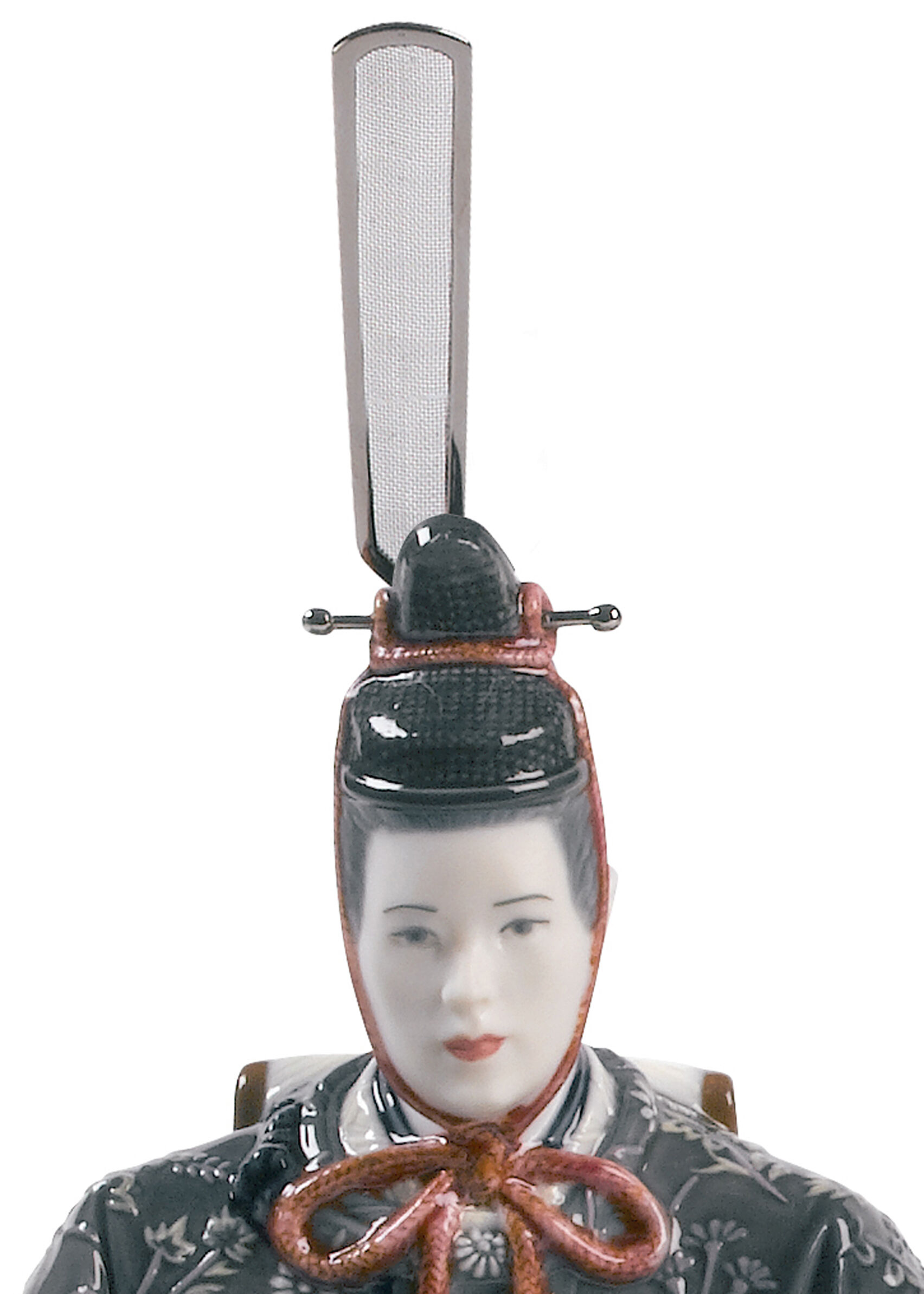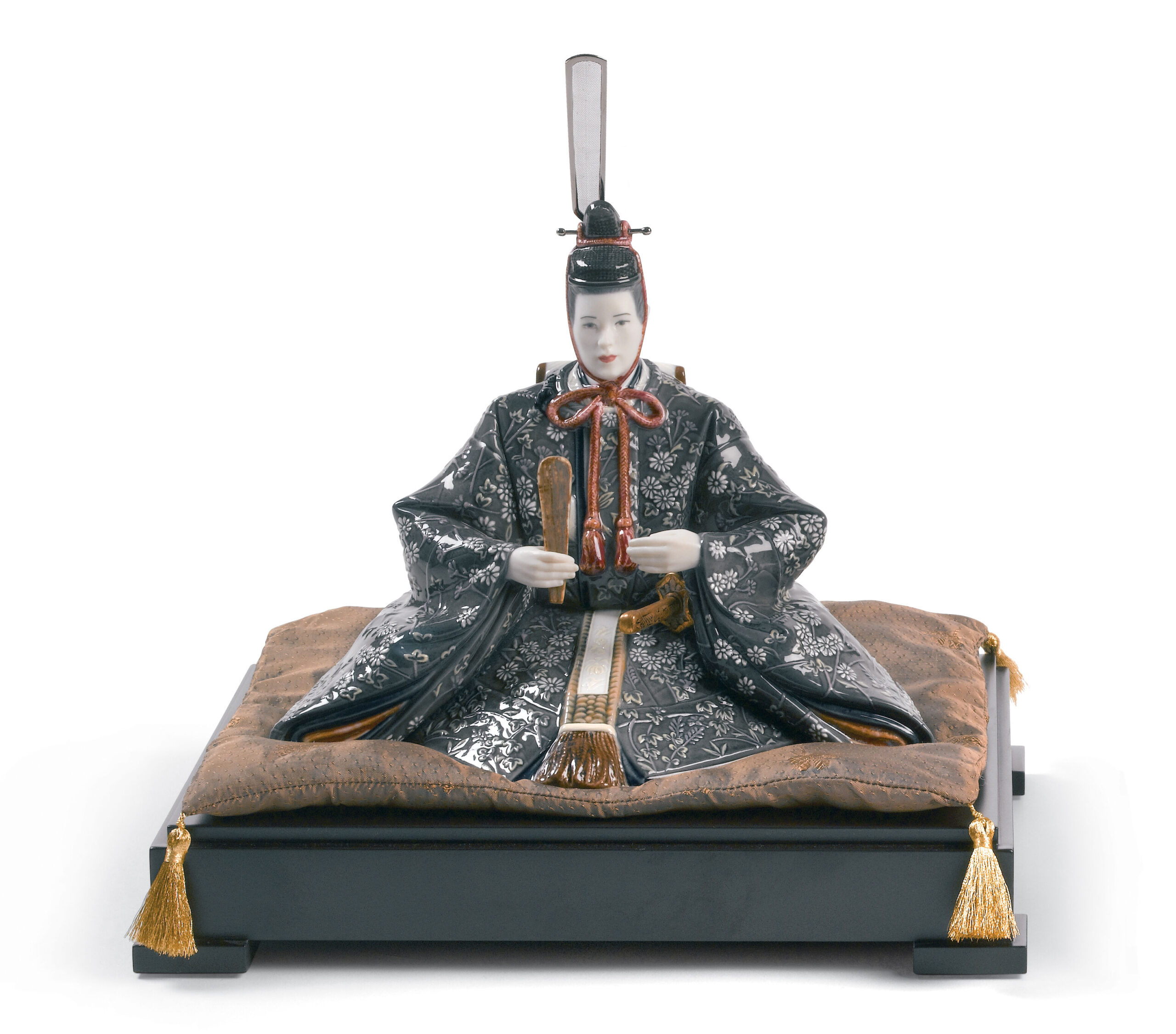 Hina Dolls – Emperor is an exquisite piece of High Porcelain with delicate and meticulous embellishment, inspired by an ancient Japanese tradition. It is a piece destined to become a veritable family heirloom. This emperor represents one of the leading figures of Hina Ningyo, a composition of figures placed upon a stage, where girls are given away in Japan every 3 March at the feast of Hina Matsuri to assure them a happy life. This limited edition, which pays careful attention to the smallest details of the garments worn by emperors of the Japanese court during the Heian period, forms a pair with Hina Dolls – Empress. On a decorative level, the reproduction of the richness of embroidered fabrics is highlighted, as is the image of traditional Japanese fabric simulating Damascus silk, which transforms the piece into a little jewel. In terms of the richness of the colour palette, this creation surpasses the classic Lladró palette and introduces more intense colours. The dark colour of the dress and the decorative details in three tones are emphasised, applied by hand through a painstaking process which enables them to stand out against such an intense background.