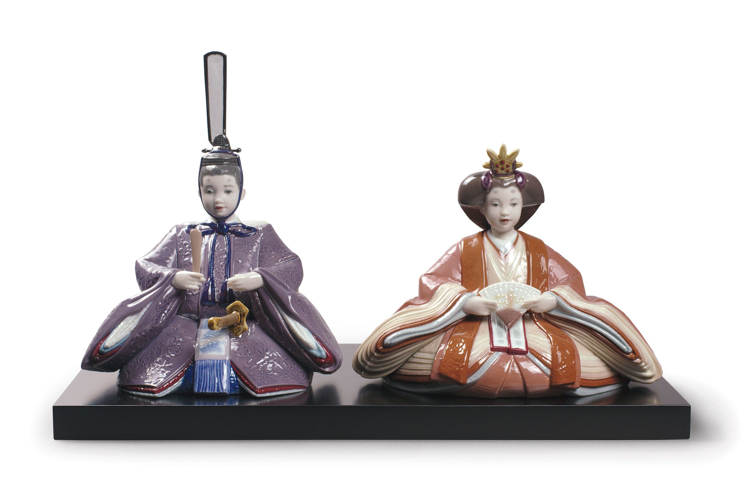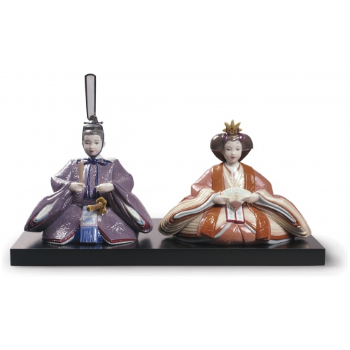Royal couple that form part of a composition to celebrate one of the most popular Japanese traditions. Every 3rd of March, as part of Hina Matsuri celebrations, girls are given Hina Dolls, which are placed together on a stand to create the Hina Ningyo, granting the girls a happy life. This piece is distinctive for the characters’ child-like features. Their kimonos are a faithful and finely executed reproduction of those worn in the Japanese imperial court of the Heian period.