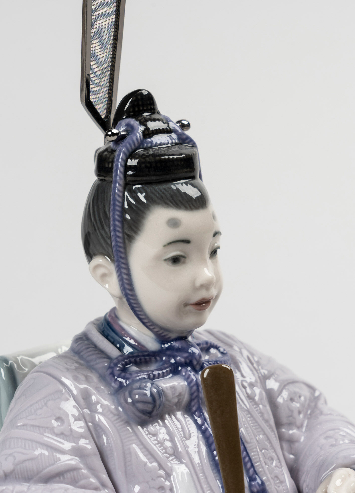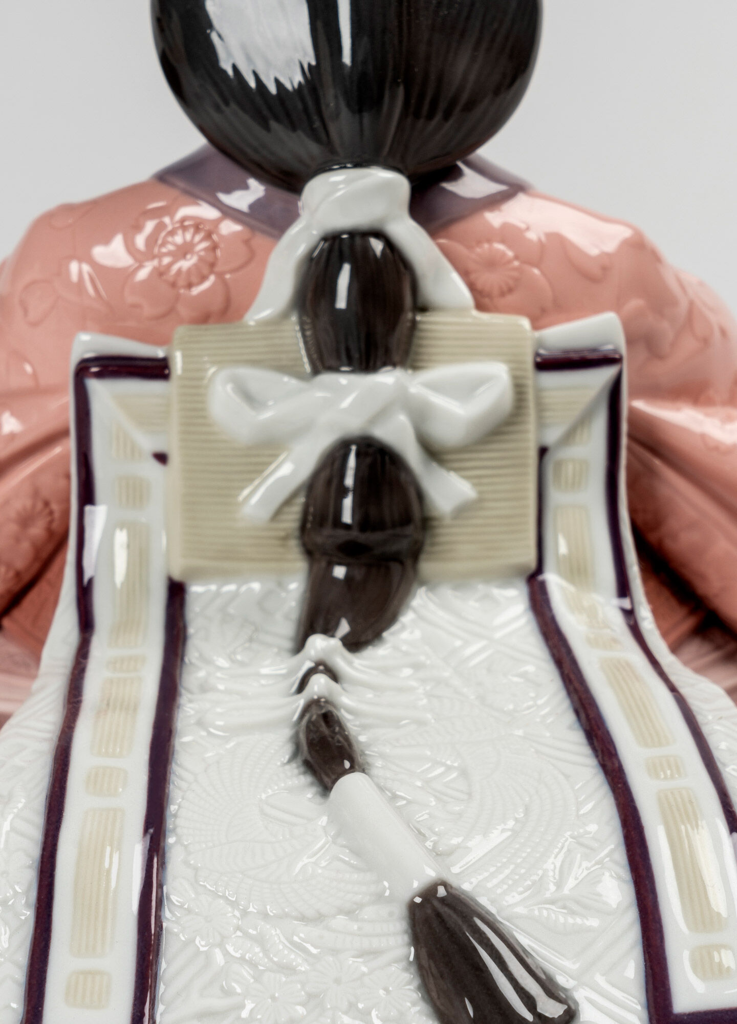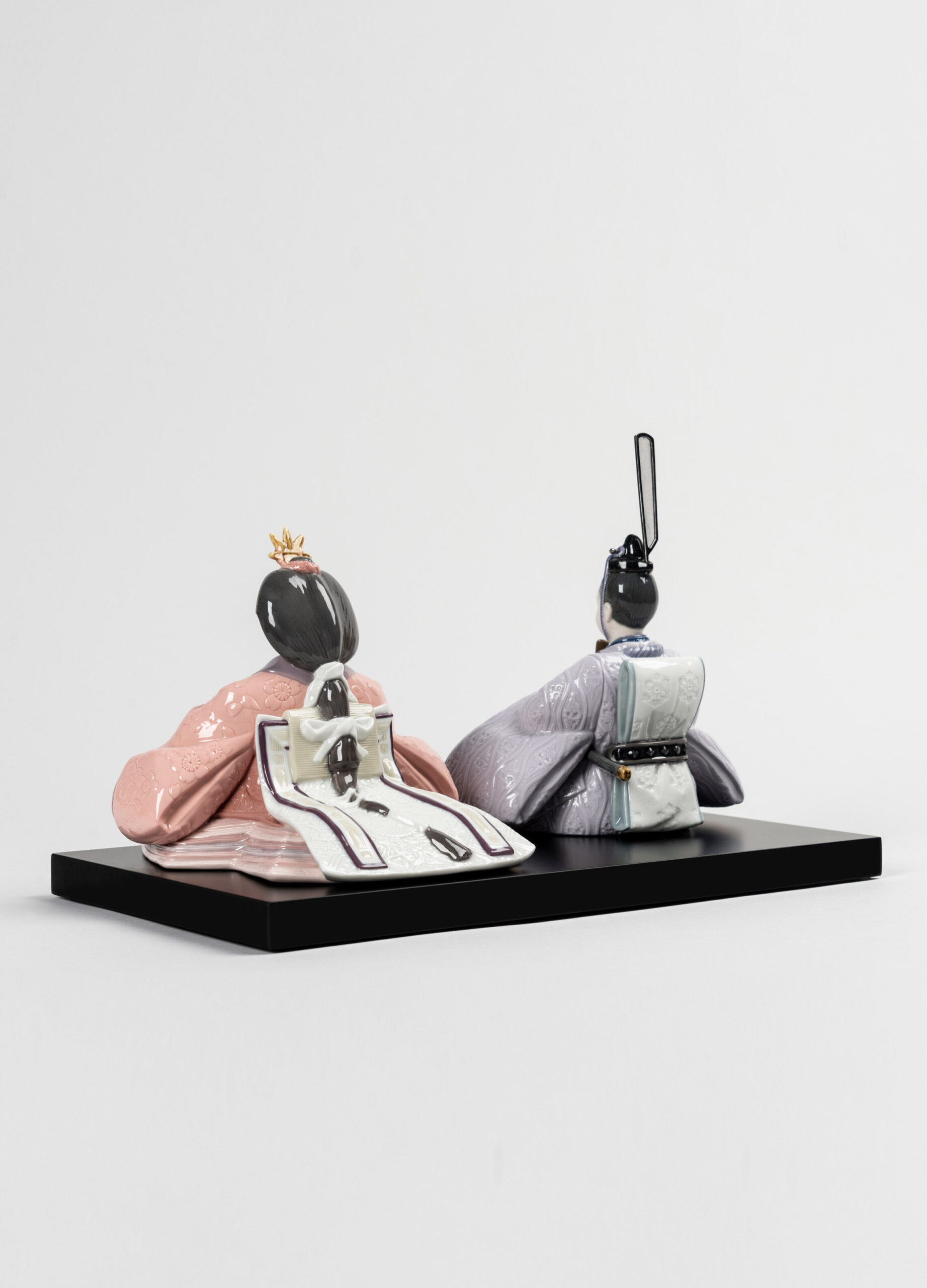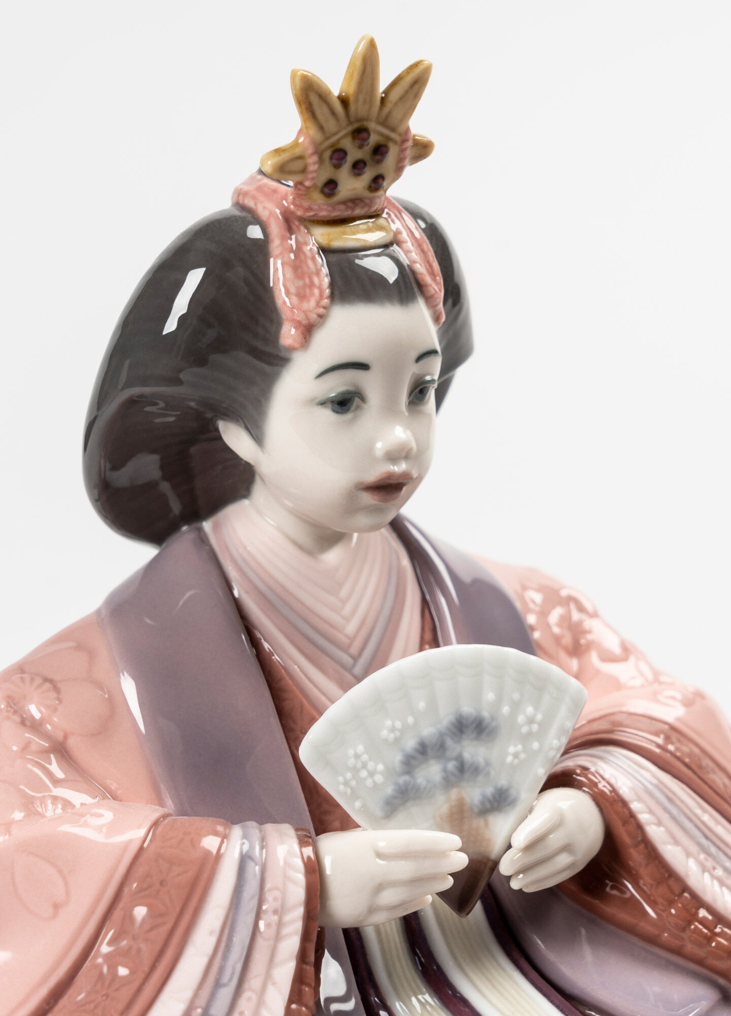 Made in glazed porcelain, this version of Hina Doll is noteworthy for the sweet, child-like features of the emperors. Their kimonos faithfully reproduce the details and preciosity in the execution of the original costumes of the Japanese imperial court during the Heian period.”