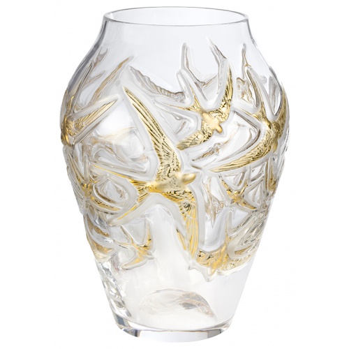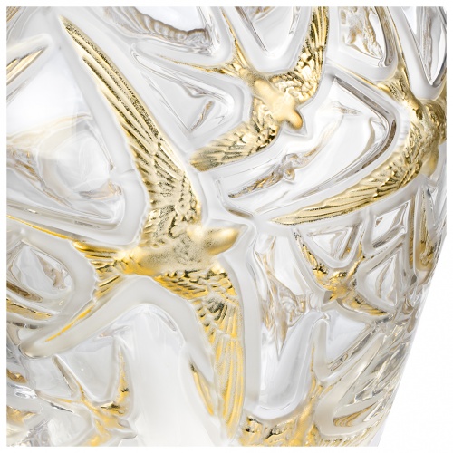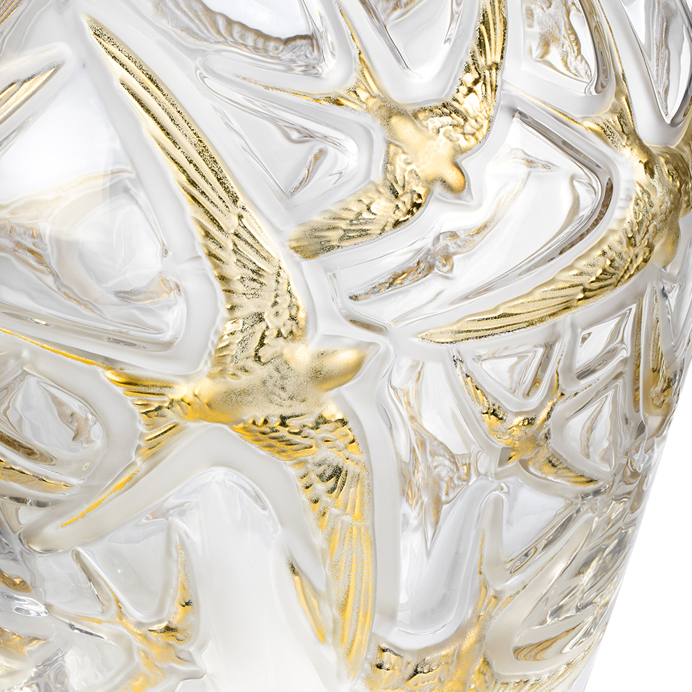 Directly inspired by a creation of René Lalique, this vase depicts the beauty of swallows taking flight. With grace and lightness, they spread their wings with finely chiselled feathers. Illuminated with gold, they twirl around, drawing the eye into swirls of crystal. This limited edition of 130 pieces majestically celebrates Lalique’s 130th anniversary.