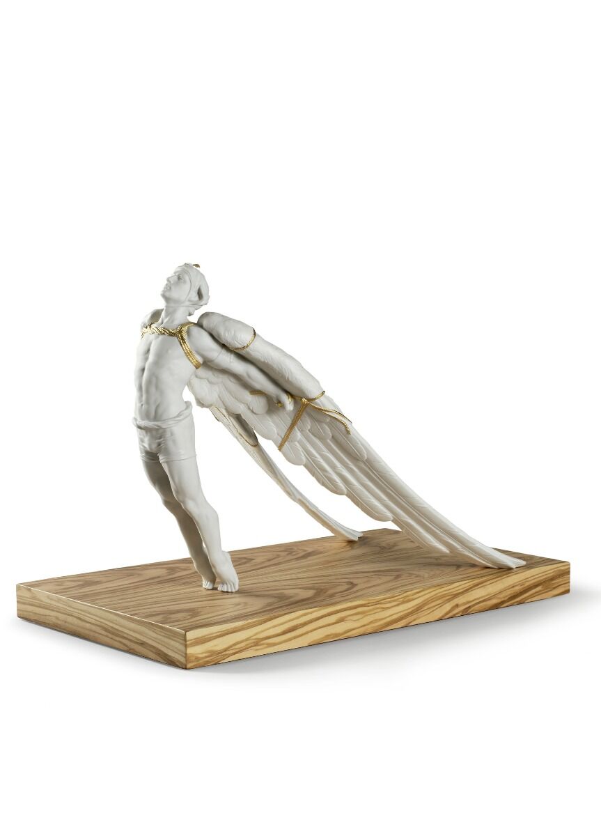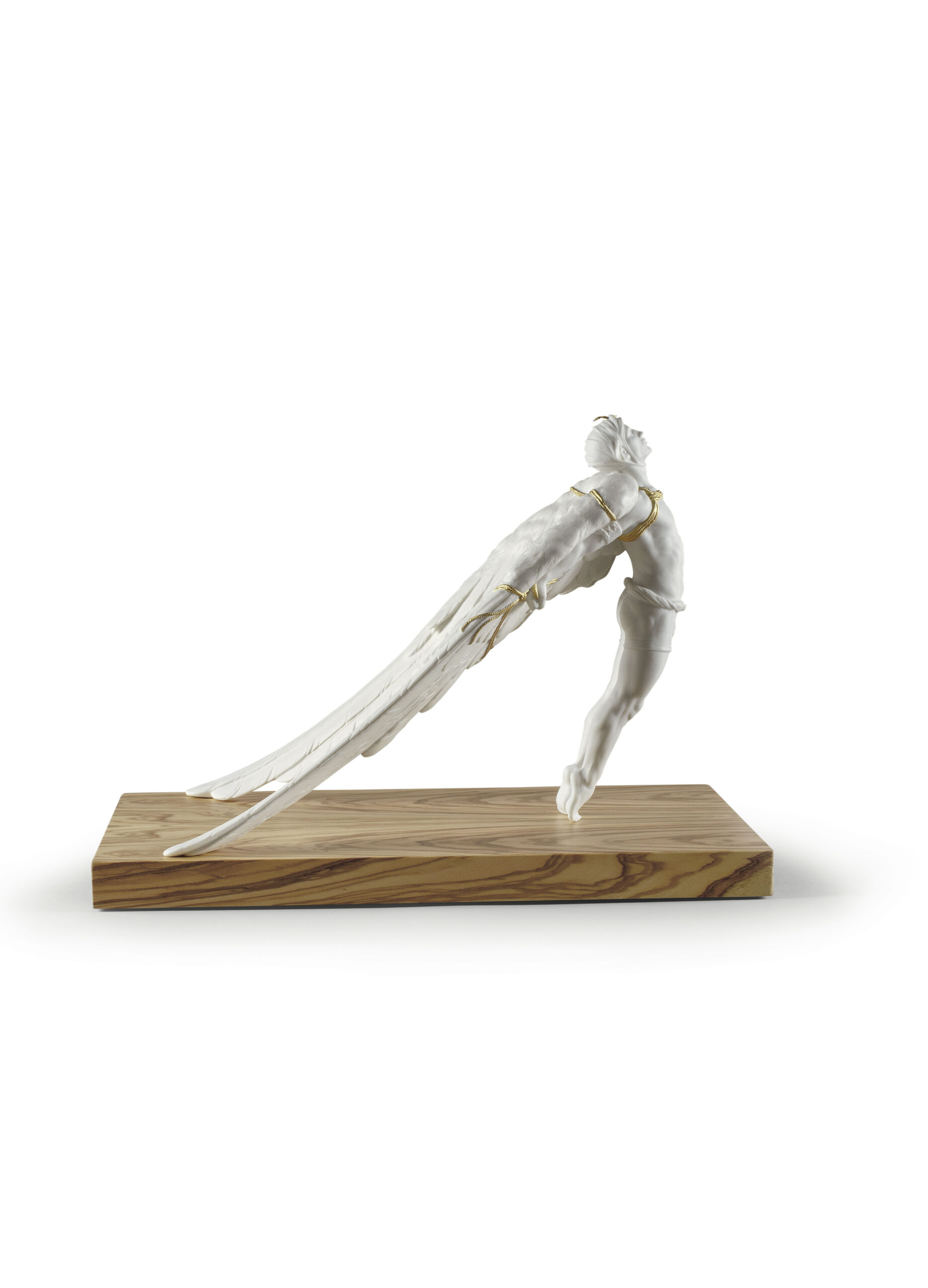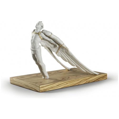 This creation depicts Icarus in his attempt to fly too close to the sun, a symbol of determination and the desire to go further. A piece of white matte porcelain with details of golden luster. This sculpture is a true display of artistic and technical balance, with great decorative potential. Handcrafted in Spain.
