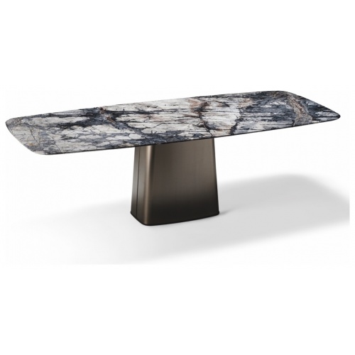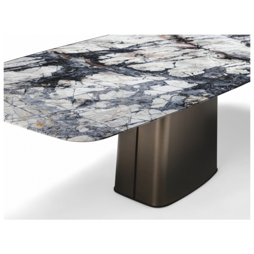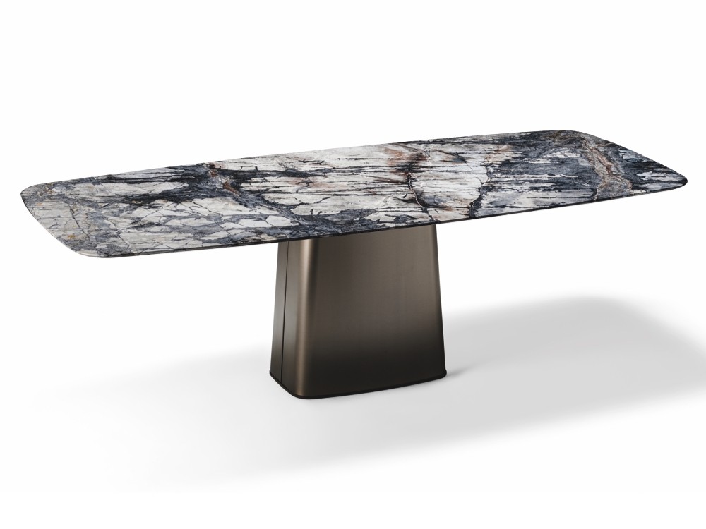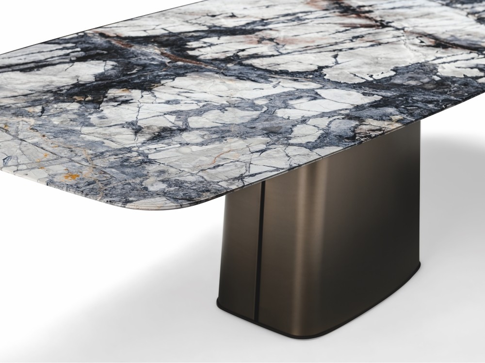 The Icon table is distinguished by its striking titanium pillar upon which its supports a gorgeous marble top riven through with nature’s inky veins.