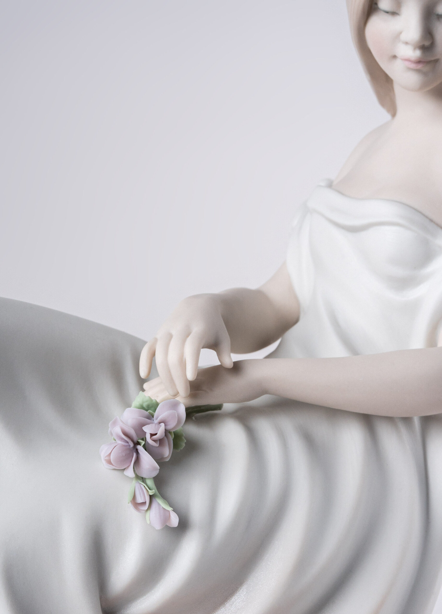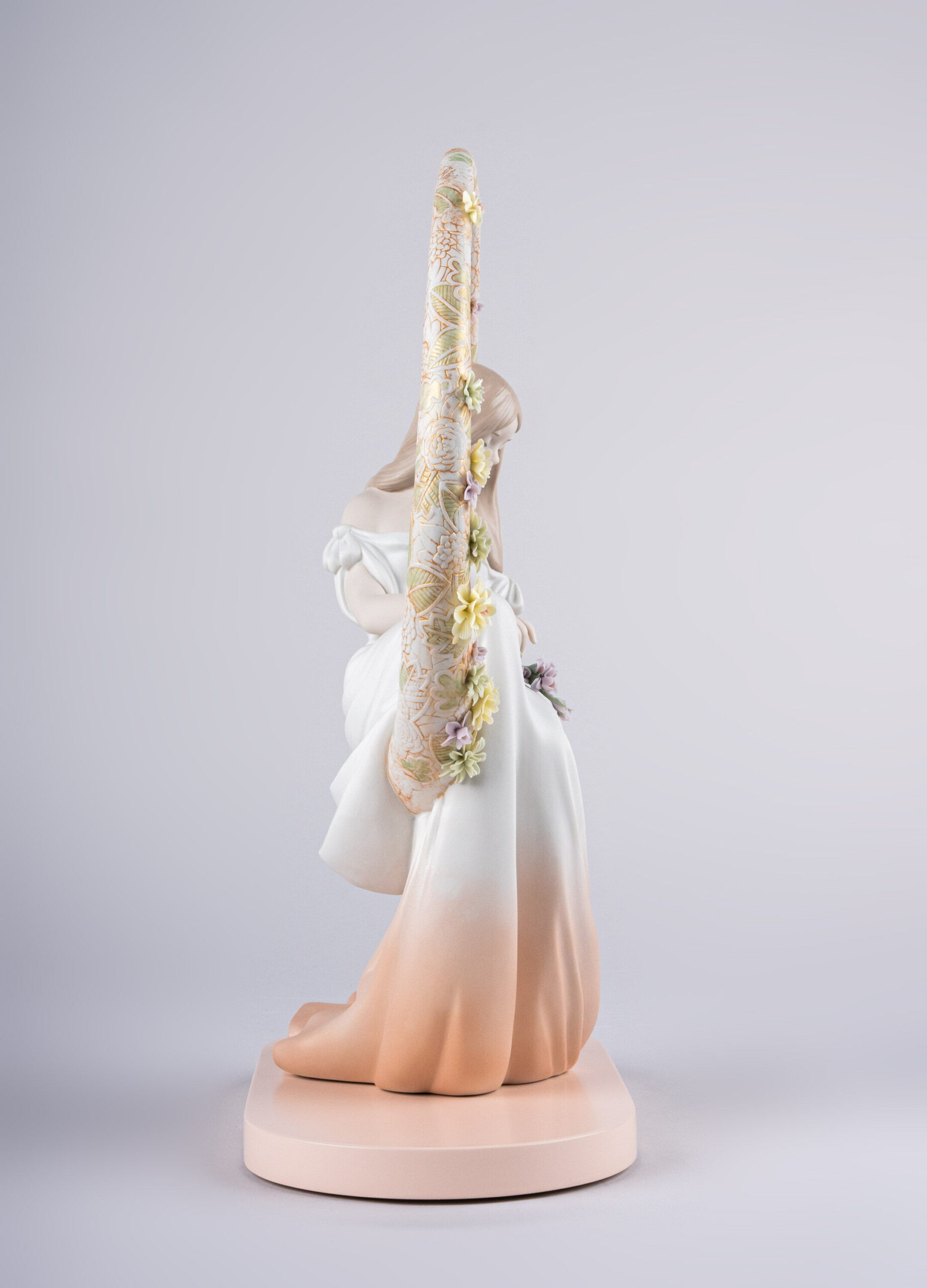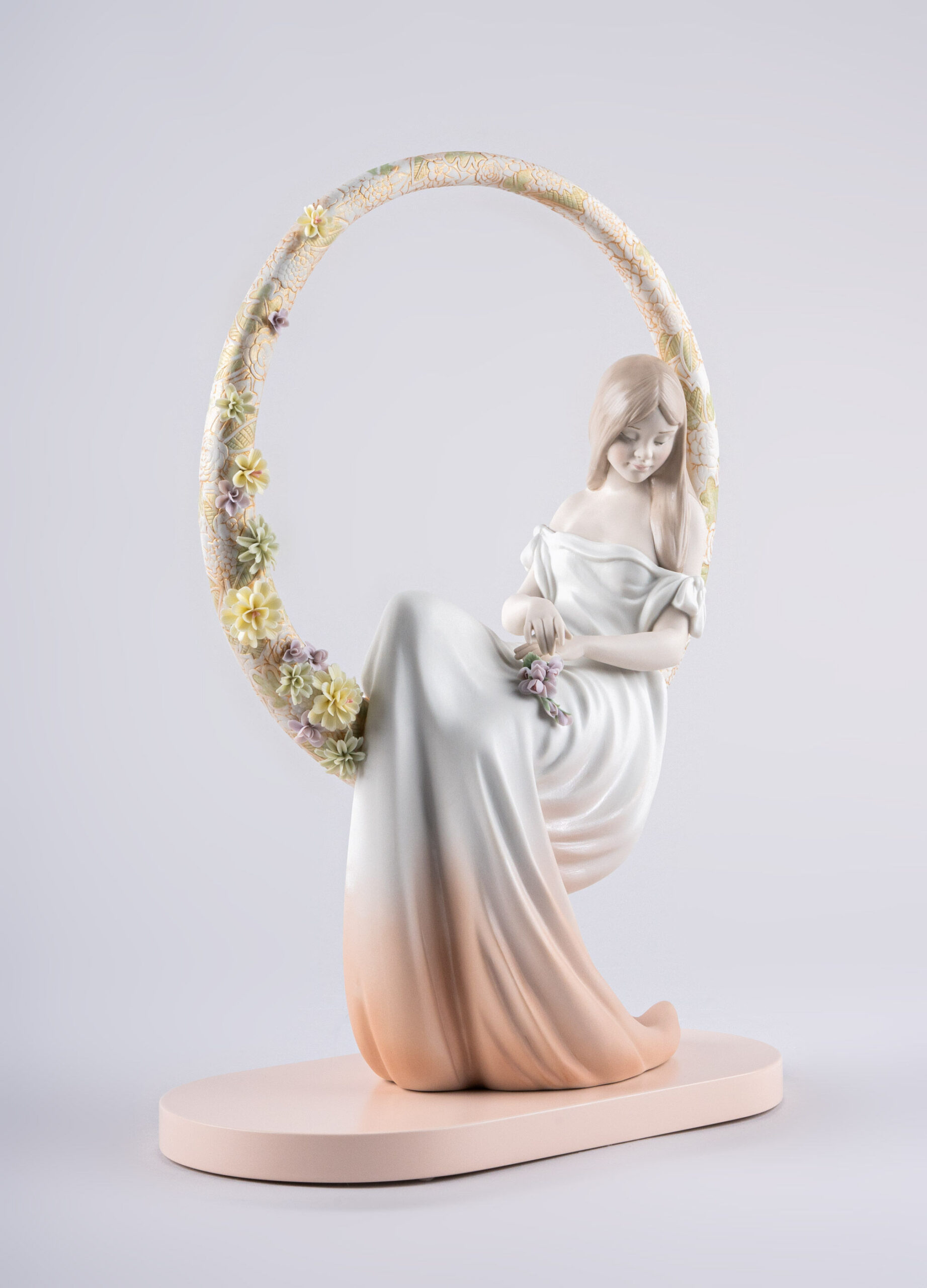 This woman, lying in a flower-laden arch, speaks to us of those wonderful moments when you truly disconnect and let your mind wander. Made in matte porcelain and decorated with soft colors, metalized effects and flowers, it conjures up a scene that makes us feel a connection with nature and at once conveys a sense of peace and harmony.