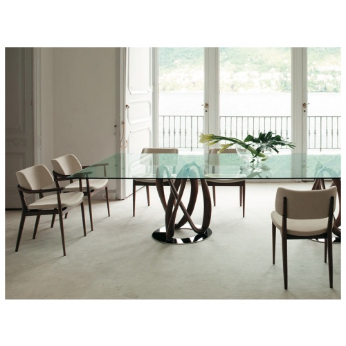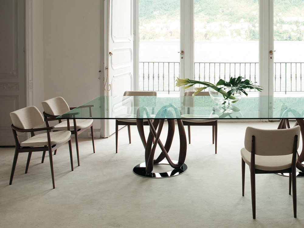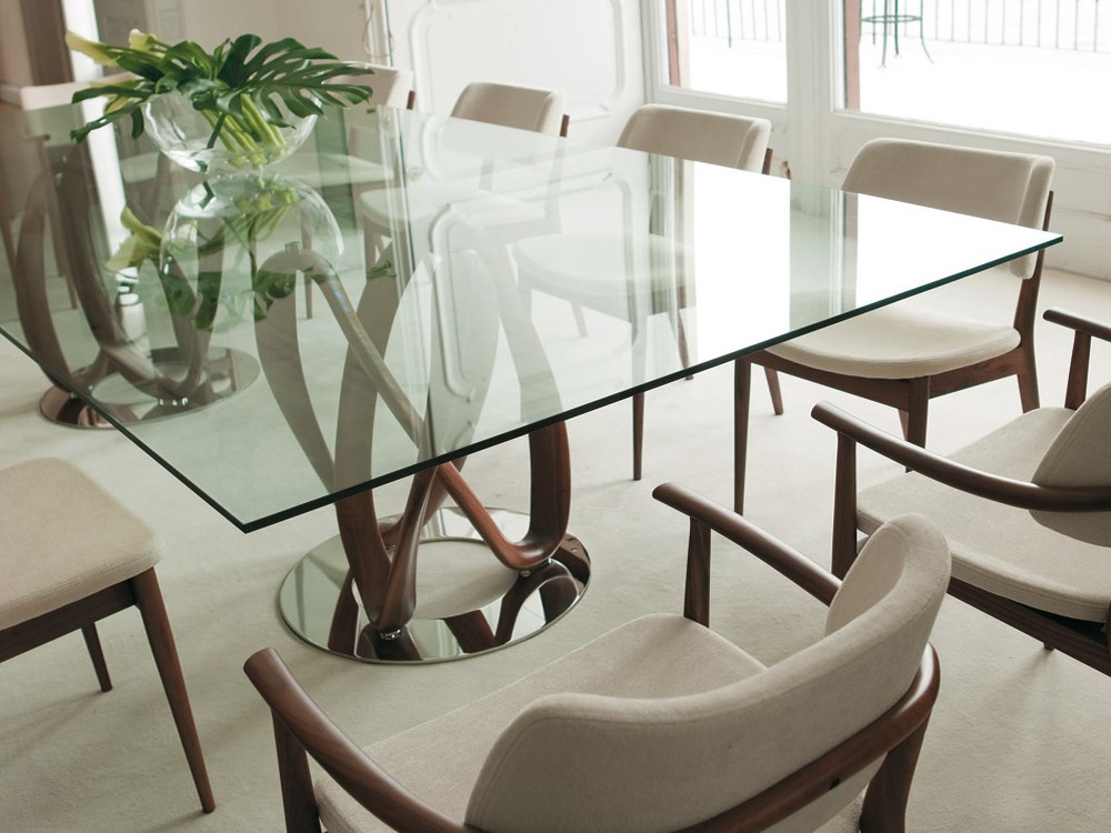 Contemporary dining table designed by Stefano Bigi for Italian manufacturer Porada. This eye-catching rectangular glass dining table features an elegantly sculpted base and is available in Canaletto walnut.