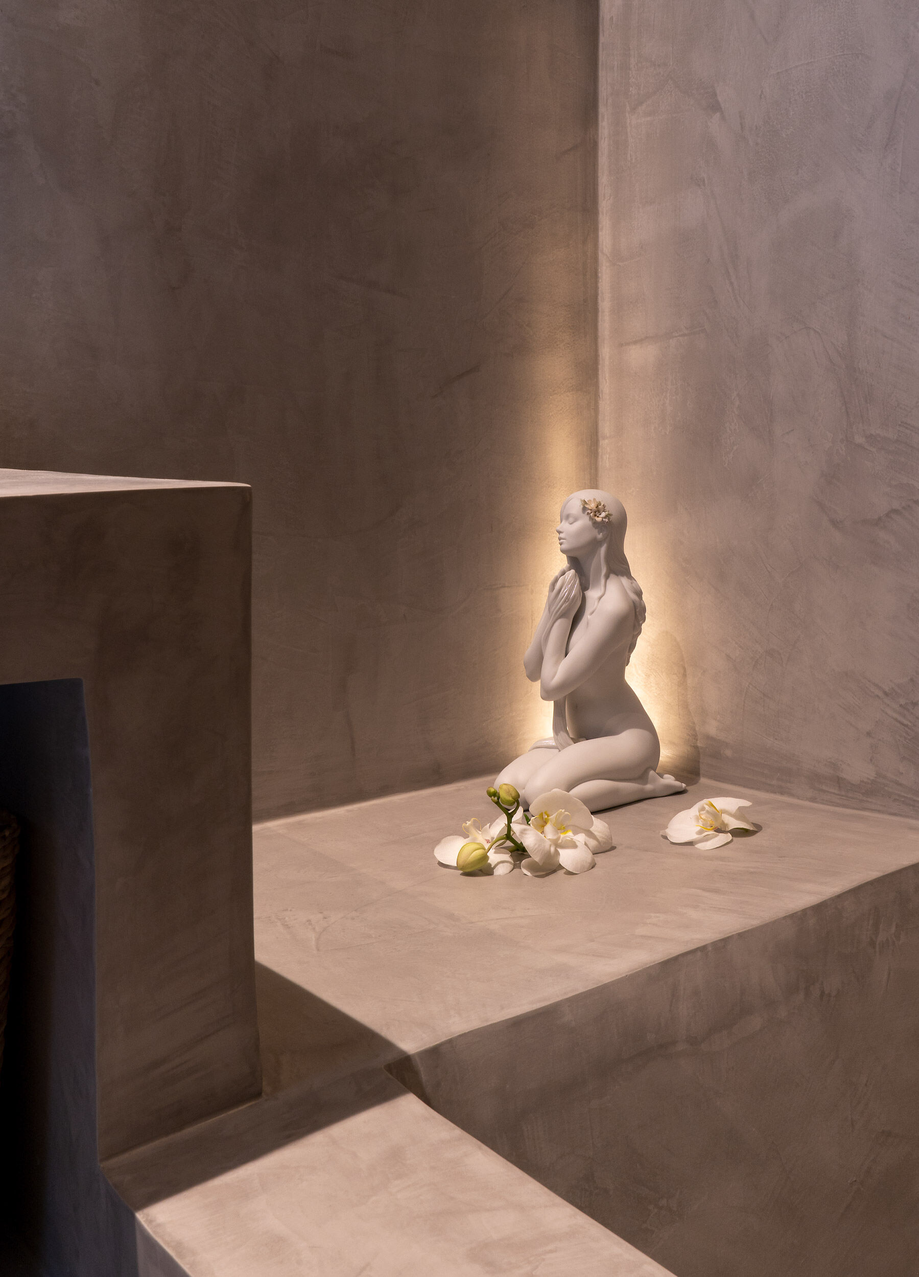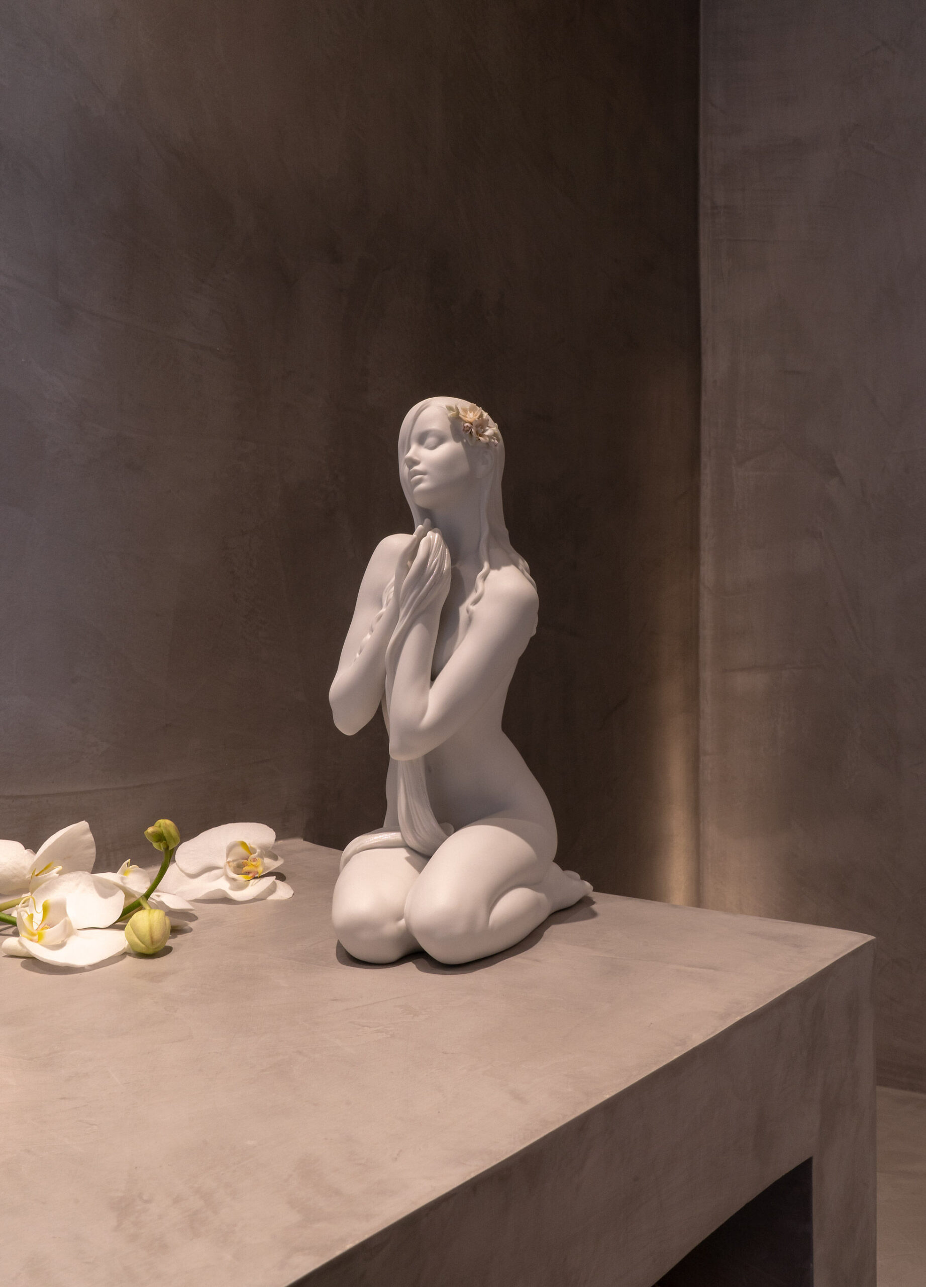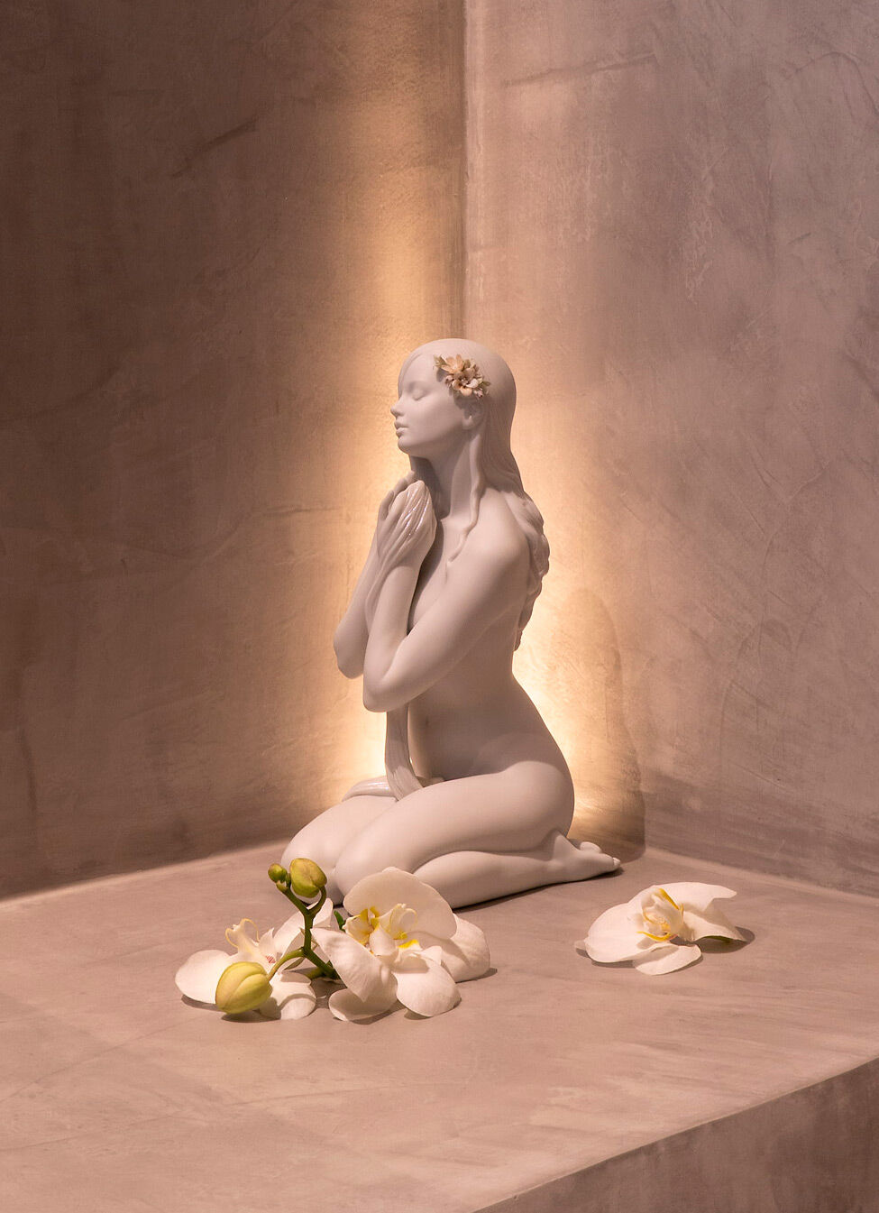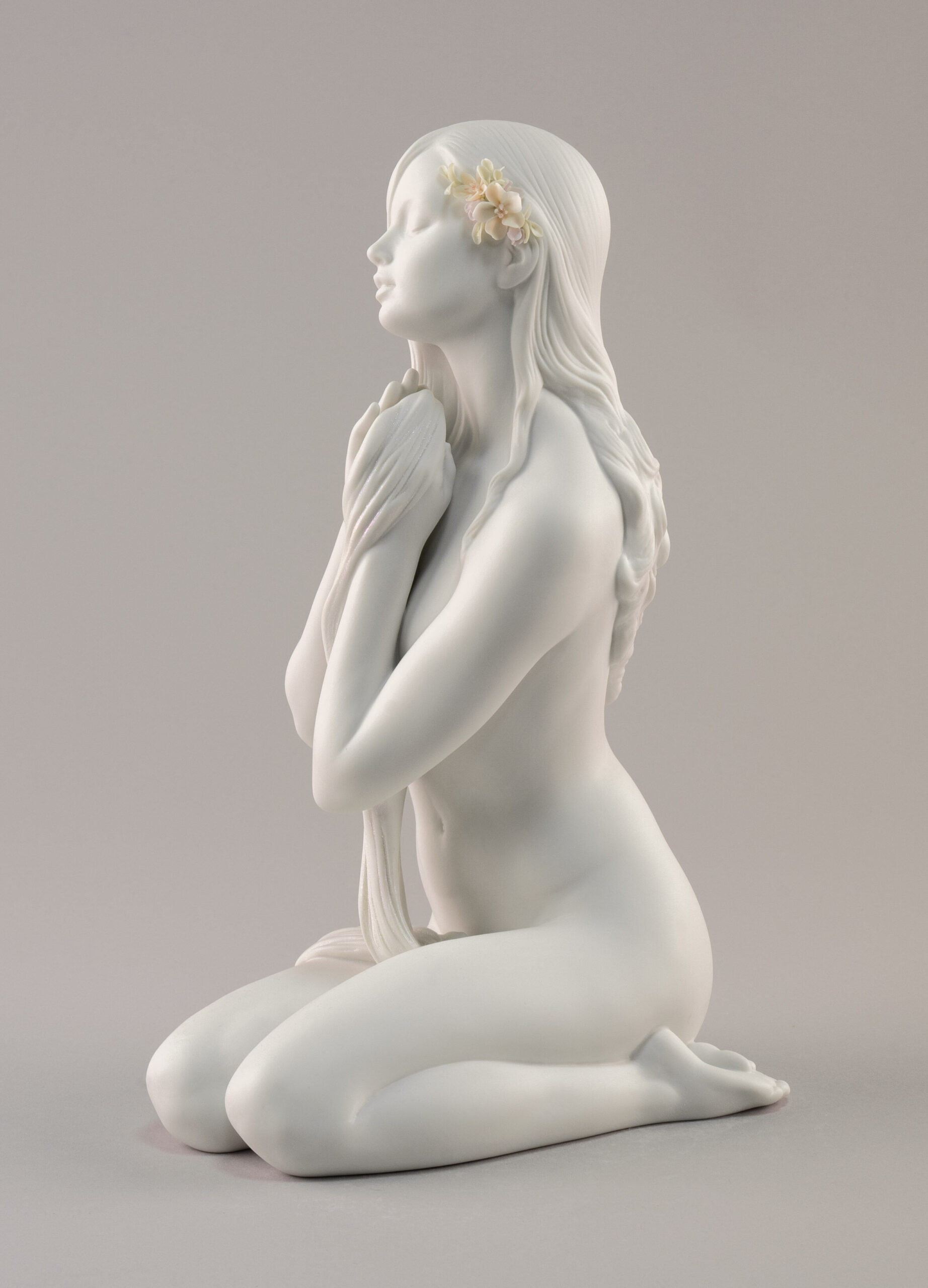 Inner Peace represents a woman in a moment of peace and calm, looking after herself. Made in matte white porcelain, it conveys the naturalness and purity of the material and, at once, enhances the sculptural wealth of the piece. The 5 white flowers, decorated in pastel tones, which she is wearing in her hair, are handmade petal by petal.