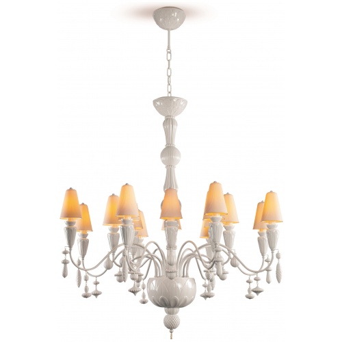 Chandelier with sixteen lights inspired by plant motifs, interpreted by means of rounded, organic and geometric lines. In the design of the collection, synthetic, feminine, lathed, edgeless shapes predominate in porcelain. The hanging accessories make reference to seeds and bulbs; the bases of lights and other parts of the shaft make reference to leaves and flower petals on the point of opening; the lithophanes are inspired by the forms of forest mushrooms. Decorated in white gloss , with the accessories combining matte and gloss finishes. The translucent white porcelain lampshades are offered in the same shape but with different motifs to personalise the chandelier: pleated lampshade (standard), semi-spherical lampshade and plant lampshade.