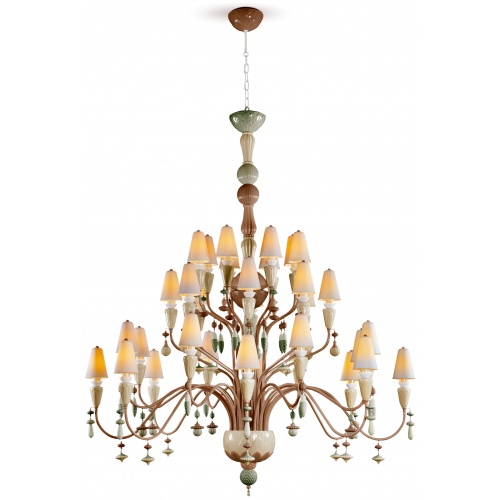 Chandelier with thirty-two lights inspired by plant motifs, interpreted by means of rounded, organic and geometric lines. In the design of the collection, synthetic, feminine, lathed, edgeless shapes predominate in porcelain. The hanging accessories make reference to seeds and bulbs; the bases of lights and other parts of the shaft make reference to leaves and flower petals on the point of opening; the lithophanes are inspired by the forms of forest mushrooms. The Spices colour palette draws on warm, earthy tones and the exoticism of India, and the rich range of autumn forests, offering a new combination in the Lladró catalogue, which links to the style of current decoration.
