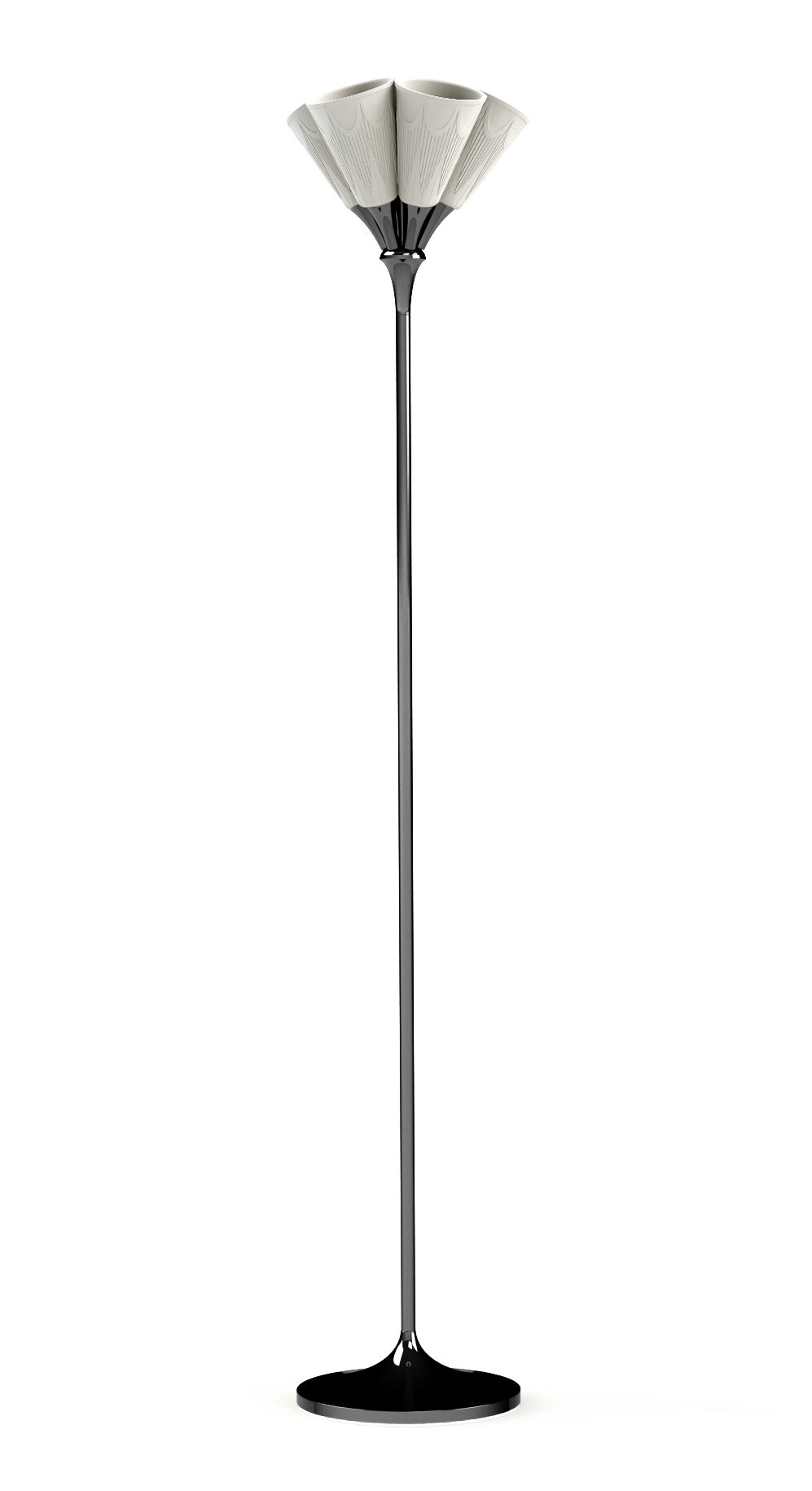 The Jamz collection has all the flavour of an era: the sound of jazz clubs, the forms inspired by art deco and the aroma of creativity, rhythm and vitality that characterized a few years of great personality. A unique selection of hanging, standing and reading lamps. The combination of brass and porcelain lithophanes, with a choice of three different models, recalls the shape of the jazz instruments. The customization of the lamps symbolizes the free essence of this music, allowing improvisation for custom creations. Refined shape lamps in white porcelain with gold, copper or black metals in which light and craftsmanship come together to create different atmospheres.