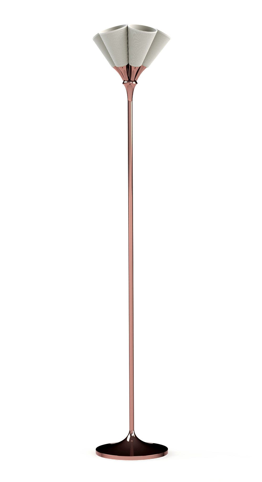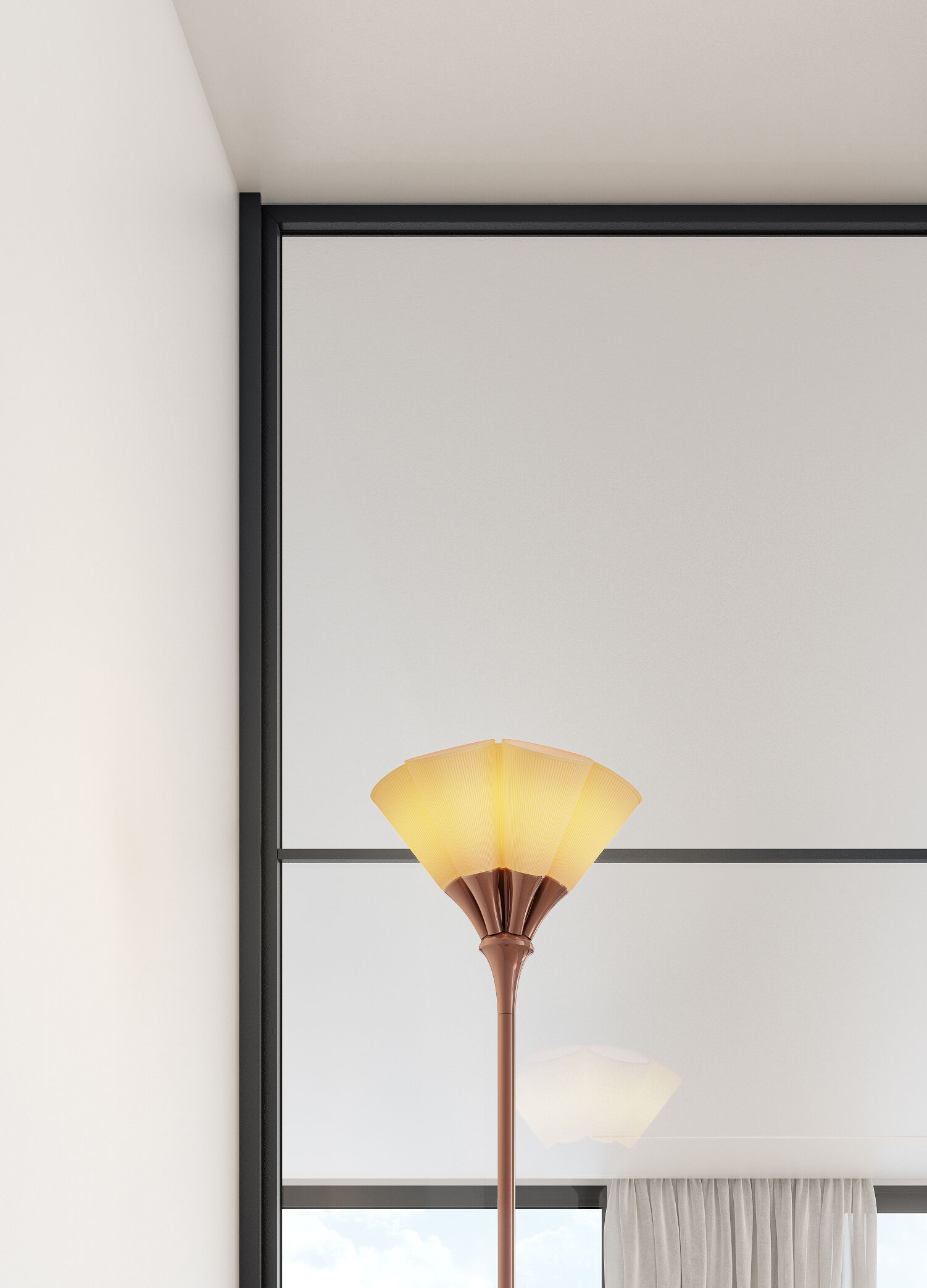 The Jamz collection has all the flavour of an era: the sound of jazz clubs, the forms inspired by art deco and the aroma of creativity, rhythm and vitality that characterized a few years of great personality. A unique selection of hanging, standing and reading lamps. The combination of brass and porcelain lithophanes, with a choice of three different models, recalls the shape of the jazz instruments. The customization of the lamps symbolizes the free essence of this music, allowing improvisation for custom creations. Refined shape lamps in white porcelain with gold, copper or black metals in which light and craftsmanship come together to create different atmospheres.