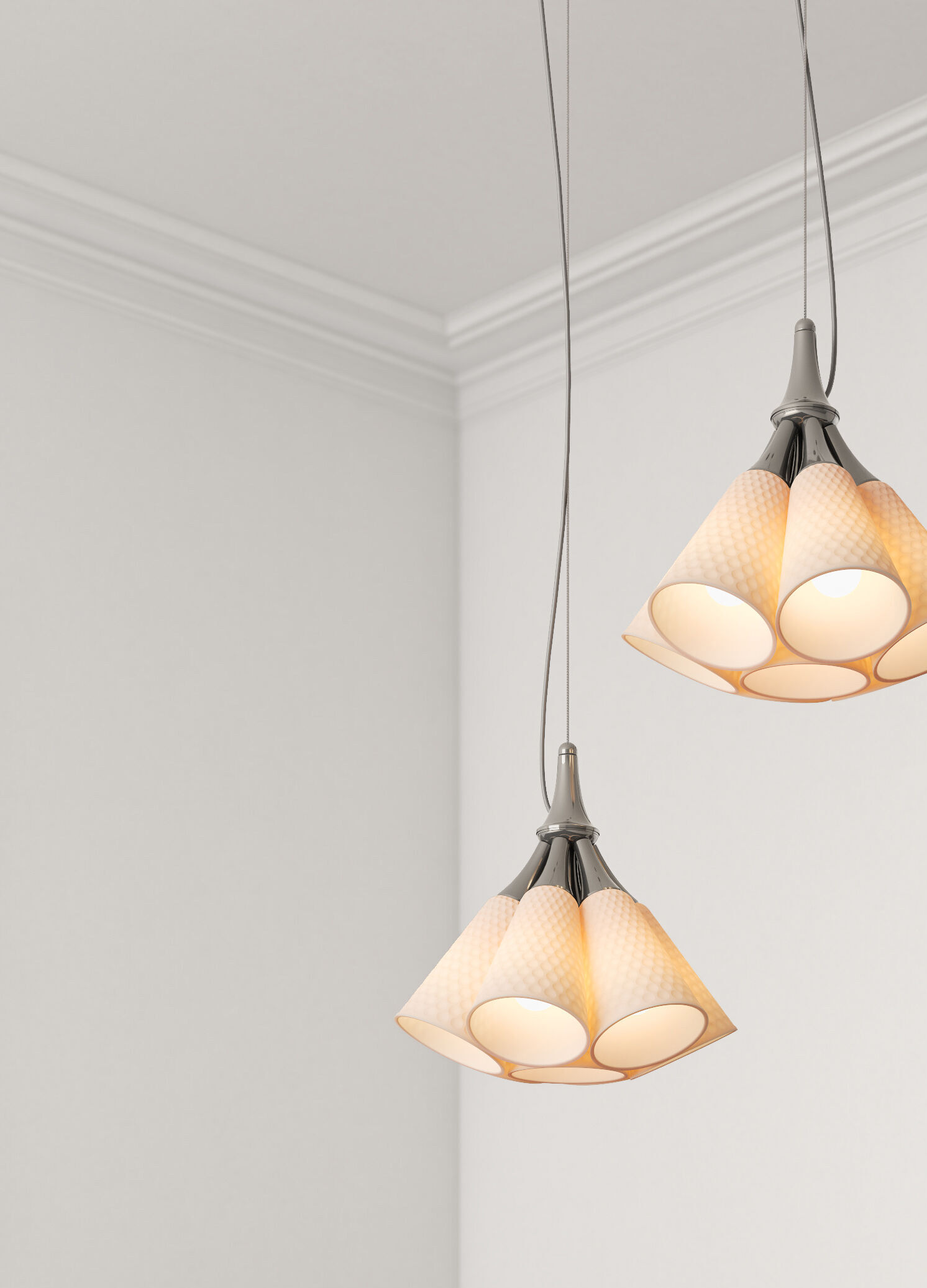 The Jamz collection has all the flavour of an era: the sound of jazz clubs, the forms inspired by art deco and the aroma of creativity, rhythm and vitality that characterized a few years of great personality. A unique selection of hanging, standing and reading lamps. The combination of brass and porcelain lithophanes, with a choice of three different models, recalls the shape of the jazz instruments. The customization of the lamps symbolizes the free essence of this music, allowing improvisation for custom creations. Refined shape lamps in white porcelain with gold, copper or black metals in which light and craftsmanship come together to create different atmospheres.