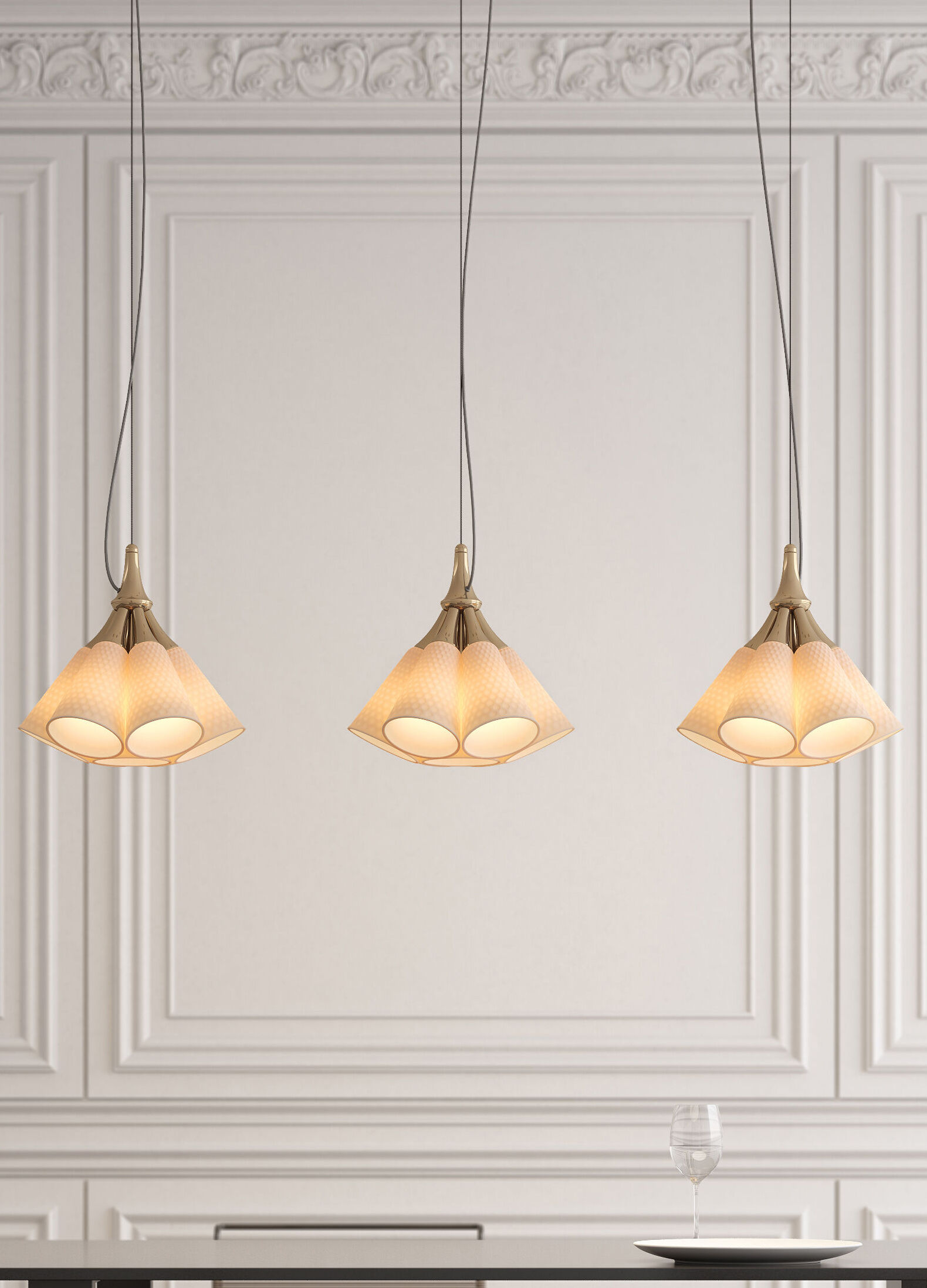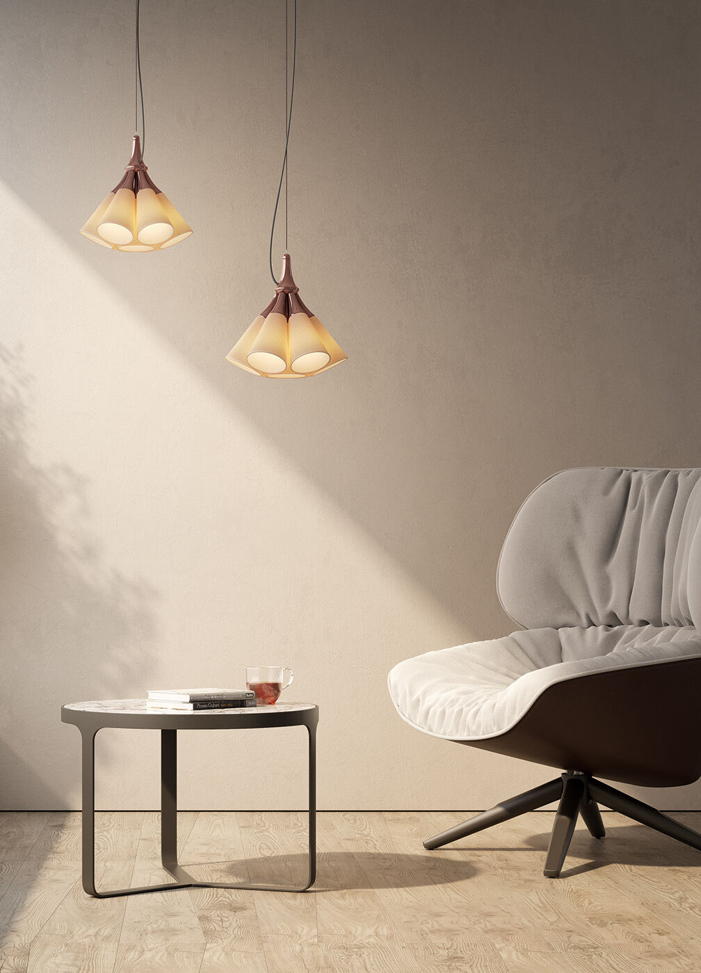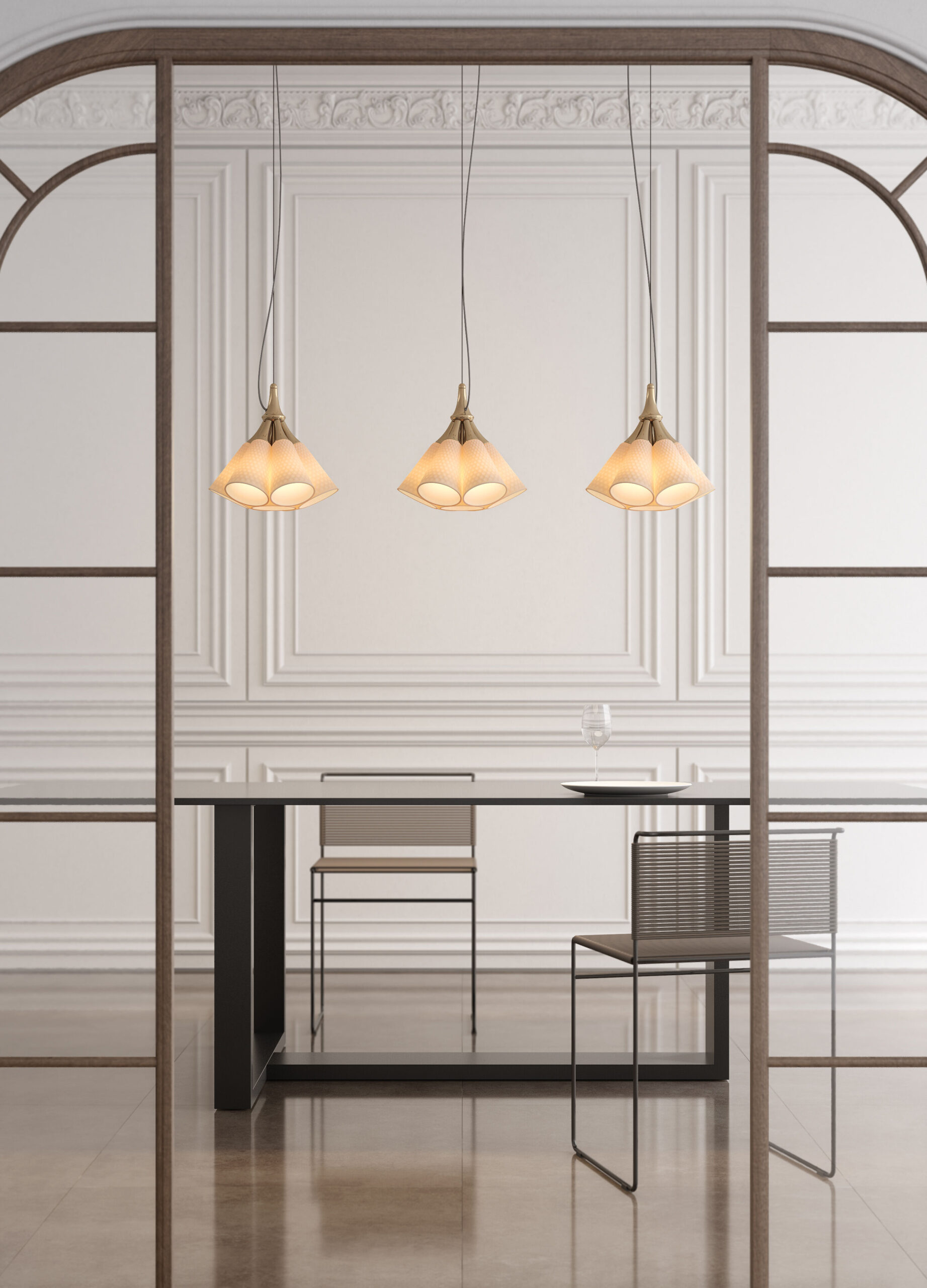 The Jamz collection has all the flavour of an era: the sound of jazz clubs, the forms inspired by art deco and the aroma of creativity, rhythm and vitality that characterized a few years of great personality. A unique selection of hanging, standing and reading lamps. The combination of brass and porcelain lithophanes, with a choice of three different models, recalls the shape of the jazz instruments. The customization of the lamps symbolizes the free essence of this music, allowing improvisation for custom creations. Refined shape lamps in white porcelain with gold, copper or black metals in which light and craftsmanship come together to create different atmospheres.