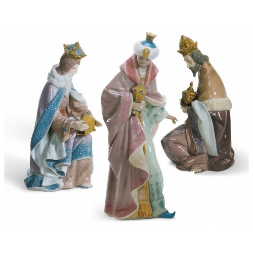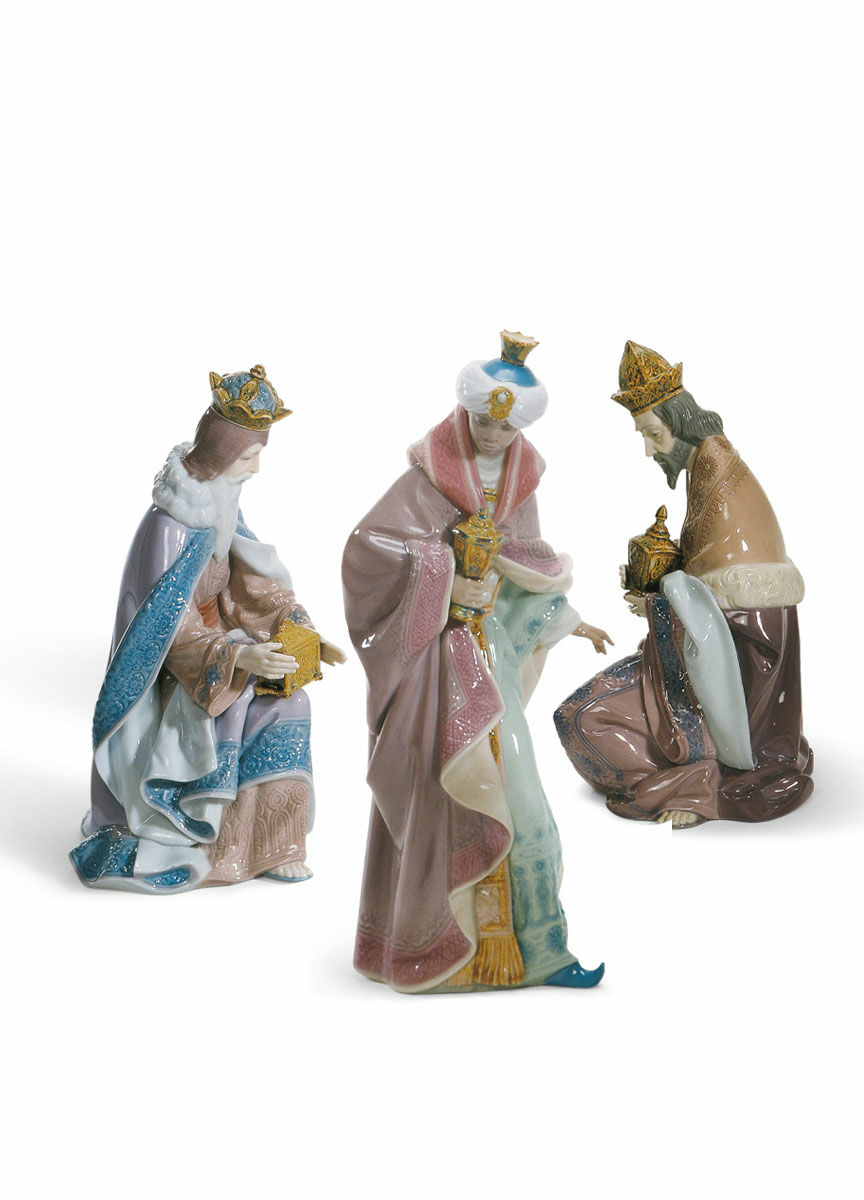 The Three Wise Men, key figures in the traditional Nativity scene, made in glazed porcelain, decorated in soft tones
