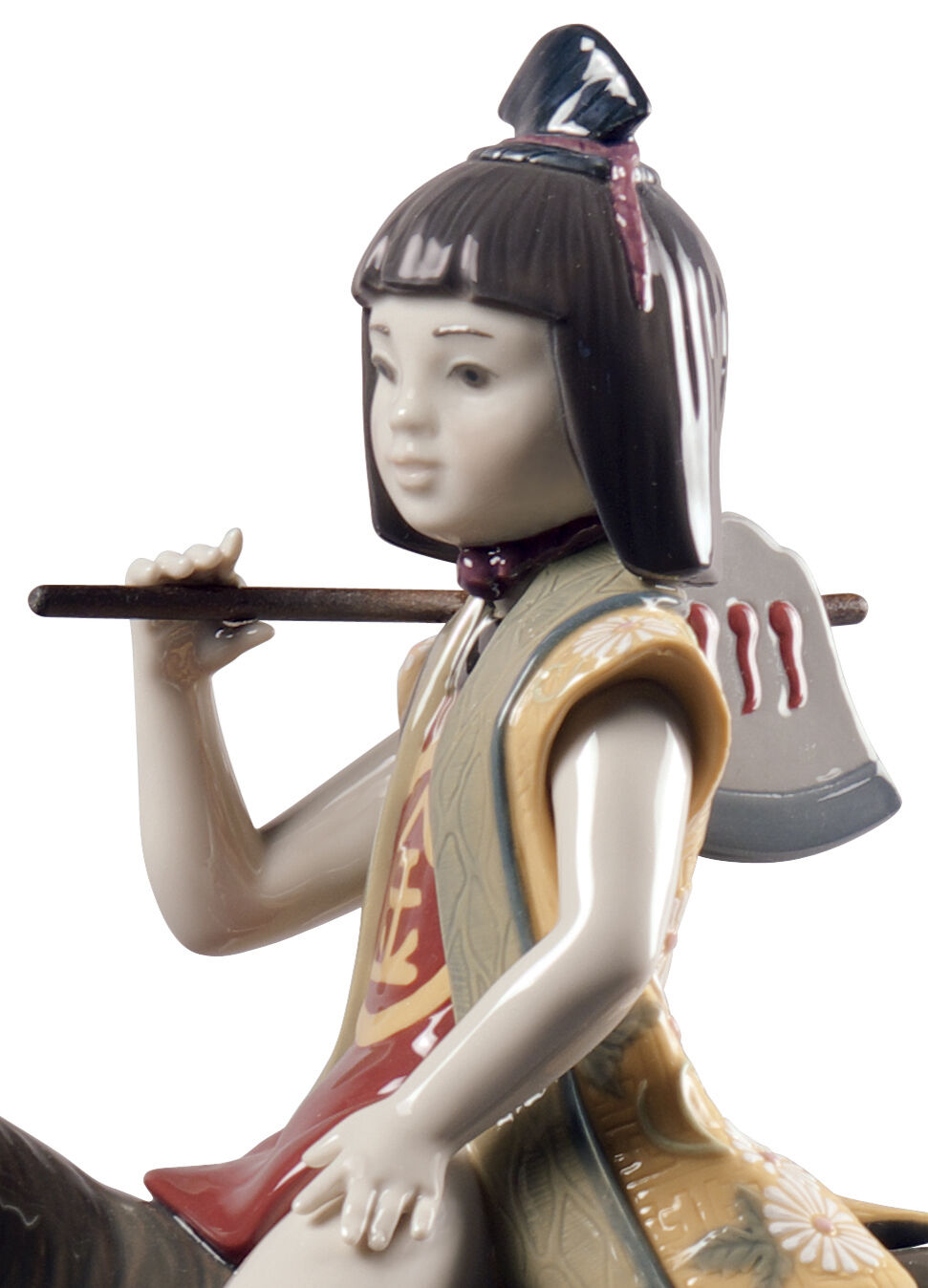 This depiction of the hero shows him riding on a bear, in reference to Kintarō’s childhood in the woods and his relationship with the animals. The decorative work done on the vest stands out in particular for its meticulously ornate traditional Japanese embroidery.