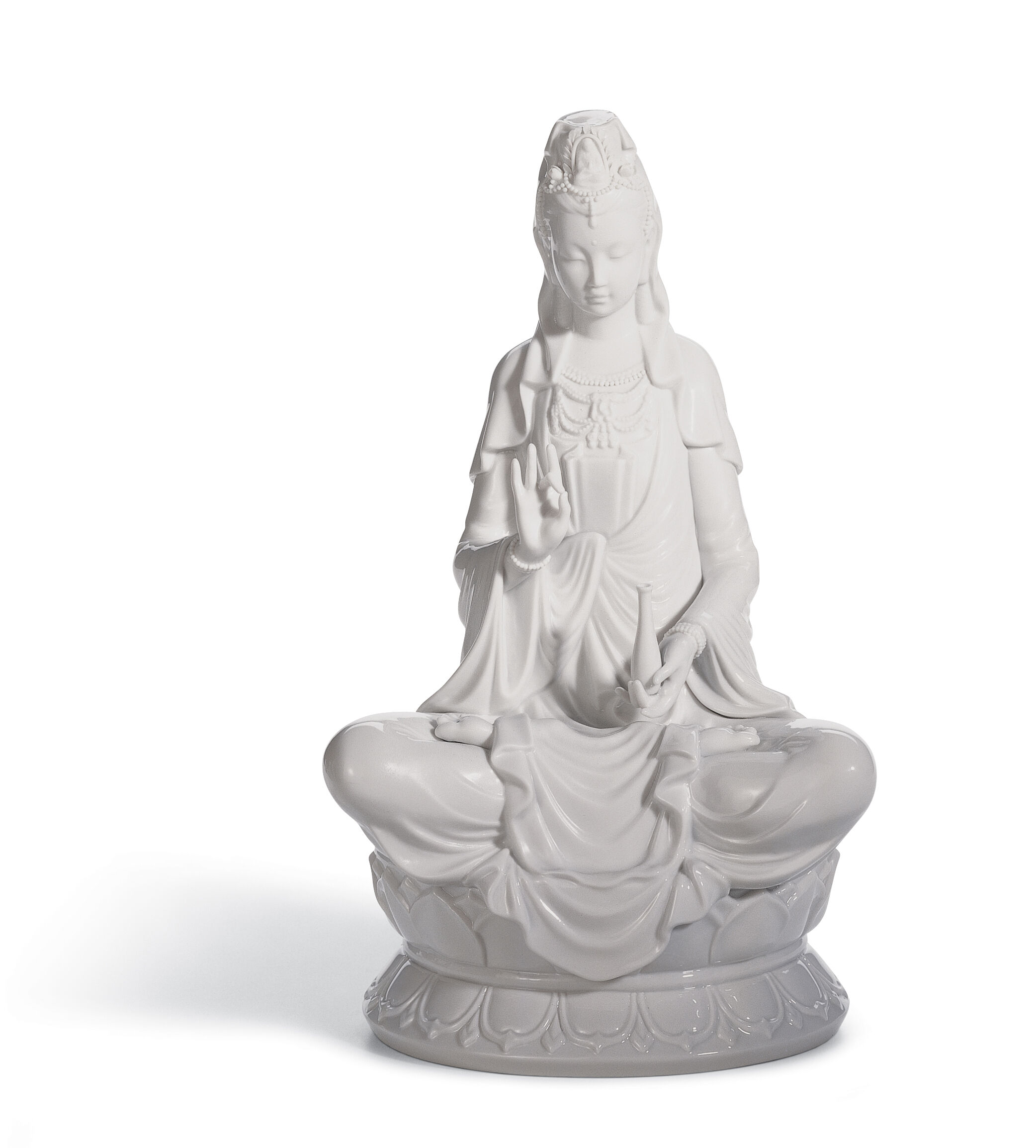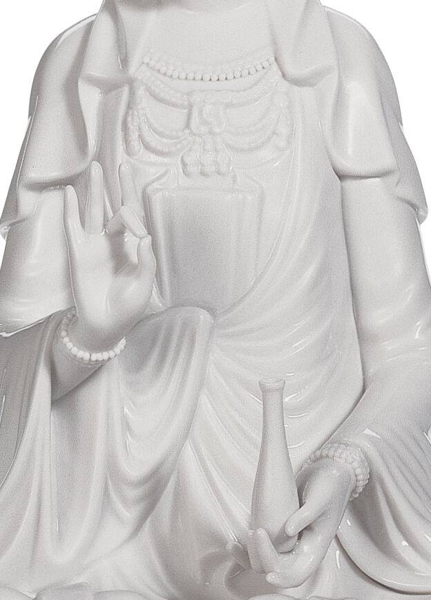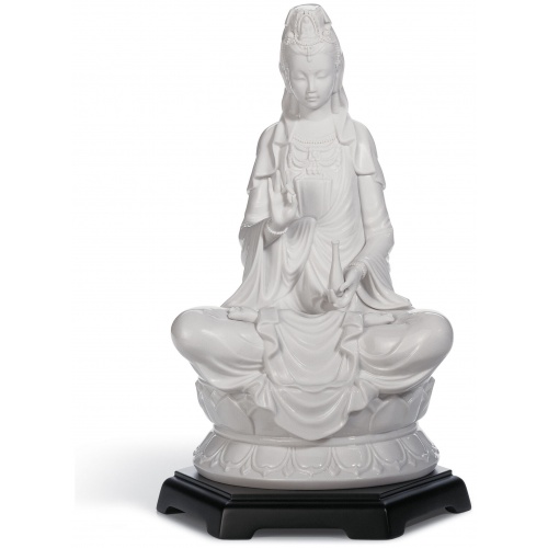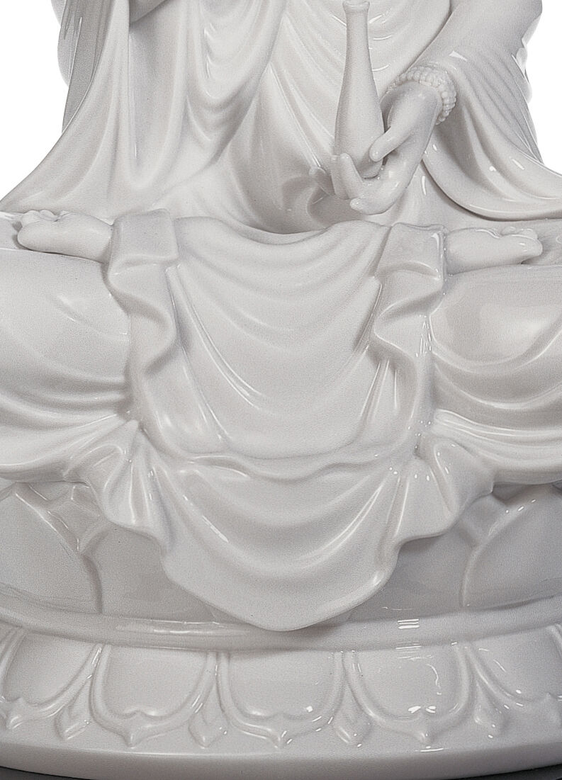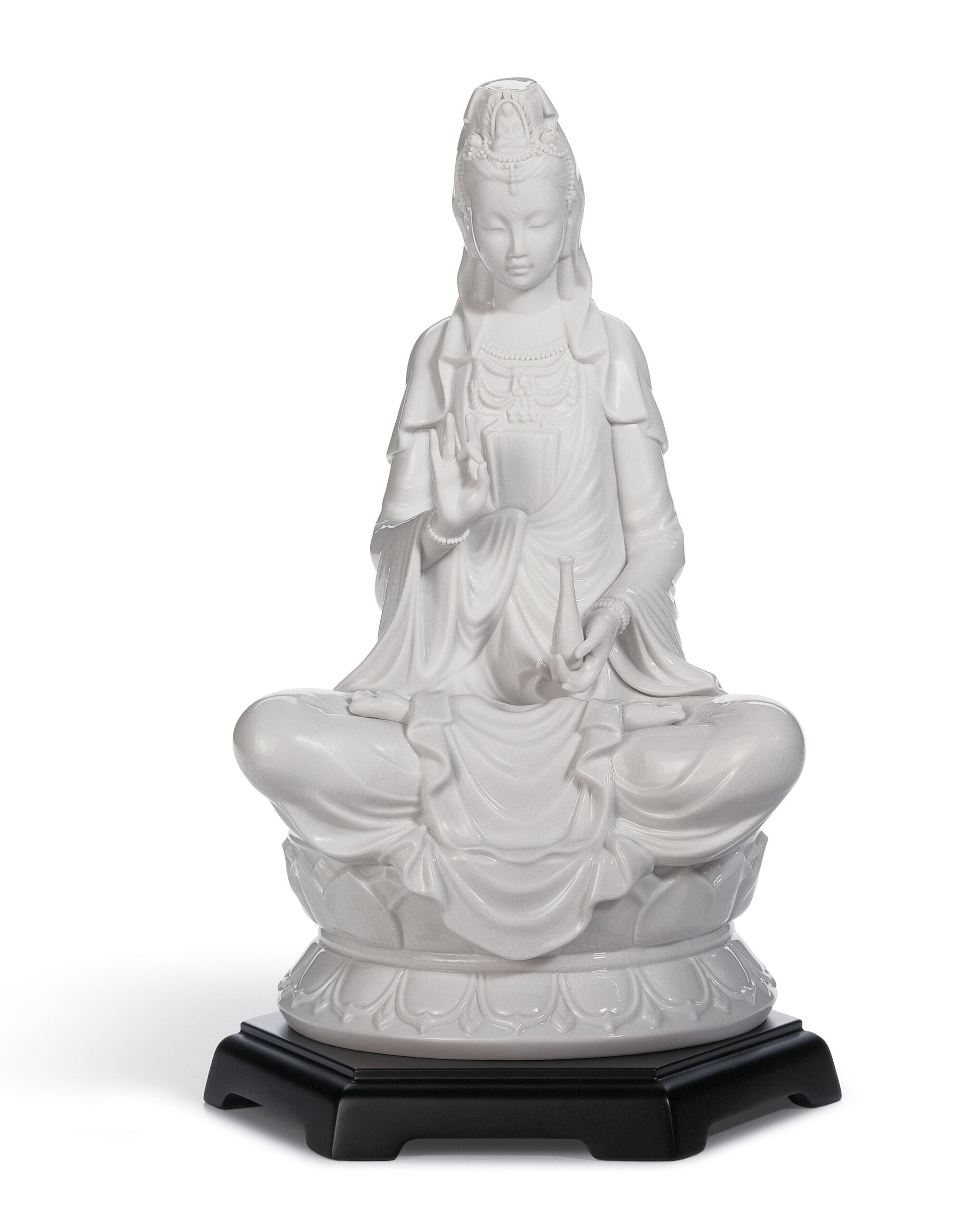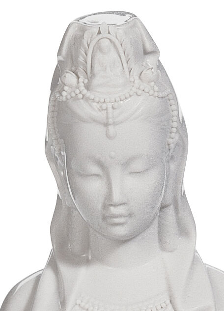Kwan Yin is the best-loved goddess of Chinese culture. She abounds with love and embodies grace and beauty. Her particular attribute is Mercy, and she is within the reach of anyone. She understands the nature of fear and anguish, comforting those who suffer with compassion. Made in gloss white porcelain, in the style of the most authentic monochrome statuettes of oriental art, found in jade, lapis lazuli, carved wood or even ivory. Oriental-inspired base in dark wood, hexagonal shape and supported on six points.