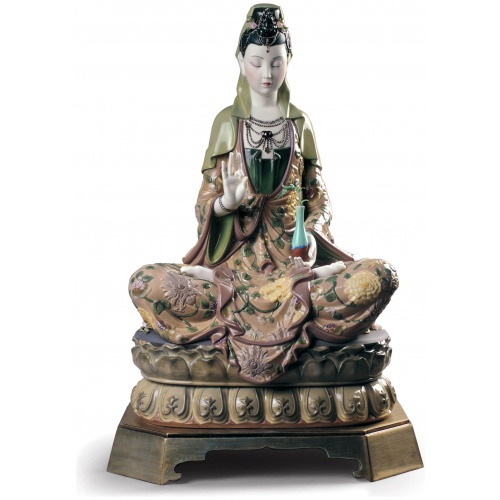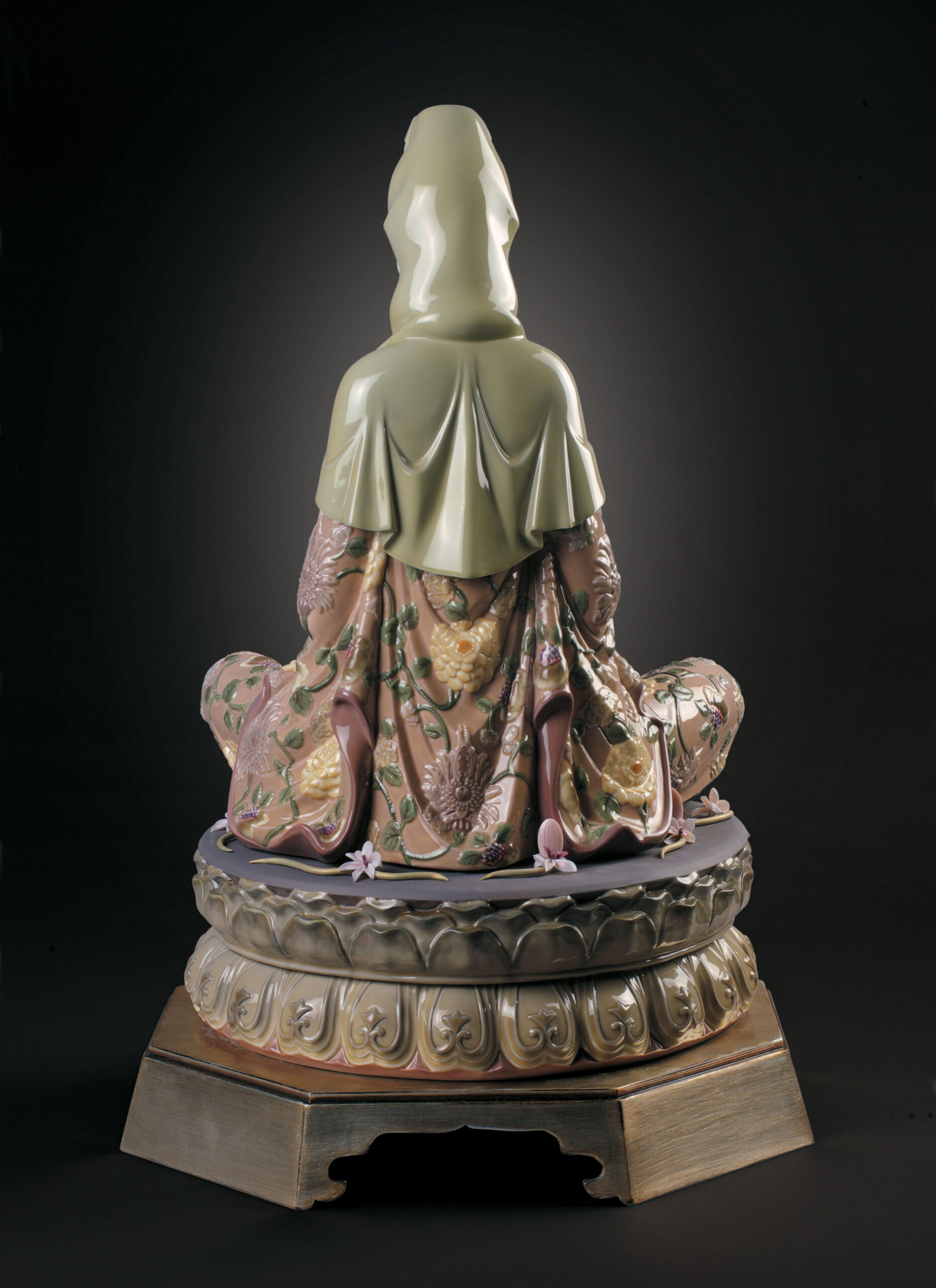 This High Porcelain limited edition brings a revered goddess to life, recreating a novel colour scheme of healing light, which releases ¨she who hears the lament of the world¨. According to a common Chinese belief, Kwan Yin lives on the island of Pu-tuo-shan, where her temple is surrounded by a lake of violet light which cures the ailments of all who bathe in its waters. It is said she will not rest until all human beings are freed from their suffering. The image of the goddess is decorated with innovative colours such as hues of purple and mauve and the metallic gold and aged silver of the forest flowers, never before used in a Lladró piece. For the remainder of the piece, hues in a harmonious green and yellow colour scheme have been employed.