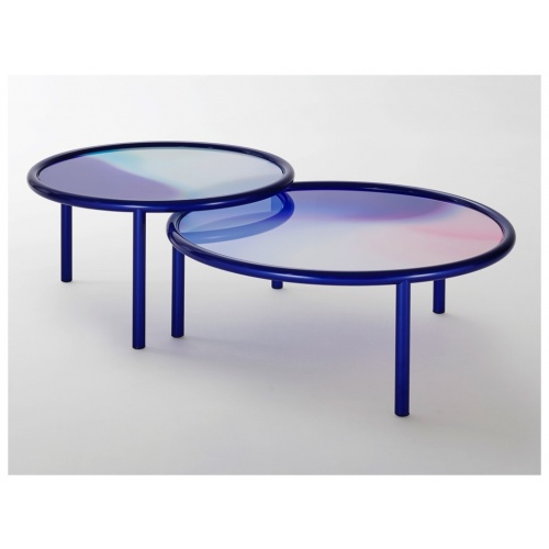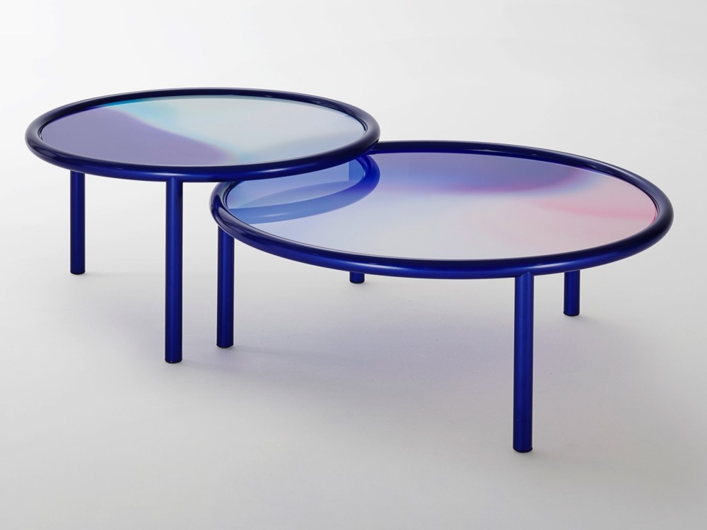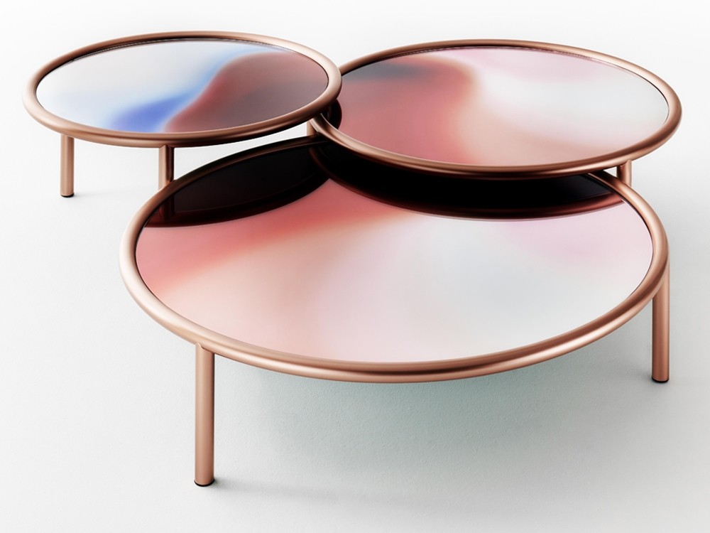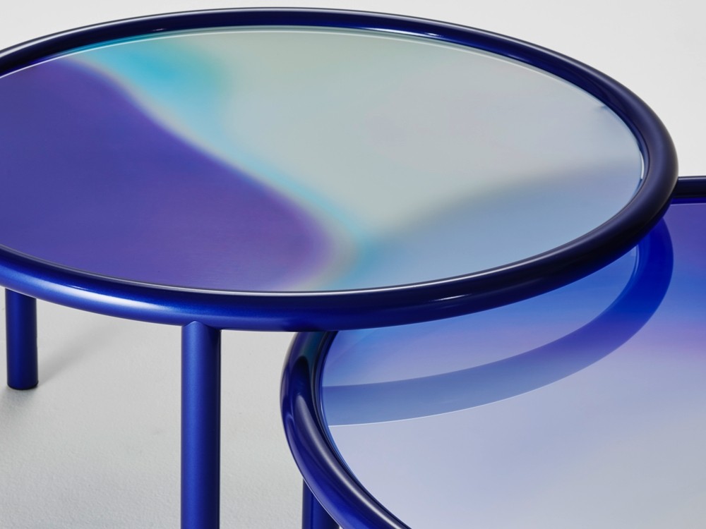 Patricia Urquiola’s latest design is a stunning series of low tables, whose iridescent surface establishes a dialogue between glass and the colours of light.