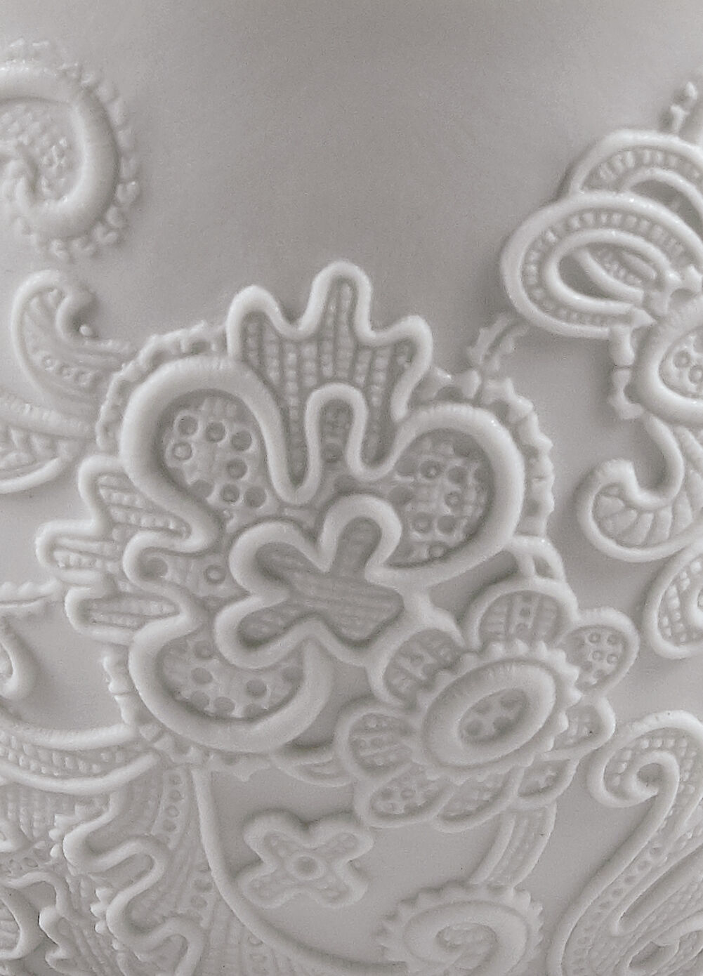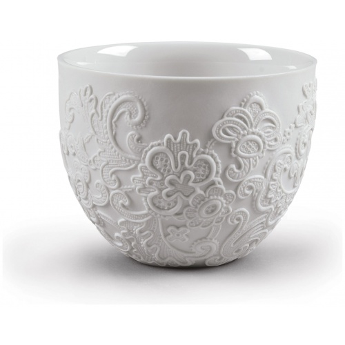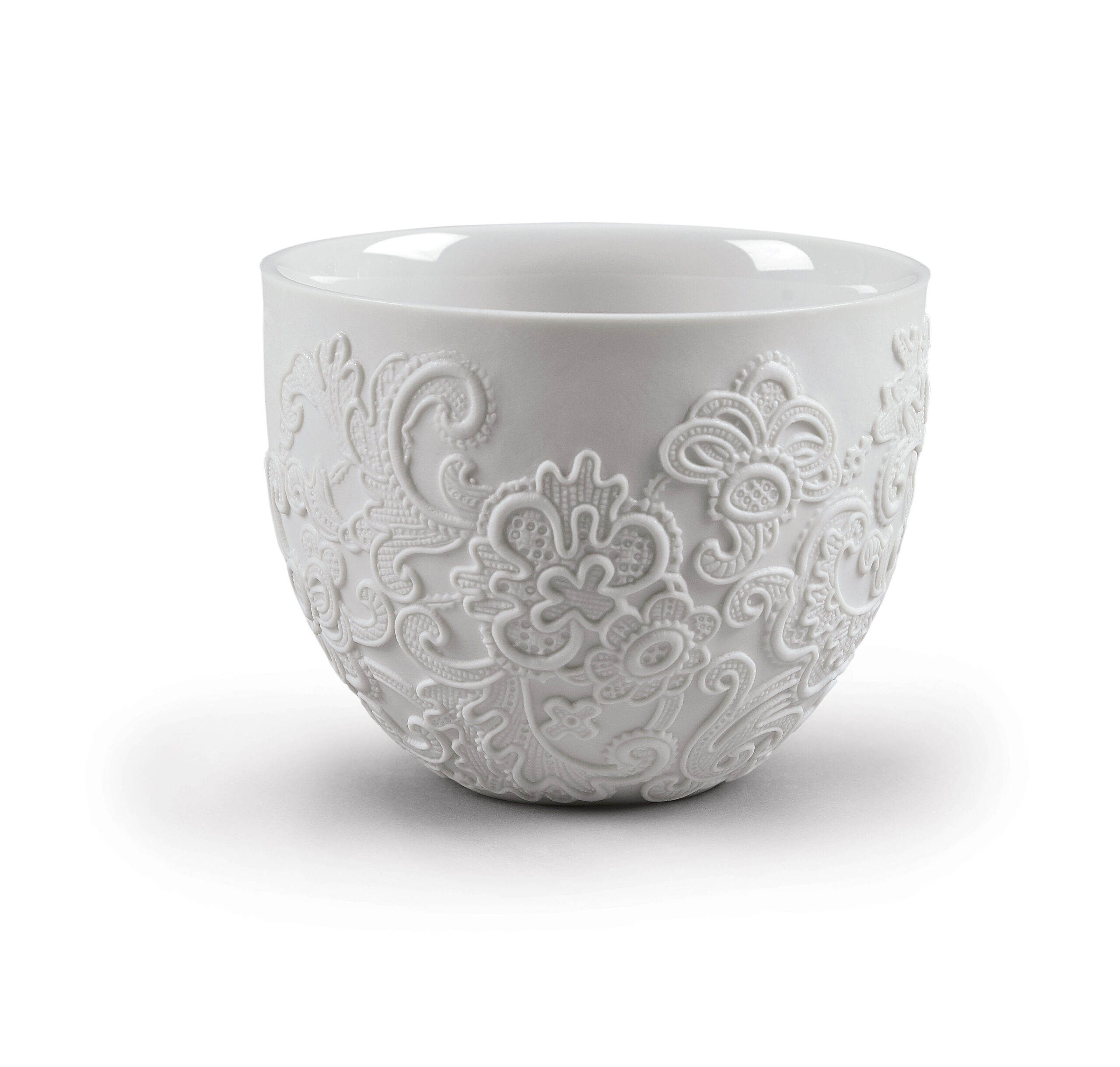 Ornamentation based on guipur lace is applied to a cup designed in line with traditional Japanese shapes. East and West meet in this refined combination, through the delicate artisanal sensitivity brining together elements of both worlds. With a matte white porcelain finish outside and gloss inside, the cup offers an original, contemporary design, both modern and classic at the same time. It is suitable for any kind of liquor or digestive drink.