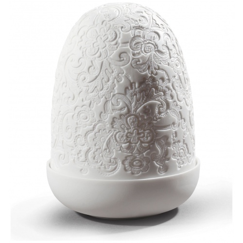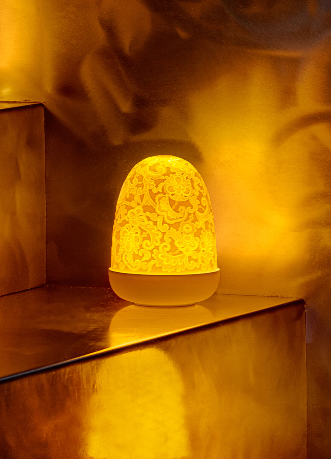 Wireless lamp from the Dome collection created with the technique of lithophany, in which LladrĂ³’s artists are true masters. Its large, translucent, dome-shaped screen is made of translucent porcelain, which lets in light and projects the hand engraved motifs, in this version the traditional lace embroidery, emitting a warm and evocative glow that calls for peace of mind. they work with an LED module with a rechargeable battery via USB and the tactile intensity regulator to create the perfect atmosphere indoors and outdoors.
