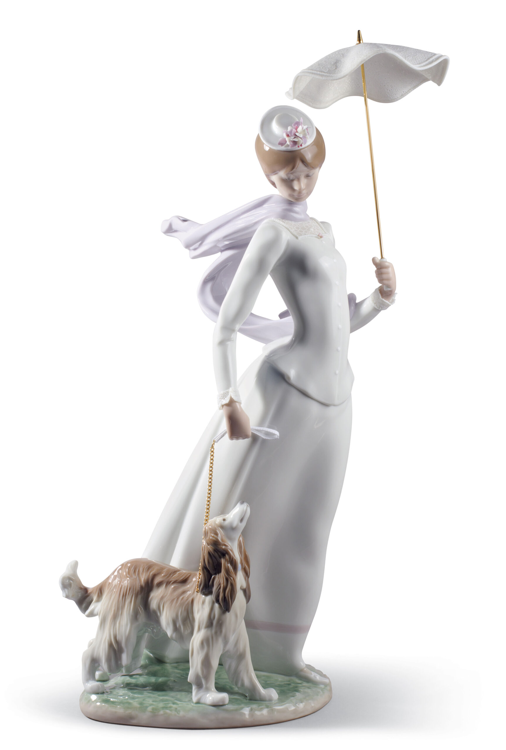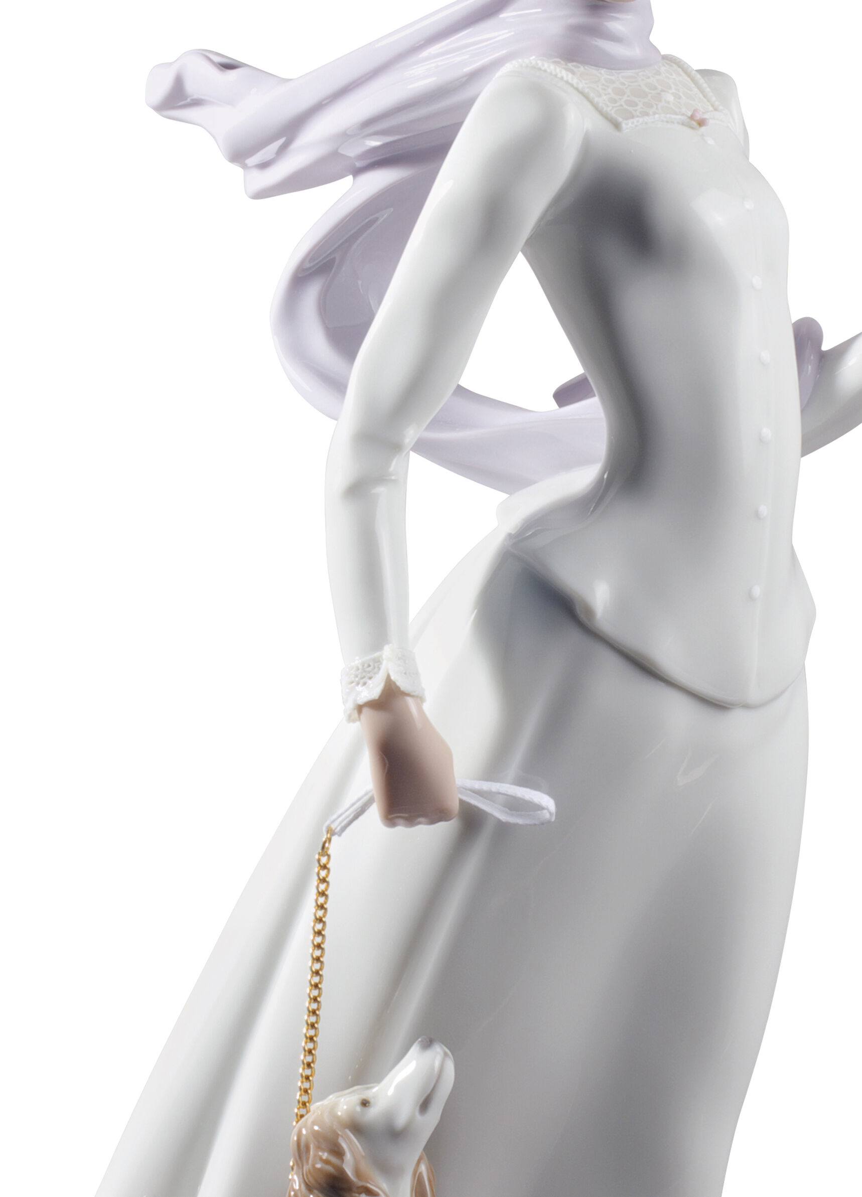 Sophisticated and elegant, she is going out for a walk with her beloved dogs through a romantic tree-lined avenue. A glossy porcelain piece, finished in pastel colours, ideal as a gift, collectible or decoration.