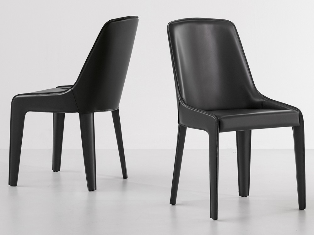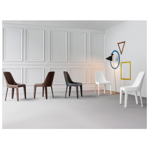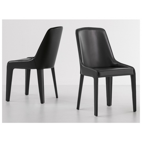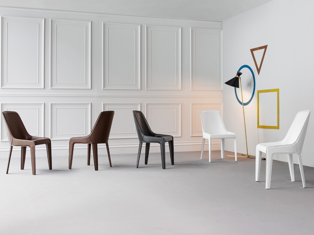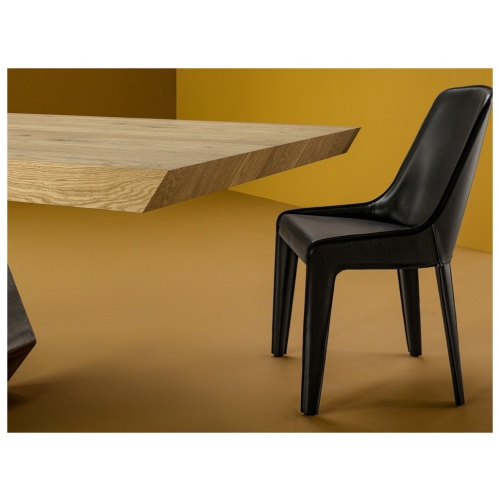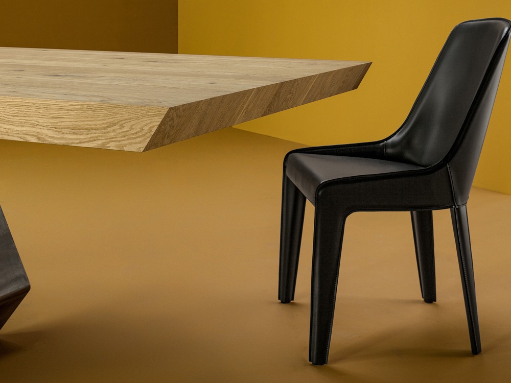 The juxtaposition of two slabs of shaped emery-leather, which contain the bearing steel frame and form a single whole that merges the backrest with the legs, is the distinguishing feature of the Lamina chair designed by Mauro Lipparini. The structural stability of the entire shaped panel is ensured by the horizontal seat surface that secures and stabilizes the two side edges of the chair.
