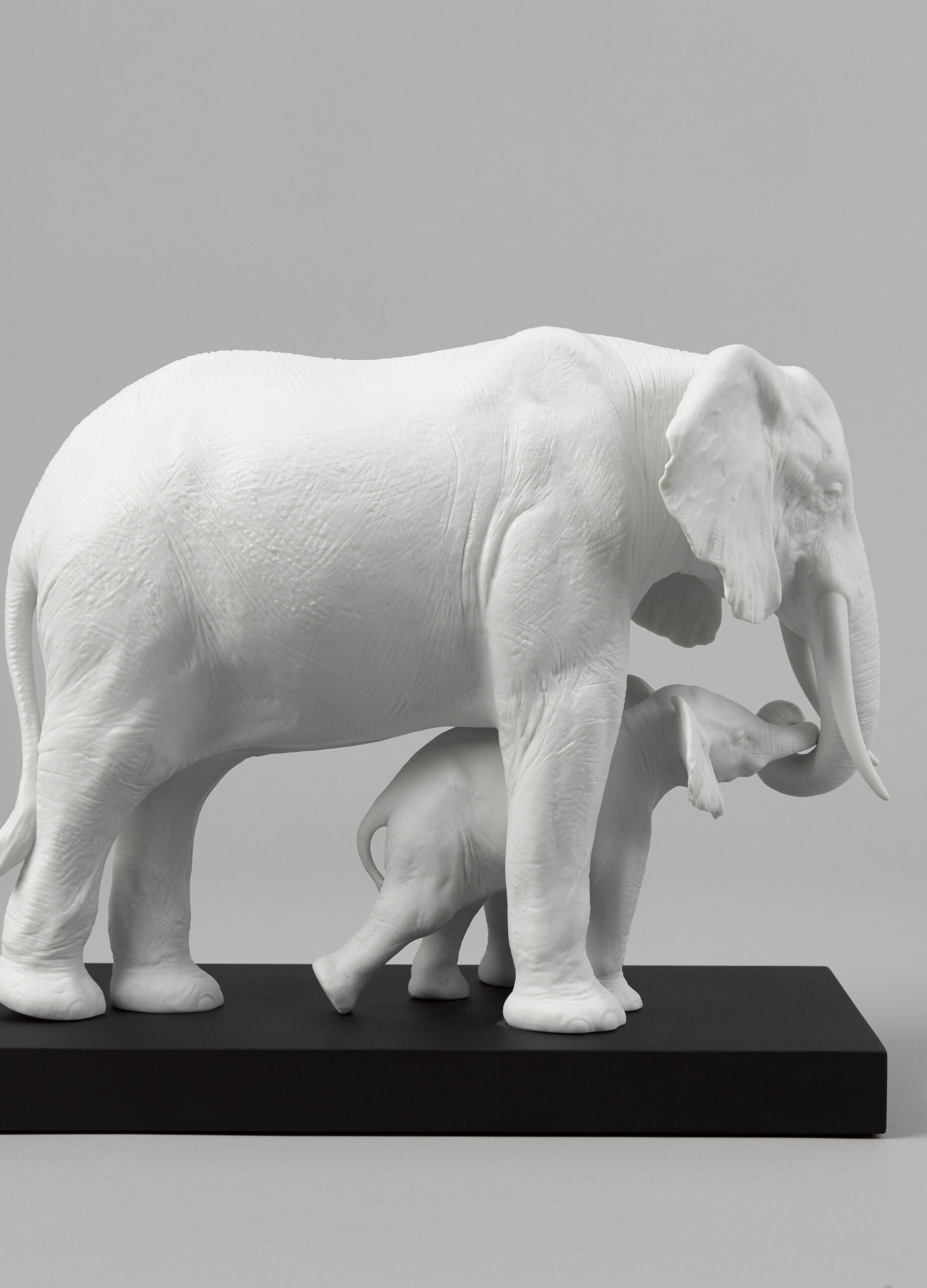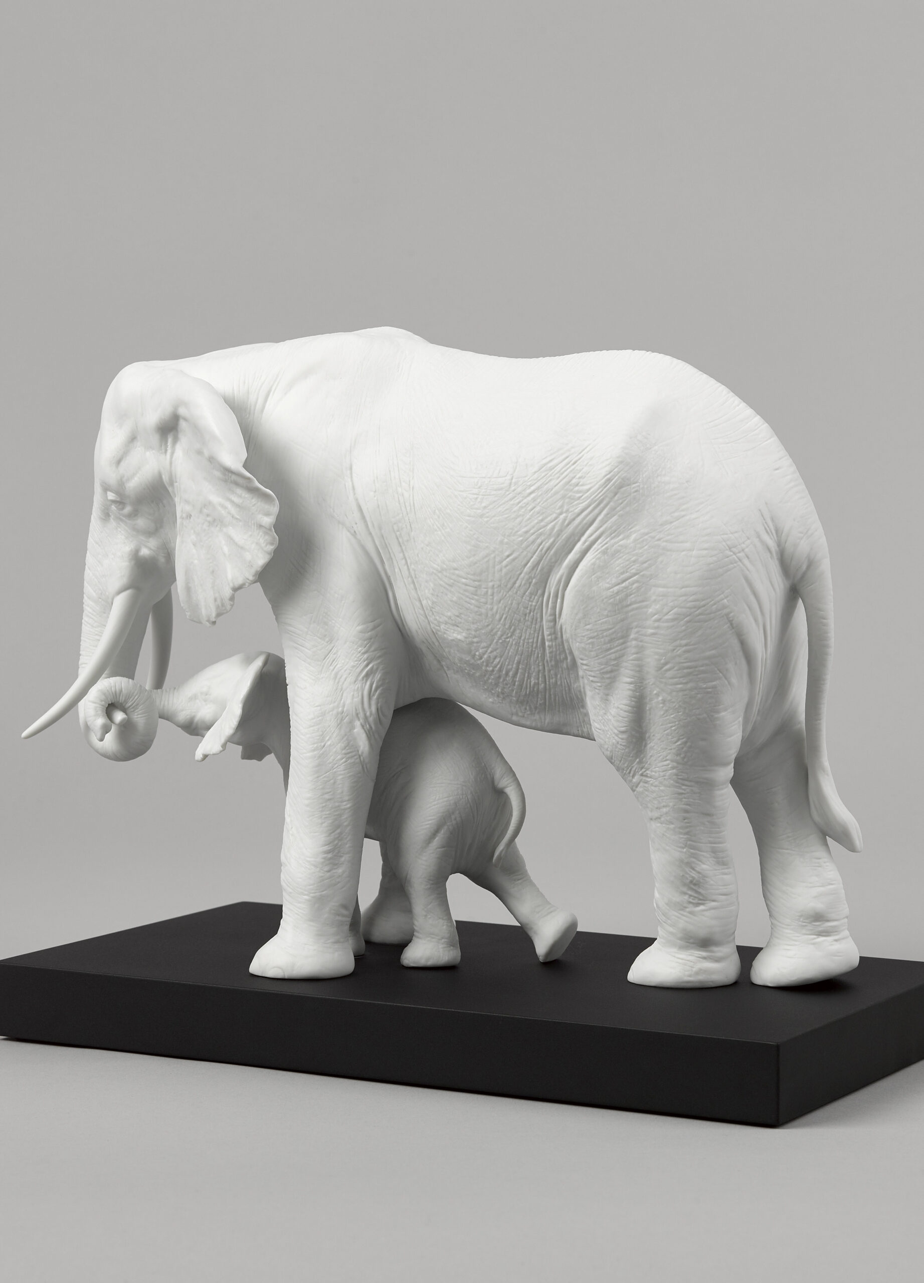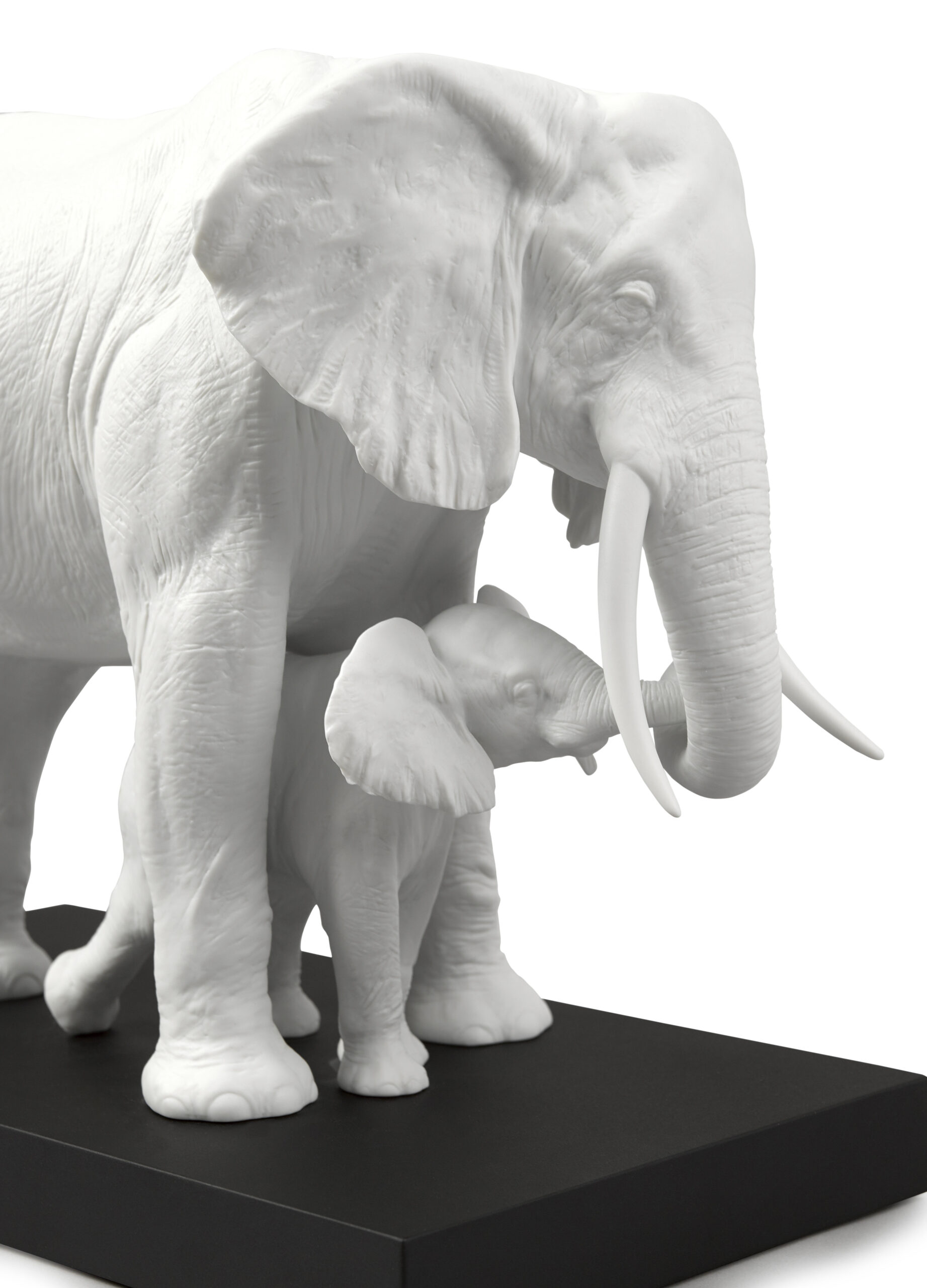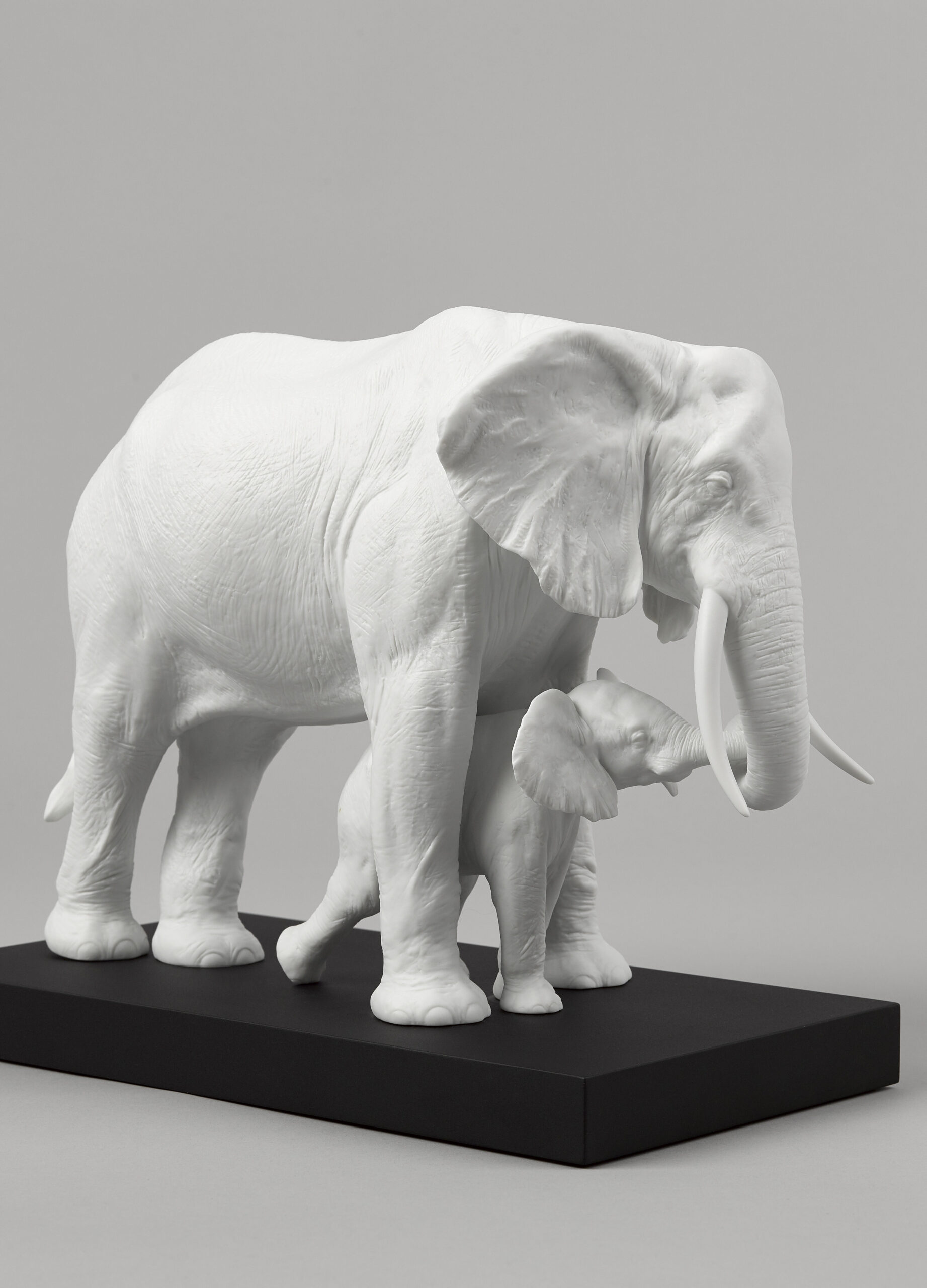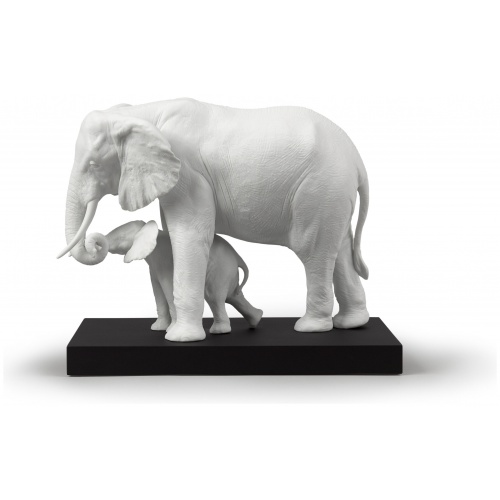 A gesture of maternal love in the most impressive of all the creatures. The mother elephant gently guides her calf in a gesture that’s both tender and universal. A matte white porcelain piece of strong decorative impact, perfect for any type of setting.