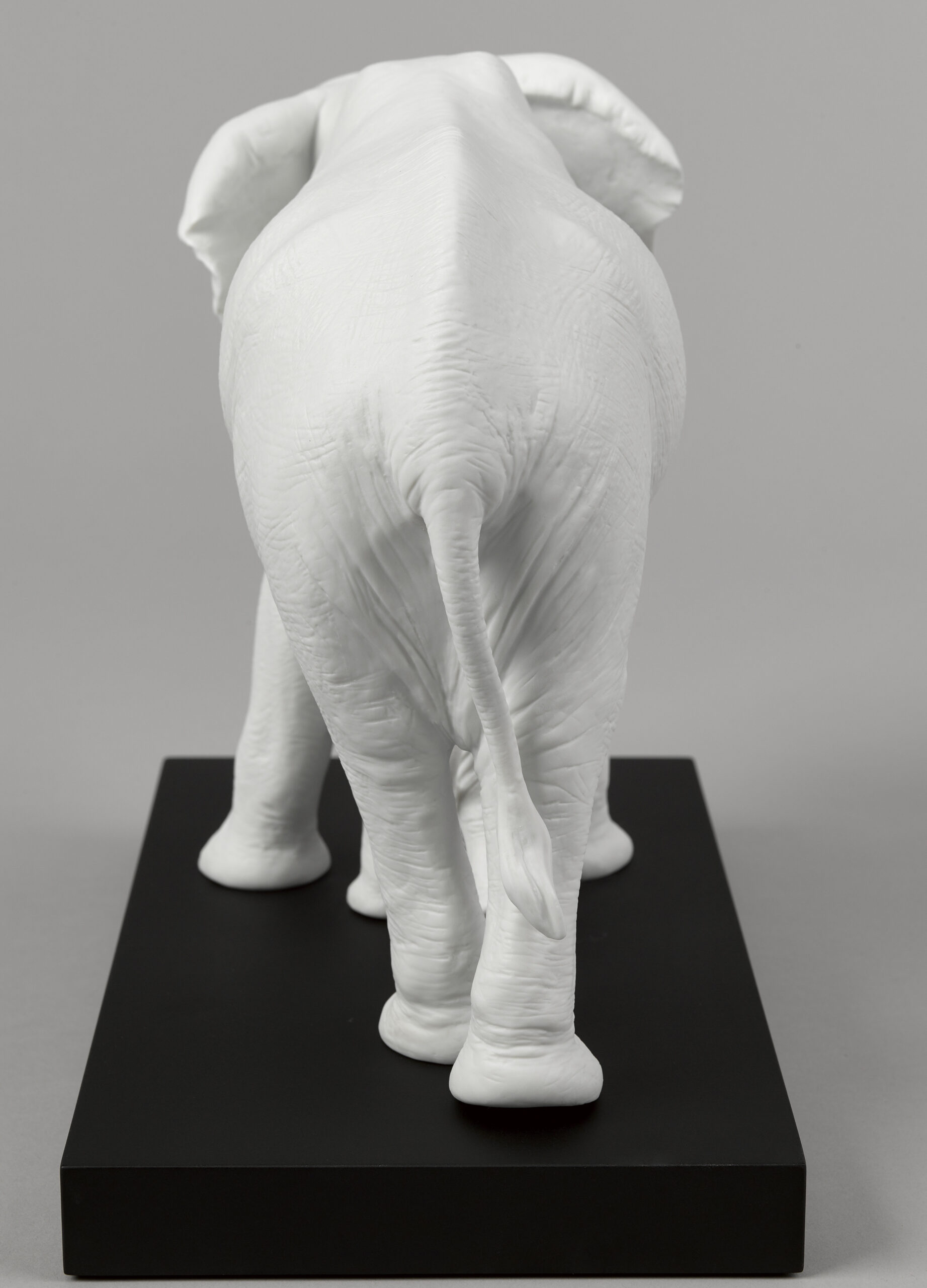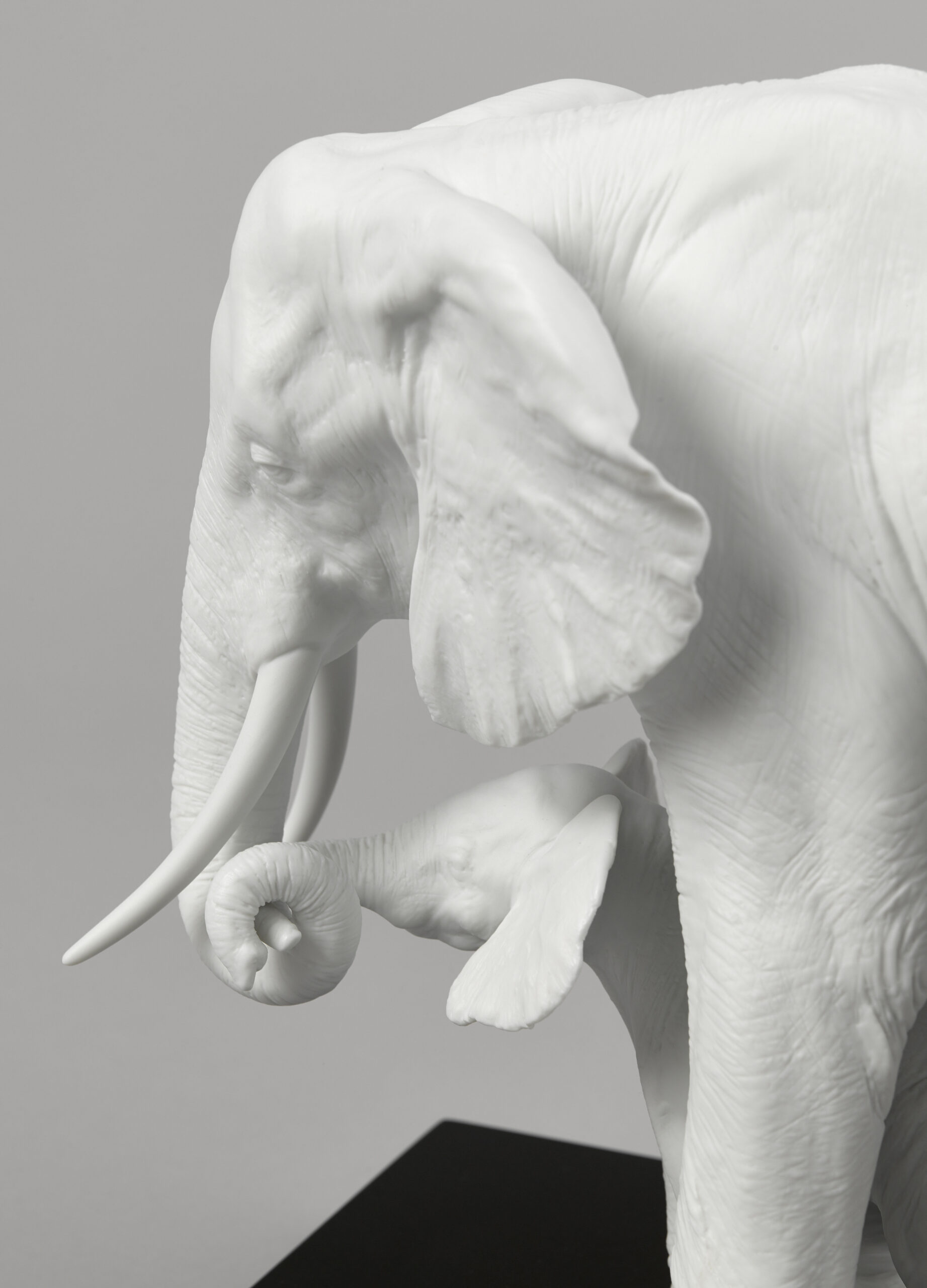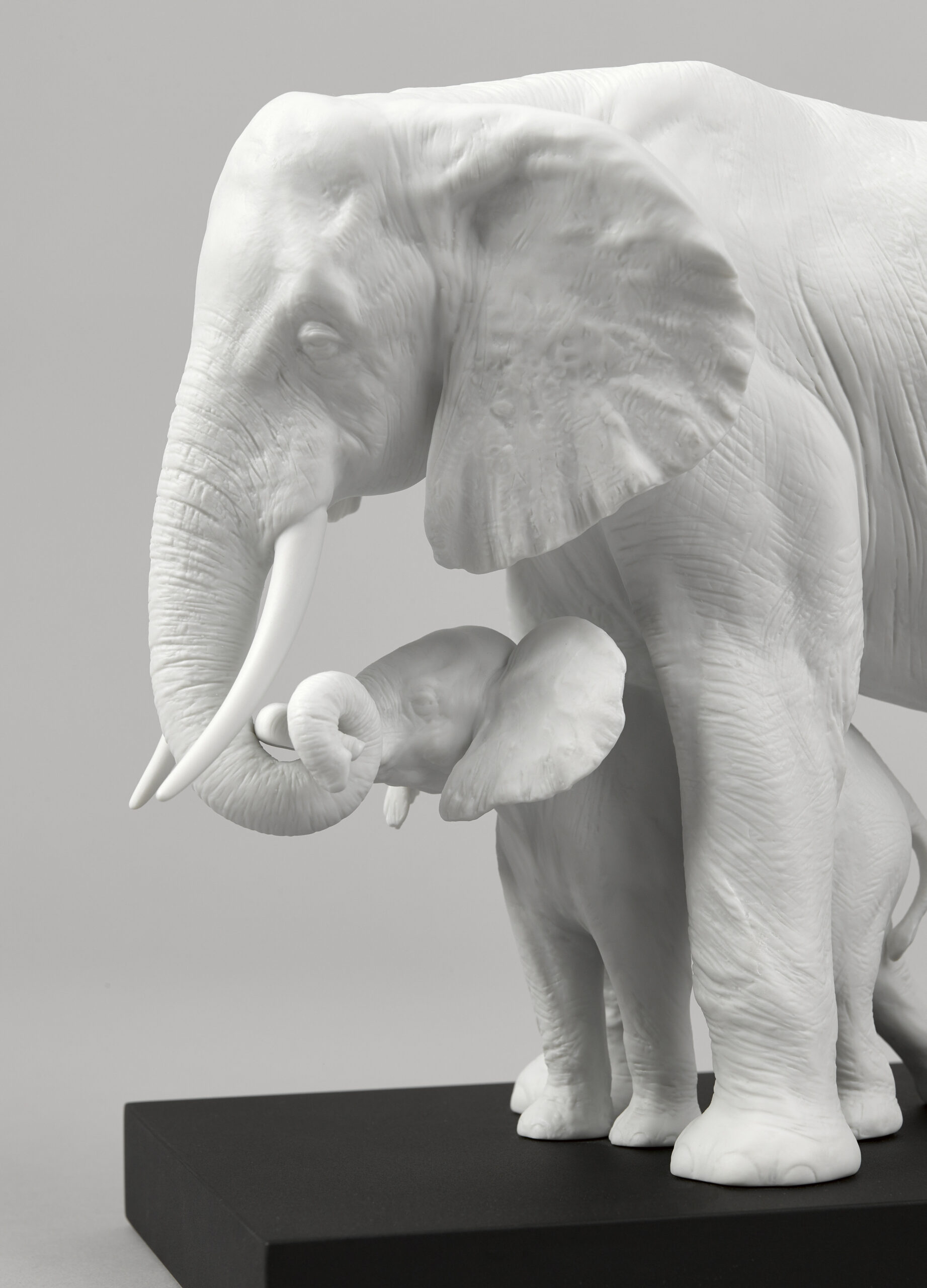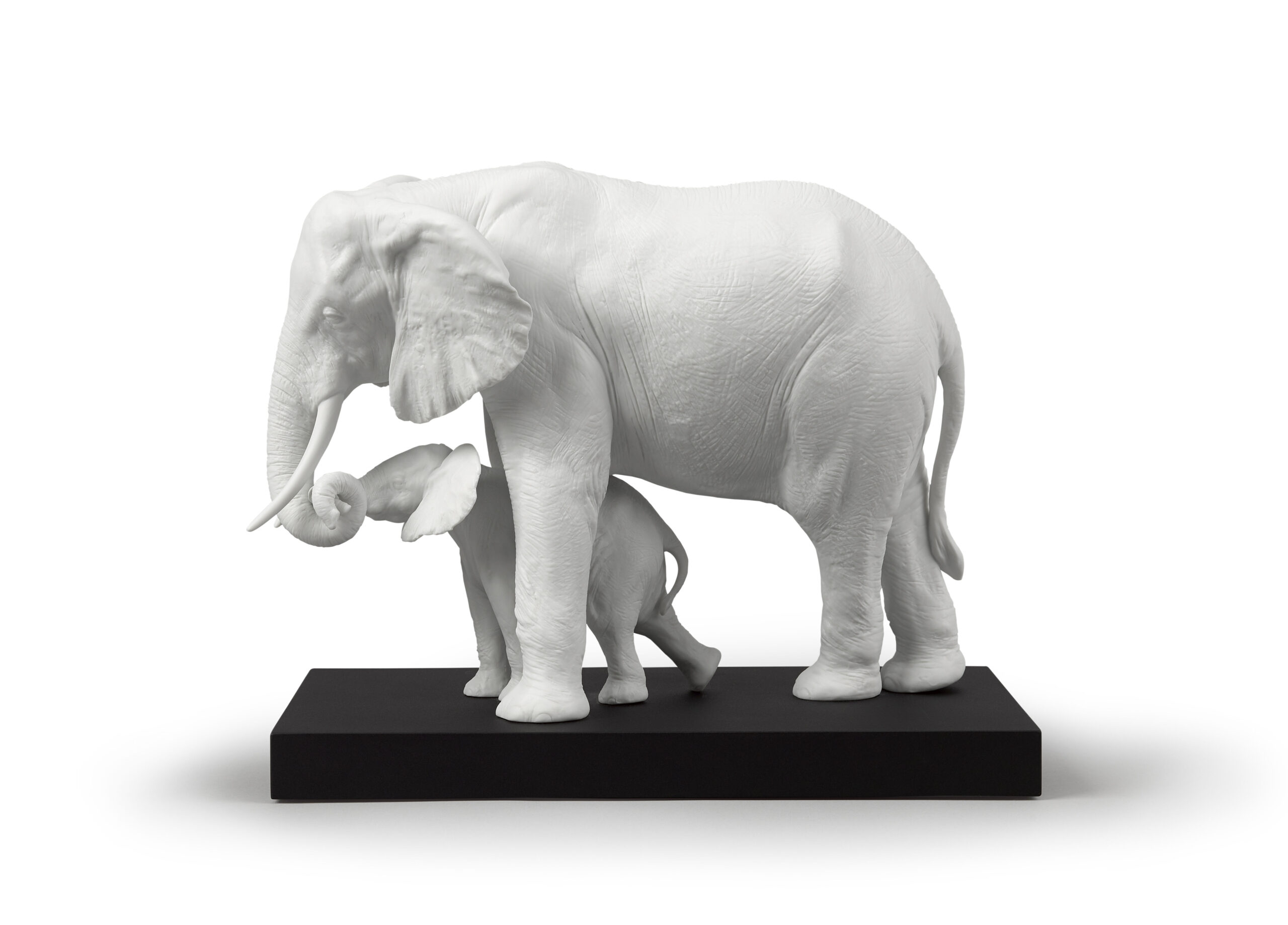 A gesture of maternal love in the most impressive of all the creatures. The mother elephant gently guides her calf in a gesture that’s both tender and universal. A matte white porcelain piece of strong decorative impact, perfect for any type of setting.