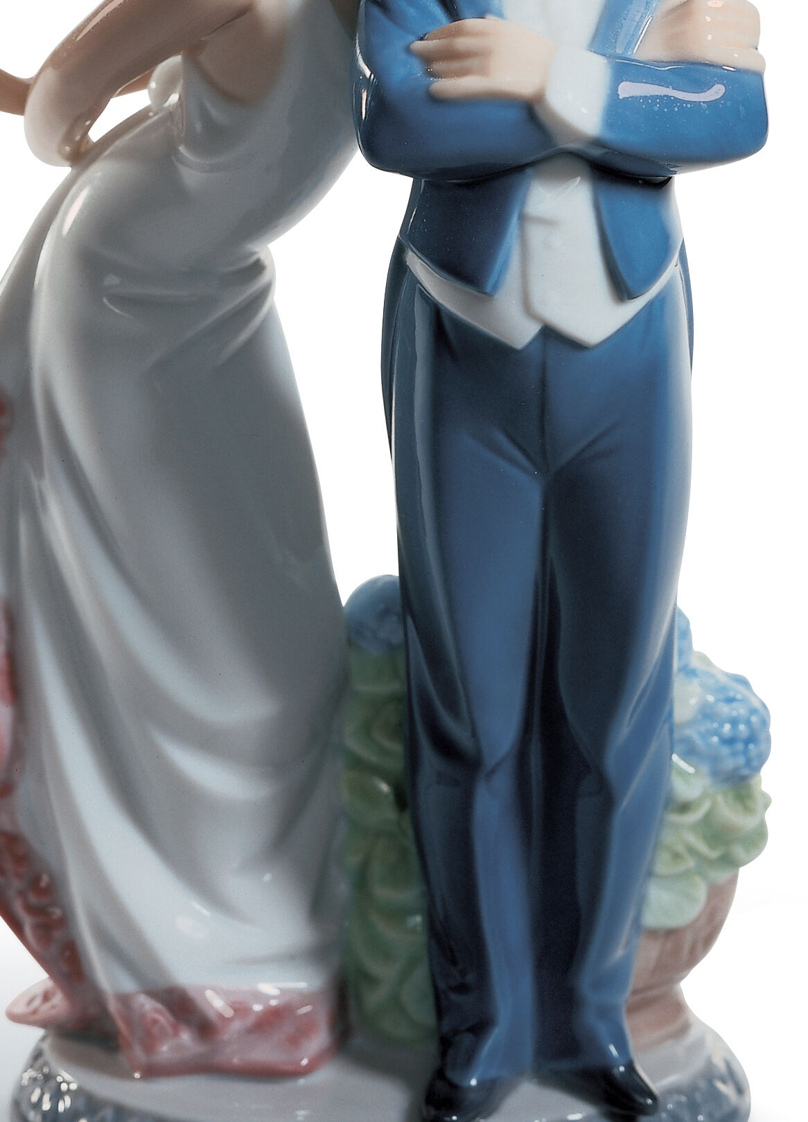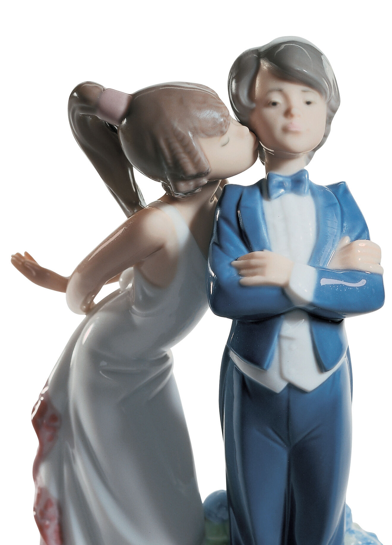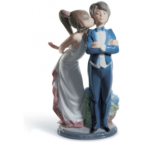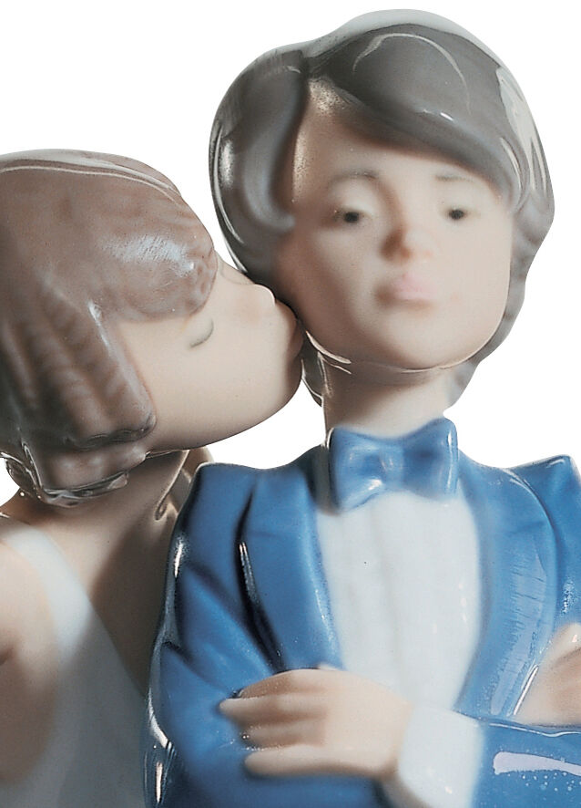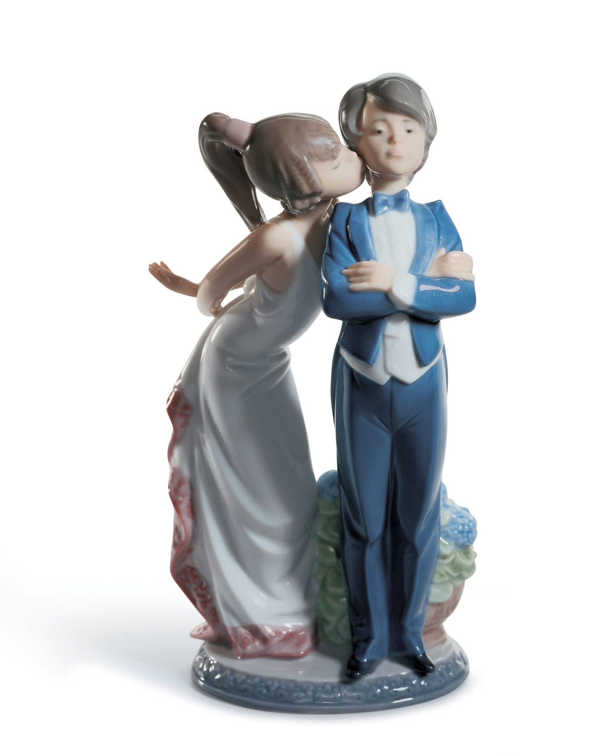 She wants a kiss and he resists her demand. The game of love takes its first steps in this charming young couple. A glossy porcelain piece, decorated in soft pastel colours, ideal as a gift, collectible or decoration.