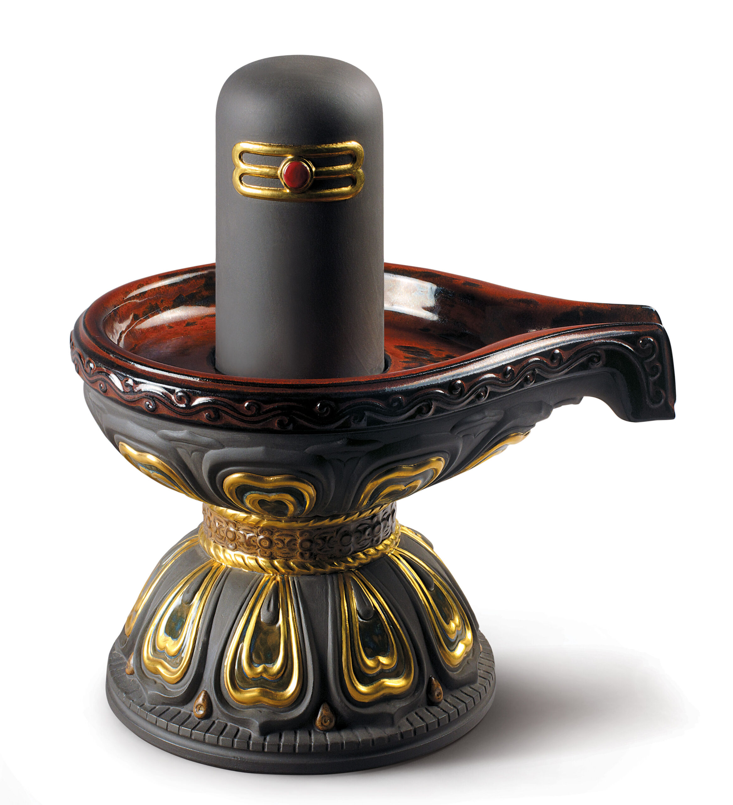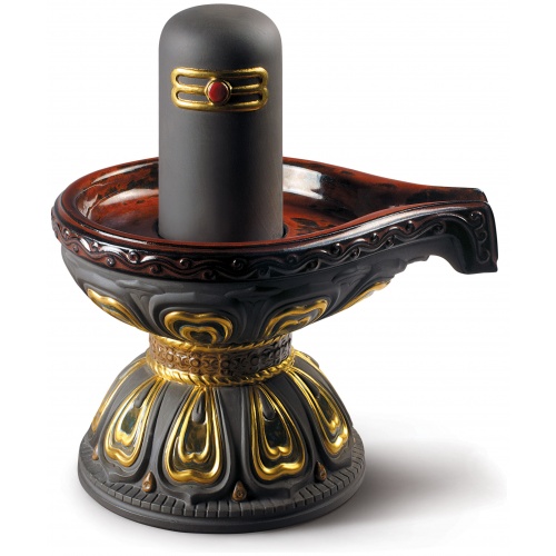 Lingam is a devotional porcelain piece used in the rituals of the god Shiva, which inspired the sculptor when she visited Varanasi and discovered the visual impact of Hindu ritual. The Shiva Lingam stone has been placed in the inner sanctum of every temple for more than two thousand years, worshipped as a standing stone which grew from the ground of its own volition, and supremely sacred. It represents the creative union that generates and sustains life in the Universe. It has a double function, to receive offerings and to collect the liquids used during the rituals. Finished in grey stoneware, with glazes and gold lustre decorating much of the object. A highly decorative piece. Made in Spain.