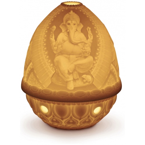 The magic of lithophany is born from the play of light with the translucent character of porcelain. By illuminating its interior, it projects warm lighting throughout the room and highlights the engraving that decorates it, producing surprising relief effects on its surface. This piece shows Lord Ganesha, the god of wisdom and knowledge. This deity, very popular in India, is represented here with all the attributes of traditional iconography, such as the gada (mace), the paasha (rope) and the broken tusk, elements whose symbolism is reflected in theavatars or traditional stories about Ganesha, well known by its numerous believers